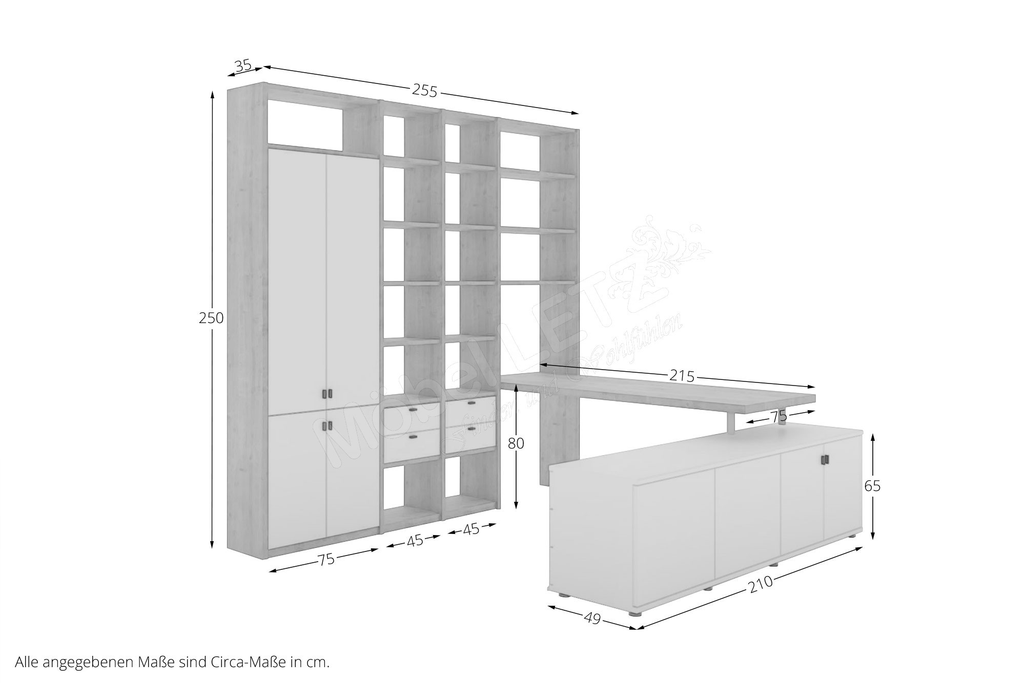 - Wohnbüro, Stellmaß ca.: 254,5 x 233,7 x 210,0 cm, T 35,0/48,7 cm, bestehend aus: