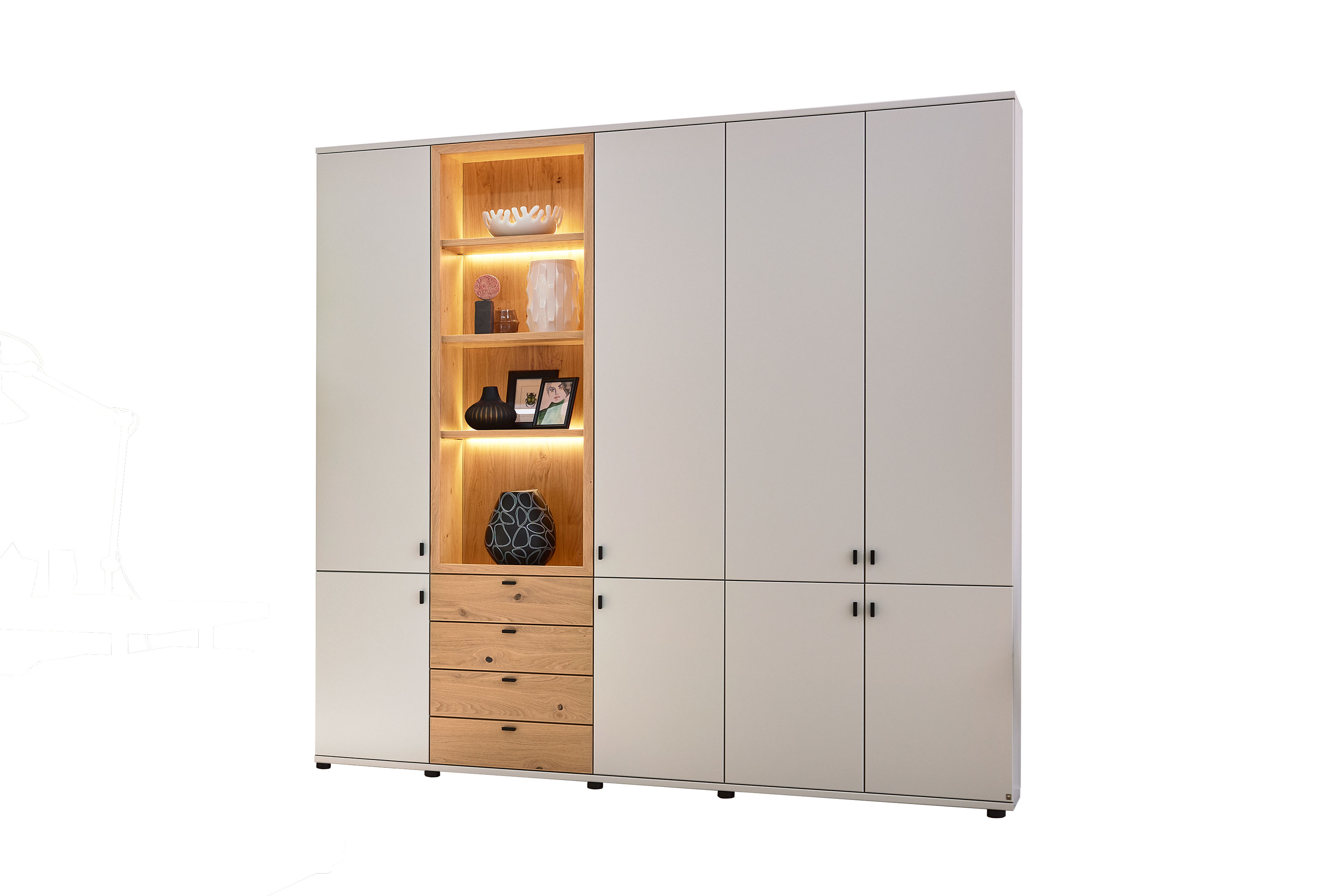 1 Regal mit 2 Türen, 4 Schubkästen und 16 offenen Fächern