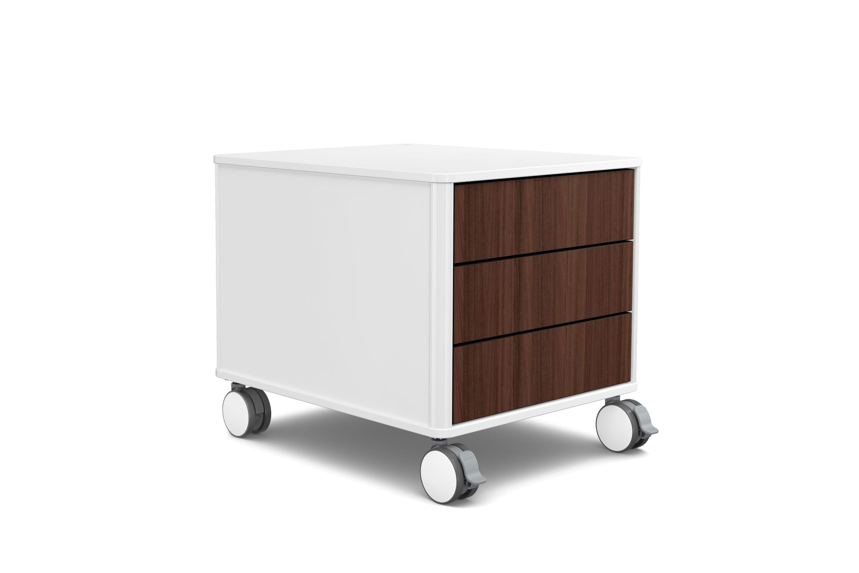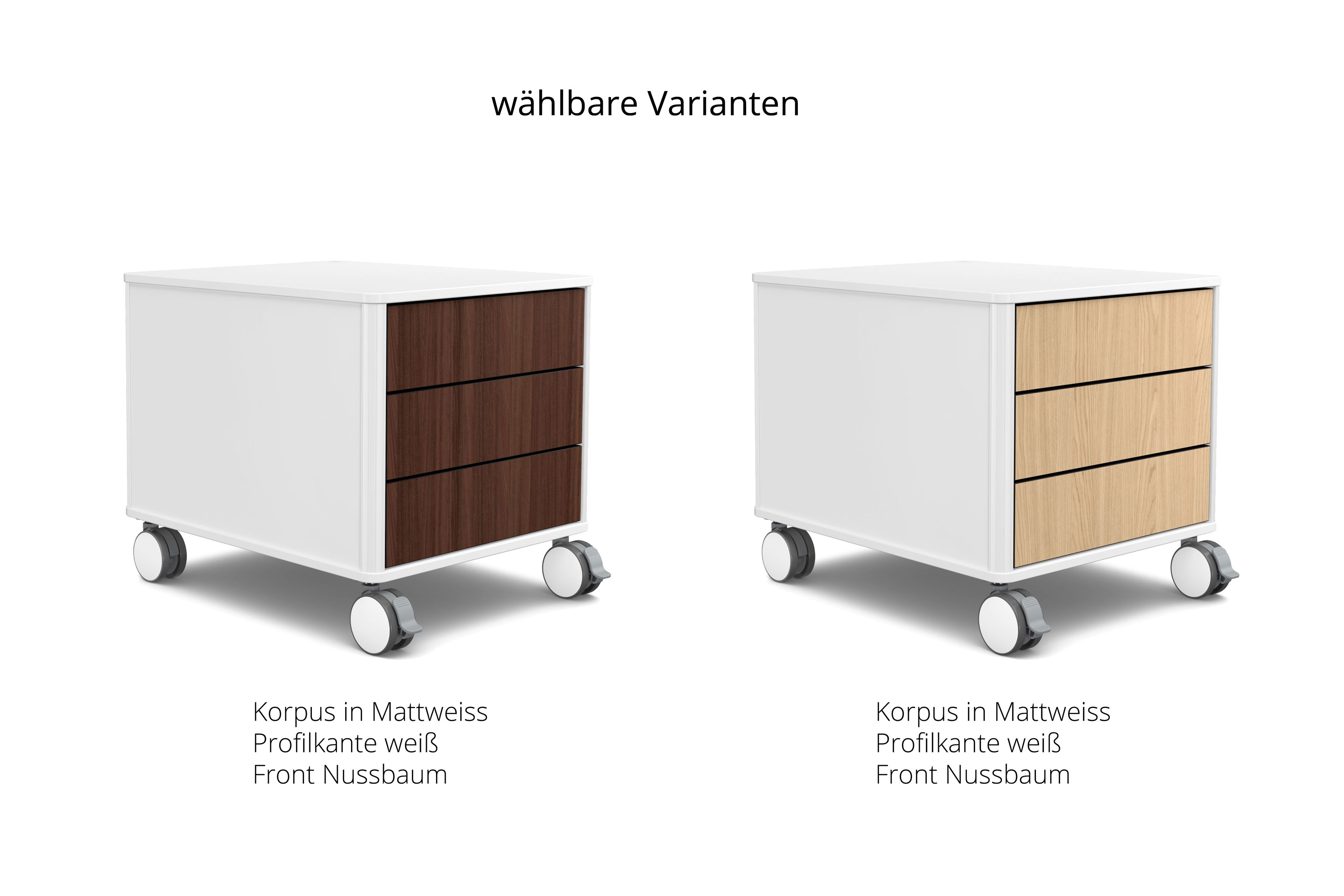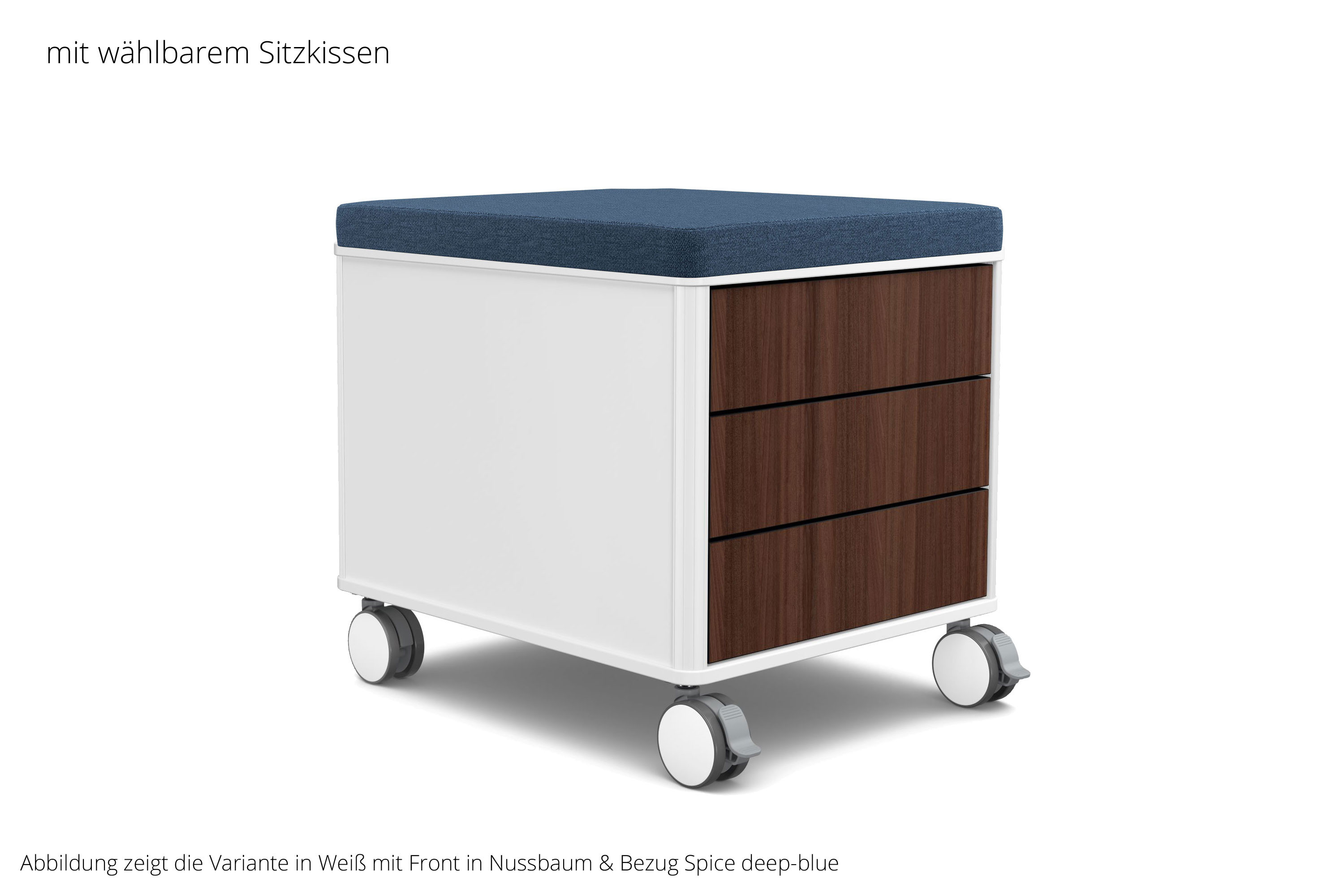 Der Rollcontainer C6 von moll Funktionsmöbel ist die perfekte Ergänzung für ein modernes, praktisches Büro. In Mattweiß zeigt sich der Korpus, der durch weiße Eckprofile verstärkt wird, während Sie sich, gemäß Ihrem Geschmack, zwischen einer Schubladenfront in Nussbaum oder Eiche entscheiden können. Der Rollcontainer kommt mit drei großen Schubkästen, die alle grifflos sind und über eine clevere Push-to-open-Mechanik verfügen. Das bedeutet, dass Sie die Schubladen mit einem leichten Druck öffnen, während der Selbsteinzug dafür sorgt, dass sich diese leise und sanft schließen. Alle Fächer verfügen über eine praktische Unterteilung, um Ihre Arbeitsutensilien ordentlich zu sortieren. Als besonderes Highlight können Sie für den moll Rollcontainer ein Sitzkissen optional mit buchen, welches in vielen verschiedenen Farben zur Auswahl steht. So können Sie sich eine bequeme Sitzmöglichkeit schaffen und dabei Ihre Schreibutensilien praktisch und platzsparend aufbewahren. Entdecken Sie jetzt die Vorteile des moll Rollcontainers C6 und richten Sie Ihr Büro, gern auch den Arbeitsplatz Ihres Kindes, perfekt ein!