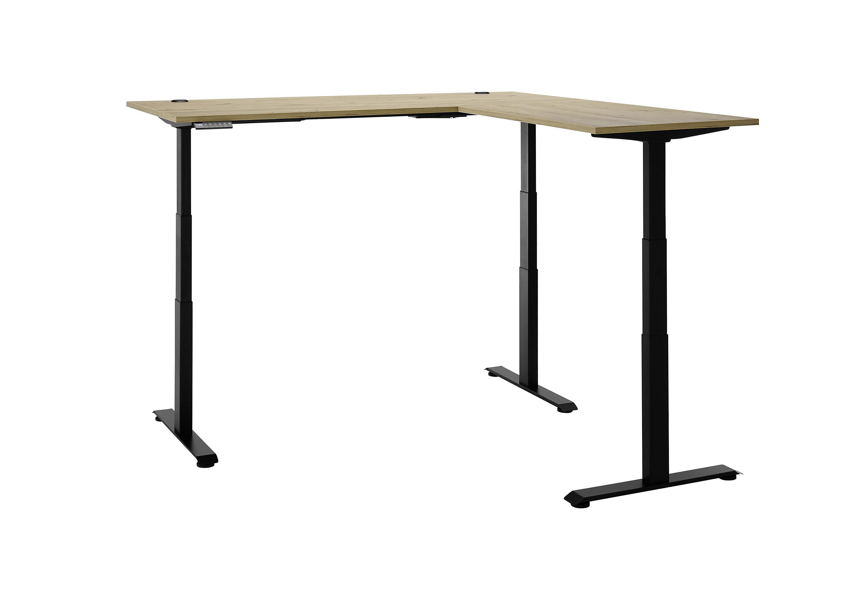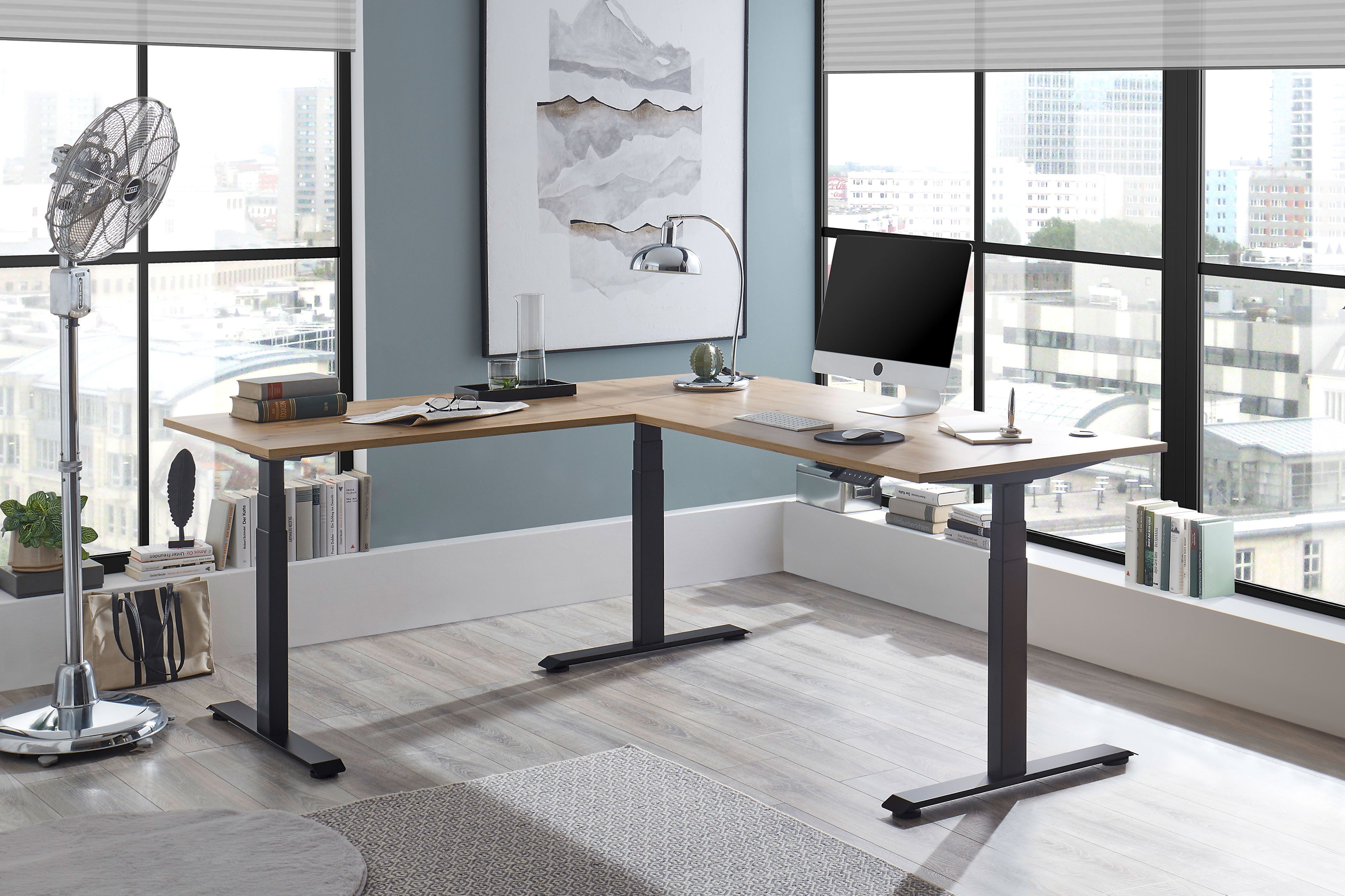 Erleben Sie, wie der Eckschreibtisch Ben-Office von Bega Consult Ihren Arbeitsalltag bereichert. In seiner Kombination aus zwei Tischplatten in ressourcenschonender Artisan Eiche Nachbildung mit einem schwarzen Gestell schafft der Solitär eine warme, professionelle Atmosphäre, ganz gleich, ob im Homeoffice oder im Büro. Flexibel die Position zwischen Sitzen und Stehen zu wechseln, ermöglicht das elektrisch höhenverstellbare Gestell. Das kann für mehr Bewegung im Arbeitsalltag, eine bessere Haltung sowie eine gesteigerte Produktivität sorgen. Die digitale Höhenanzeige mit 4-facher Memoryfunktion macht die Bedienung dabei angenehm einfach. Auf Knopfdruck können Sie Ihre bevorzugten Positionen individuell einstellen und abspeichern. Dank der großzügigen Arbeitsfläche bietet der Schreibtisch reichlich Platz für konzentriertes und kreatives Arbeiten, wobei Ihnen die integrierten Kabeldurchführungen ein sauberes Kabelmanagement erlaubt. Gestalten Sie Ihren Arbeitsplatz so, wie es für Ihr Handling am besten passt, denn sowohl die Tischplatten als auch das Bedienfeld lassen sich beim Bega Consult Bürotisch Ben-Office jeweils seitenverkehrt montieren.