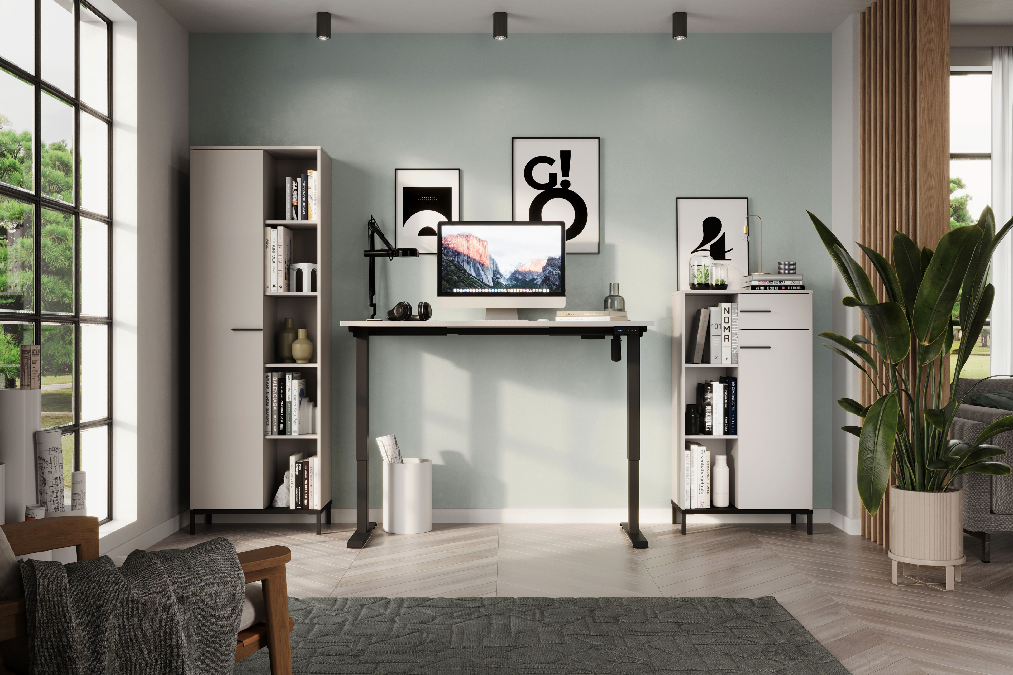 Machen Sie mit dem Modell GW-Rovigo mehr aus Ihrem Arbeitszimmer: In drei erhältlichen Tischgrößen und einem zeitlosen Design punktet der Germania Officetisch mit einem elektrisch verstellbaren Gestell, das sich optimal an Ihre persönliche Körpergröße anpasst. Mithilfe des Bedienelementes können Sie die Höhe von ca. 72 cm bis etwa 120 cm mühelos per Knopfdruck ändern. Die individuellen Einstellungen lassen sich mittels der Memory-Funktion abspeichern und jederzeit wieder abrufen. Für eine langlebige Qualität sorgt die melaminharzbeschichtete Oberfläche, sodass der Schreibtisch widerstandsfähig, kratzfest sowie pflegeleicht ist. Stauraum für alle wichtigen Dokumente und Arbeitsutensilien, die stets griffbereit sind, bieten die optional buchbaren Schränke in zwei Höhen. Dank der offene Ablagefächer, können Sie schnell auf Ordner oder Fachliteratur zugreifen. Hinter den leise schließenden Türen verbirgt sich weiterer Platz für Unterlagen, die außer Sichtweite untergebracht sein sollen. Der kleine Schrank hält zudem einen Schubkasten mit Selbsteinzug für Notizzettel und Stifte bereit, die schnell mal benötigt werden. Hinterlassen auch Sie in Ihrem Homeoffice oder Büro Eindruck – mit den Möbelstücken aus der Serie GW-Rovigo von Germania.