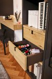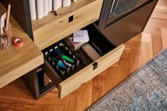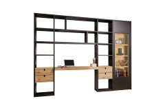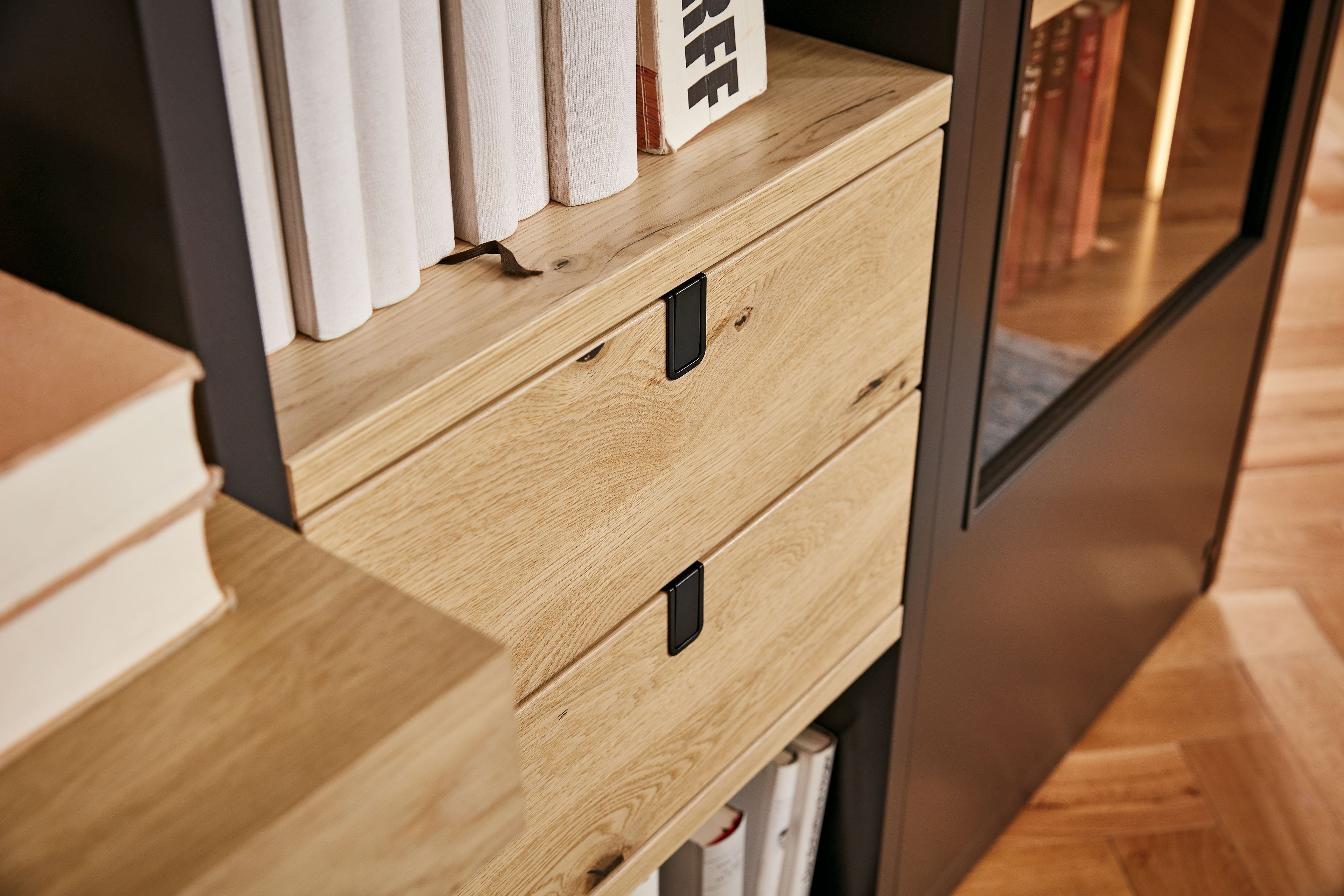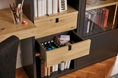 Die Büro- und Wohnwand Kara-System von Musterring besteht sowohl aus einem Regal- als auch einem Vitrinenelement, welches durch eine naturnahe Schreibtischplatte in furnierter Asteiche ergänzt wird. Der warme Akzent dieser, der sich auch in den Schubkästen und der Vitrinenrückwand widerspiegelt, bildet einen stilvollen Kontrast zur ansonsten graphitgrauen Gestaltung. Durch Bücher sowie dekorative Accessoires wirkt die Büroeinheit eher wie ein Wohnmöbel als ein klassischer Arbeitsplatz, sodass sich der Schreibtisch harmonisch in das Wohnzimmer einfügt. So vereint die Regalwand wohnliche Gemütlichkeit mit funktionalem Mehrwert, das sich positiv beim Arbeiten oder Lernen im Homeoffice auswirkt. Gestalten Sie über die Zusatzoptionen Ihr persönliches Möbelstück ganz nach Ihren Vorstellungen, indem Sie die Farbgestaltung passend zu Ihrem bestehenden Interieur wählen. Ergänzen Sie das Musterring Wohnbüro Kara-System optional mit einer passenden Beleuchtung – und dem produktiven Arbeiten in den eigenen vier Wänden steht nichts mehr im Weg.