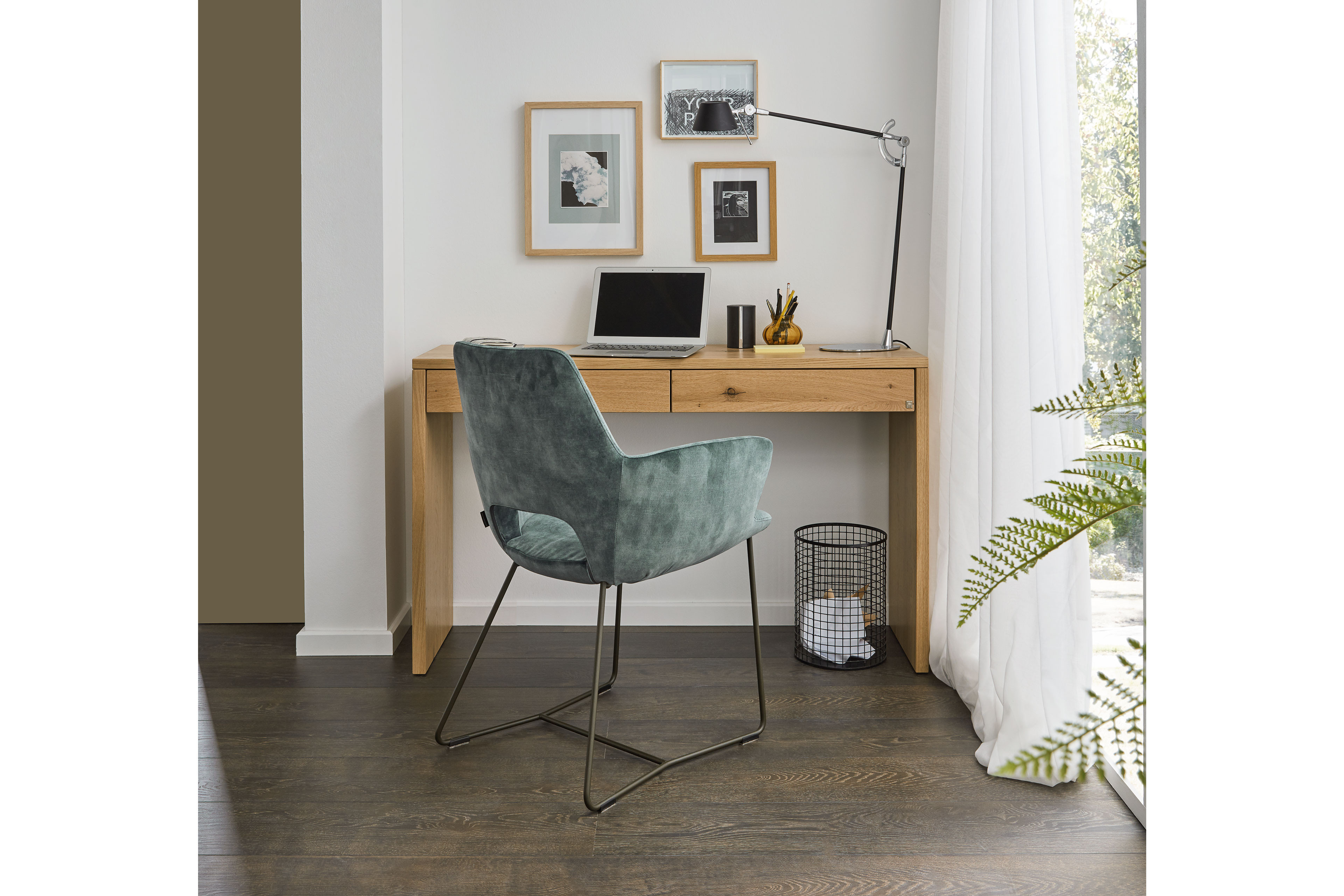 Aus natürlichen Materialien gefertigt, lässt sich der Konsolen-Schreibtisch aus der Musterring Modellreihe Kira-System dank seiner geringen Größe sowie seiner harmonischen Leichtigkeit ohne viel Aufwand spielend leicht zu Hause integrieren. Einfach im Wohnraum platziert oder in die Büroraumgestaltung eingebracht, sorgt der Solitär für ein unvergleichliches Ambiente und schmückt als besonderer Hingucker jeden Wohnbereich. Dank des verwendeten Echtholzfurnieres der Asteiche begeistert der moderne Schreibtisch mit seiner edlen Optik und verleiht jedem Raum eine stilvolle, natürliche Atmosphäre. Die Holzausführung können Sie gern nach Ihren Wünschen aussuchen und an Ihre Raumgestaltung anpassen. Neben dieser haben Sie auch die Wahl aus verschiedenen Lackausführungen. Für kleinere Utensilien bieten die zwei integrierten Schubladen zusätzlichen, praktischen Stauraum. Stifte, Notizbuch, Terminkalender lassen sich hier bei Bedarf schnell unterbringen und genauso schnell wieder herbeizaubern. Ob im Wohnzimmer, im Flur oder im eigenen Arbeitszimmer untergebracht, der kleine Musterring Home-Office-Tisch Kira-System ist ein gelungenes Beispiel, dass stilvolles Wohnen mit Arbeiten Hand in Hand gehen kann.