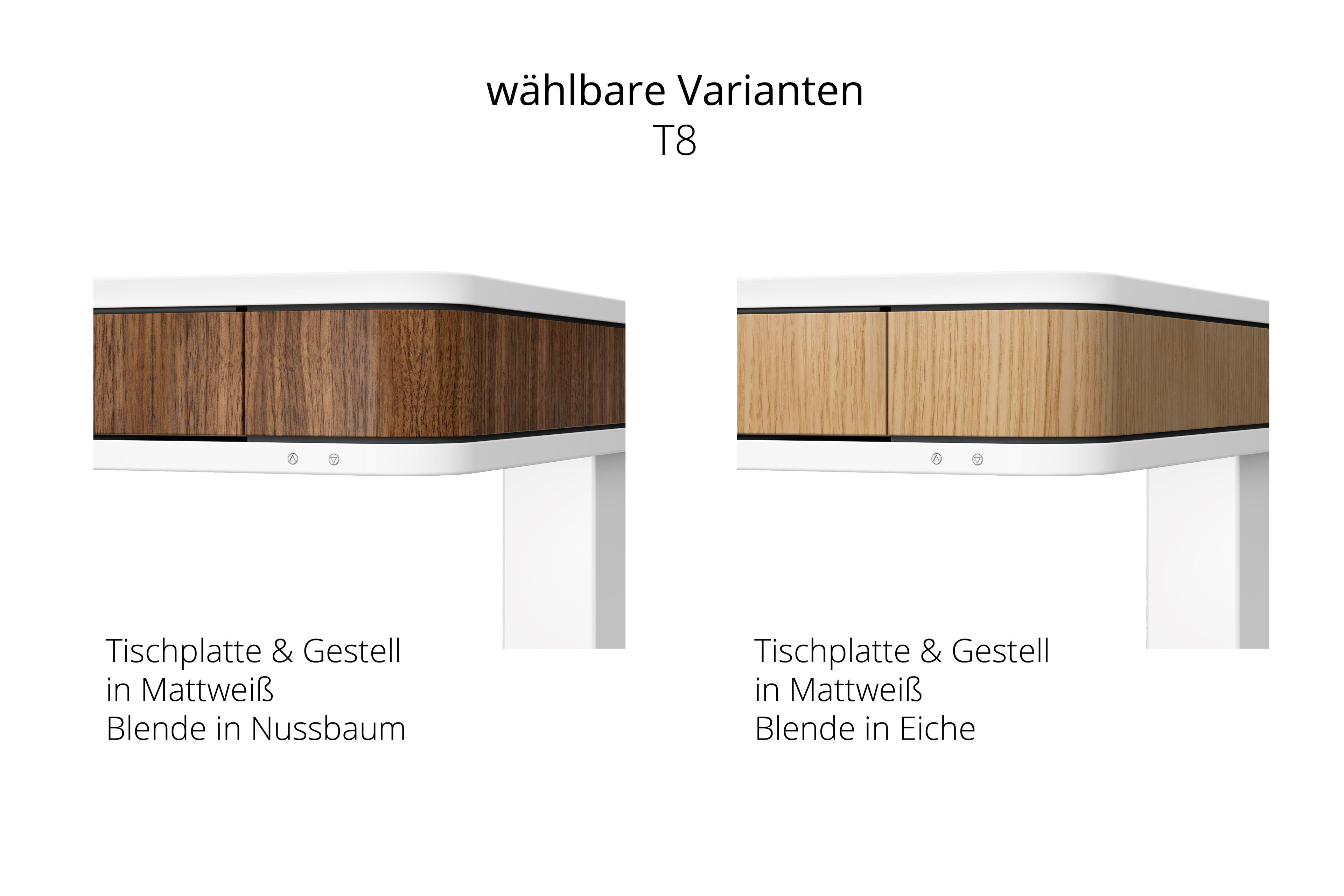 Ob als Schreibtisch im Büro oder Homeoffice, für die Hausaufgaben der Kids, für gemeinsame Spieleabende, als Ess- oder Couchtisch, als Kreativ- und Konferenztisch – der Tisch T8 aus dem Hause moll Funktionsmöbel ist in jedem Raum, für jeden Zweck und für jede Altersklasse bestimmt. Seine ausdruckstarke Persönlichkeit verdankt der moll Schreibtisch den makellos verarbeiteten und hochwertigen Materialien. Mit den wählbaren Blenden in Nussbaum oder Eiche lässt sich Ihr persönliches Einrichtungsempfinden gekonnt unterstreichen und sich das passende Möbelstück für jeden Stil finden. Bei diesen großartigen Eigenschaften sollte das Meisterstück aus der Möbelmanufaktur immer aufgeräumt sein. Zwei praktische Großraumschubladen sorgen dafür: Die vordere wartet mit zwei großen und zwei kleineren Fächern auf, während die hintere reichlich Platz für Kabel und Netzteile bietet. Zudem versteckt sich hier gekonnt eine Steckdosenleiste mit sechs Anschlüssen. Frei im Raum aufgestellt, kommen Sie so an alle untergebrachten Utensilien bequem ran. Nutzen nun auch Sie die Vorzüge, die Ihnen der Schreibtisch T8 von moll Funktionsmöbel bietet und lassen ihn sich bequem und komplett aufgebaut liefern.