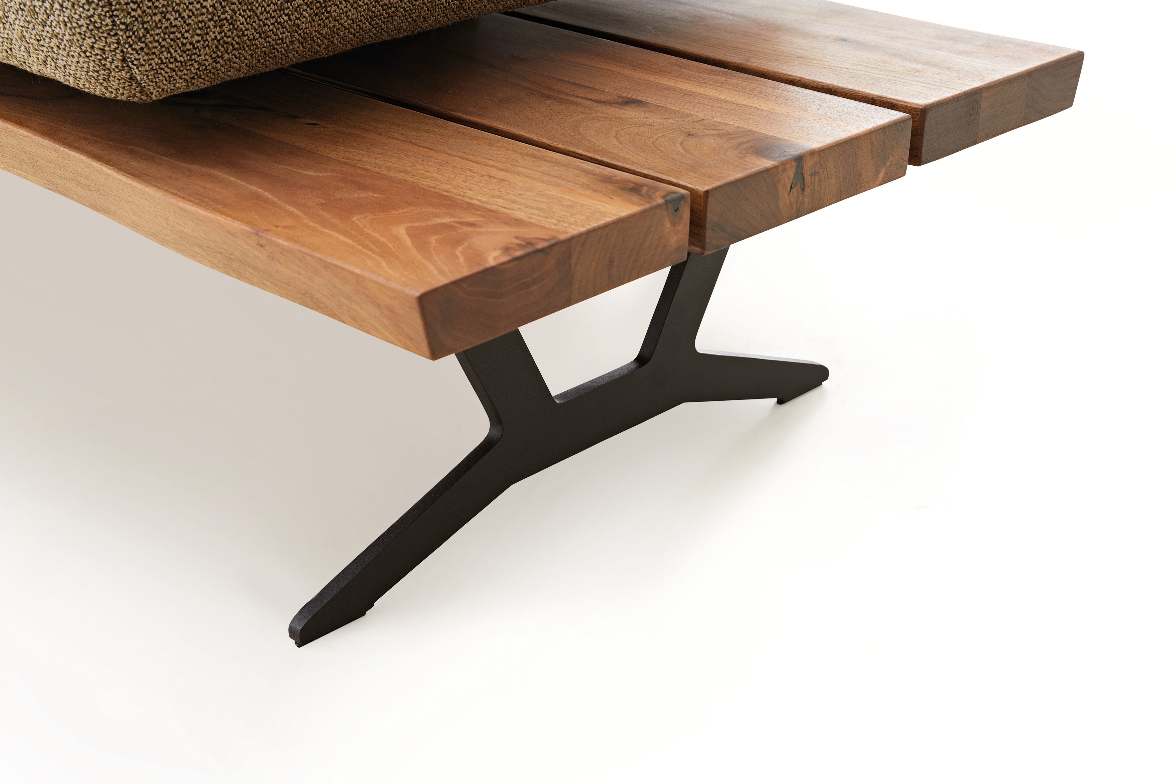 Das Funktionswunder mit dem schönen Namen Merlin, stammend aus dem Qualitätshaus KOINOR Polstermöbel, wird den Komfort in Ihrem Speisebereich auf eine ganz neue Ebene bringen. Beide Sitzelemente des Möbels werden von einer hochwertigen Kombination aus Echtleder und Flachgewebe umhüllt und können überdies unabhängig voneinander auf dem Plateau nach links und rechts verschoben werden, sodass Sie stets eine bequeme Haltung bei Tisch finden. Das etwa 190 cm breite und aus wunderschönem Nussbaumholz gearbeitete Plateau beeindruckt sowohl mit natürlichen Maserungen als auch mit einem ästhetischen Baumkantenprofil. Verantwortlich für die hohe Stabilität der Bank zeigen sich zwei filigrane Schwertkufen in satiniertem Nickel, welche dem Möbelstück trotz seiner Größe, einen mit Leichtigkeit erfüllten Charme verleihen. Um zu garantieren, dass Sie die KOINOR Bank Merlin ganz Ihrem Geschmack entsprechend platzieren können, erhalten Sie in unseren Zusatzoptionen individuelle Anpassungsmöglichkeiten hinsichtlich des Äußeren. So können Sie als Alternative zu dem Nussbaumholzplateau, eines in stilvoller Wildeiche oder in geschmackvoller Kernbuche wählen, die Gewänder der Sitzelemente in puncto Farbe sowie Material daran anpassen und optional ein Funktionskopfteil ergänzen, um den Gemütlichkeitsfaktor des Funktionsmöbels zu steigern. Lassen Sie Ihrem guten Geschmack also einfach freien Lauf und freuen Sie sich auf ein perfekt auf Ihren Stil abgestimmtes Sitzmöbel, an welchem Sie über lange Zeit große Freude haben werden.