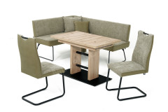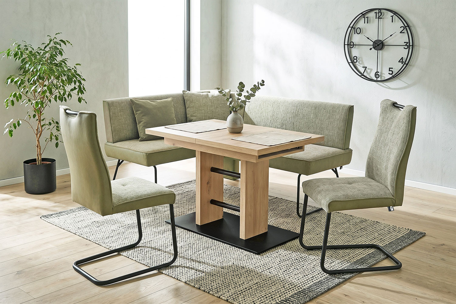 Die Eckbankgruppe Game Plus von K+W repräsentiert eine exquisite Einheit, die sowohl Ästhetik als auch Design in vollendeter Harmonie vereint. Dieses meisterhaft gestaltete Ensemble erstrahlt in einem eleganten Konzept und verkörpert den zeitlosen Stil, für den K+W weithin bekannt ist. Die elegante Eckbank, ein wahres Meisterwerk der Polsterkunst, bietet nicht nur unvergleichlichen Komfort, sondern auch eine einladende Atmosphäre, die jedes Esszimmer in einen Ort der Geselligkeit verwandelt. Hochwertige Materialien, sorgfältig ausgewählt und kunstvoll verarbeitet, verleihen der Eckbankgruppe eine natürliche Eleganz. Die Polsterung, gefertigt aus edelsten Stoffen, lädt zum Verweilen ein und sorgt für ein unvergleichliches Sitzgefühl. Jede Naht, jede Kurve ist mit höchster Präzision ausgeführt, was die Liebe zum Detail und das handwerkliche Können des Herstellers unterstreicht. Der geschmackvolle Esstisch, der die Eckbank harmonisch ergänzt, strahlt eine subtile Raffinesse aus. Mit seiner klaren Linienführung und einer Oberfläche, die das Licht auf kunstvolle Weise reflektiert, wird er zum zentralen Element jedes Essraums. Ob für festliche Anlässe oder alltägliche Mahlzeiten, dieser Tisch bietet ausreichend Platz und lädt dazu ein, gemeinsame Stunden in stilvollem Ambiente zu verbringen. Die zwei harmonisch abgestimmten Stühle runden das Ensemble perfekt ab. Sie vereinen Komfort und Stil in einer Weise, die sowohl das Auge erfreut als auch den Sitzenden umschmeichelt. Die geschwungenen Rückenlehnen und die ergonomische Form verleihen den Stühlen eine einladende Note. Insgesamt verkörpert die K+W Eckbankgruppe ein Lebensgefühl, das durch Qualität, Stil und zeitlose Schönheit geprägt ist. Sie ist nicht nur ein Möbelstück, sondern ein Statement, das den individuellen Charakter eines jeden Zuhauses unterstreicht. Ein Platz, an dem Erinnerungen geschaffen werden, und wo der Genuss des Essens und der Geselligkeit in vollendeter Form zelebriert wird.