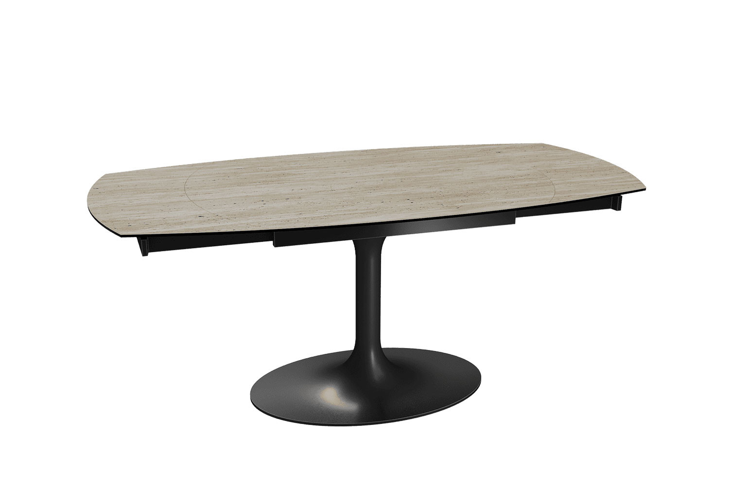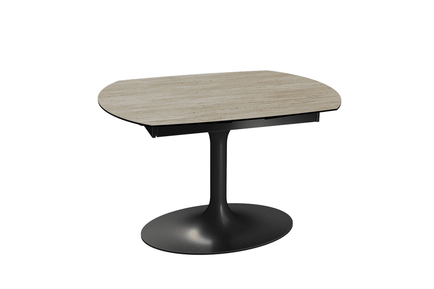 Der Akante Esstisch Corcovado zieht die Blicke auf sich, noch bevor man Platz nimmt, und verleiht jedem Raum eine Aura von kultivierter Raffinesse. Seine Formensprache wirkt wie ein leises Statement für anspruchsvolles Design, das sich nicht aufdrängt, sondern durch seine feine Ausarbeitung überzeugt. Die edle Keramikplatte in Travertin entfaltet ein faszinierendes Spiel aus filigranen Maserungen, das an erlesenen Naturstein erinnert und eine luxuriöse Atmosphäre entstehen lässt. Sein Maß von circa 120 x 90 cm bietet eine harmonische Fläche für den Alltag, während sich seine wahre Raffinesse in der integrierten Auszugsfunktion offenbart. Mit wenigen Handgriffen erweitert sich die Platte auf großzügige, etwa 180 cm und schafft Raum für gesellige Abende, festliche Anlässe und unvergessliche Begegnungen. Das zentral positionierte Gestell aus mattschwarz lackiertem Stahl unterstreicht die elegante Erscheinung mit seiner ruhigen, kraftvollen Formensprache. Es verleiht dem Tisch Stabilität und zugleich eine nahezu schwebende Leichtigkeit. Der Tisch Corcovado ist darüber hinaus in weiteren Keramikvarianten erhältlich und passt sich so anspruchsvollen Wohnkonzepten mit müheloser Selbstverständlichkeit an. In seiner Gesamtheit verkörpert er eine außergewöhnliche Verbindung aus Ästhetik, Funktion und sinnlicher Ausstrahlung.