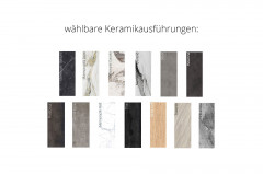 - Tischplatte: Keramik Travertin, ca. 3 mm stark auf einer ca. 8 mm starken Glasplatte aufliegend