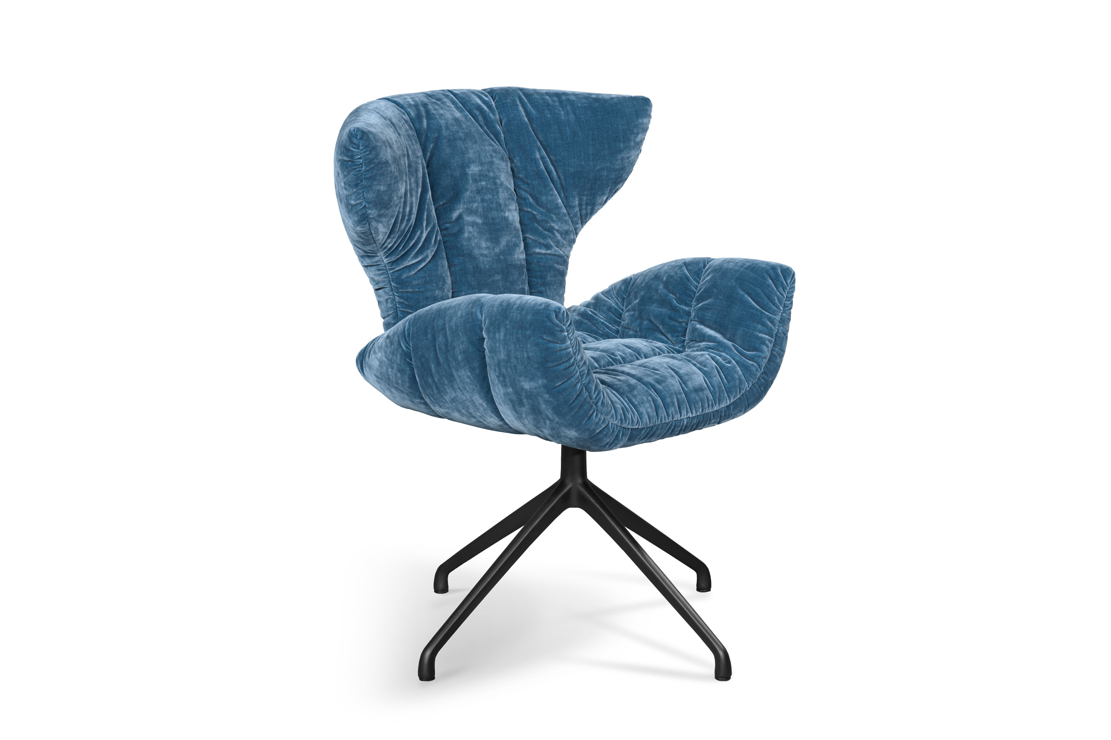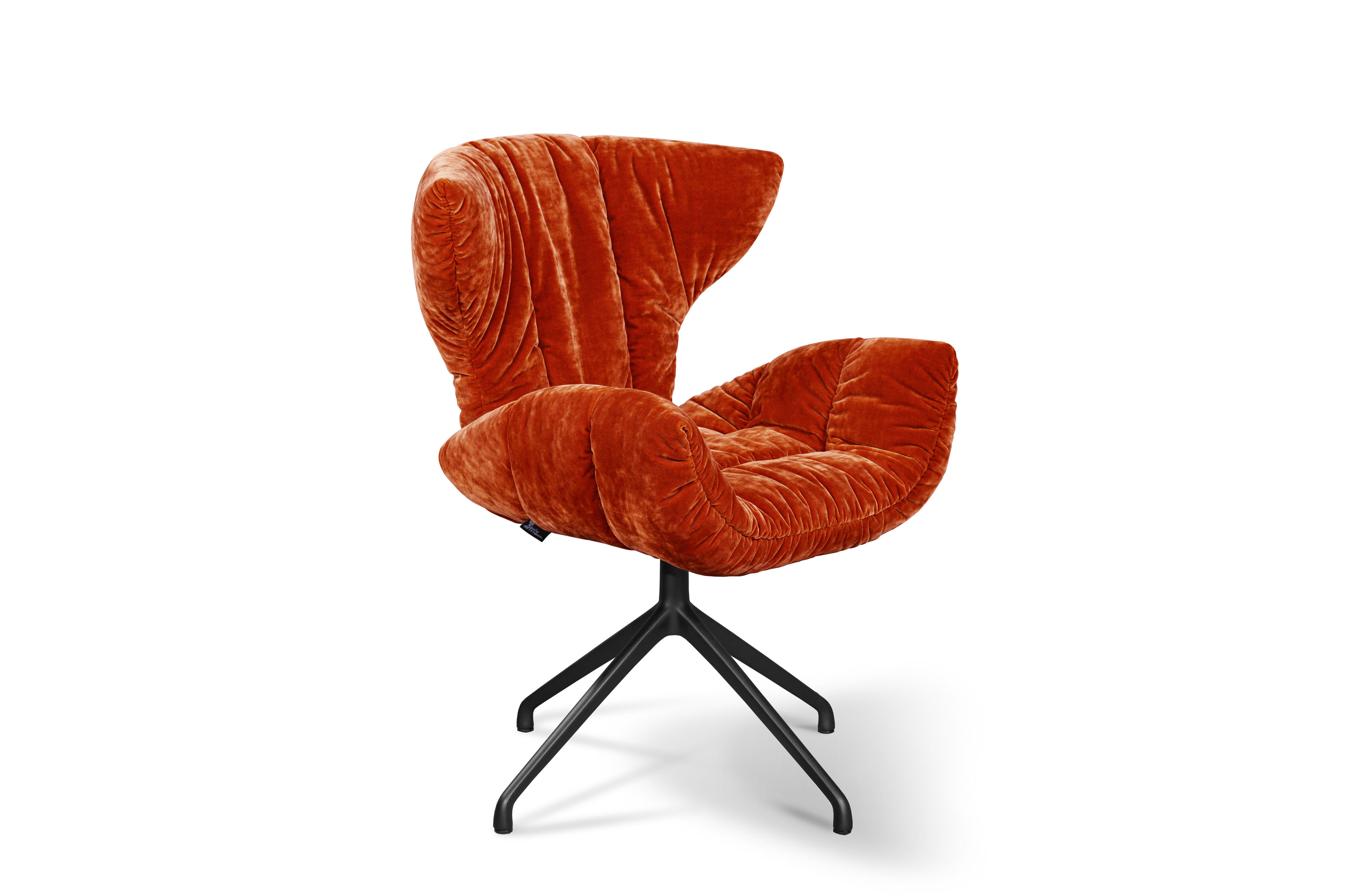 Sitz/ Rücken: Formholz-Gestell, fester Sitzkomfort mit starker Faltenbildung und florale, abstrahierte Blütenkelch-Form mit linearen Einzügen