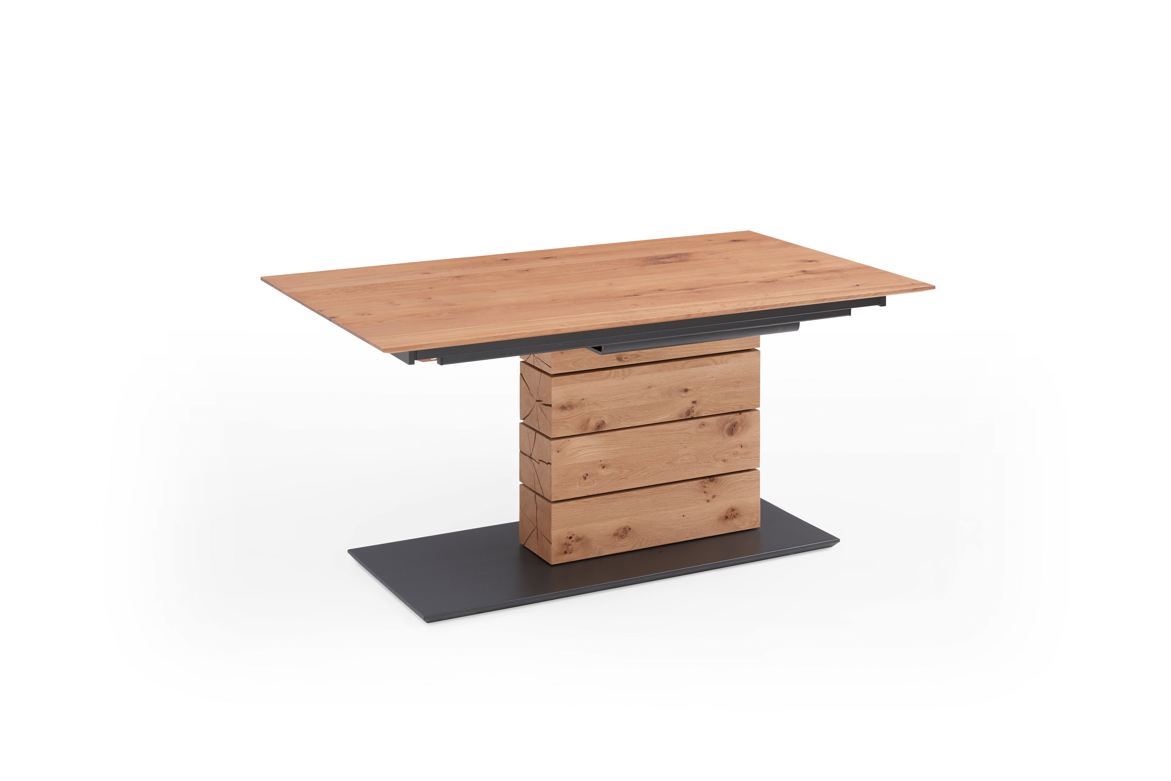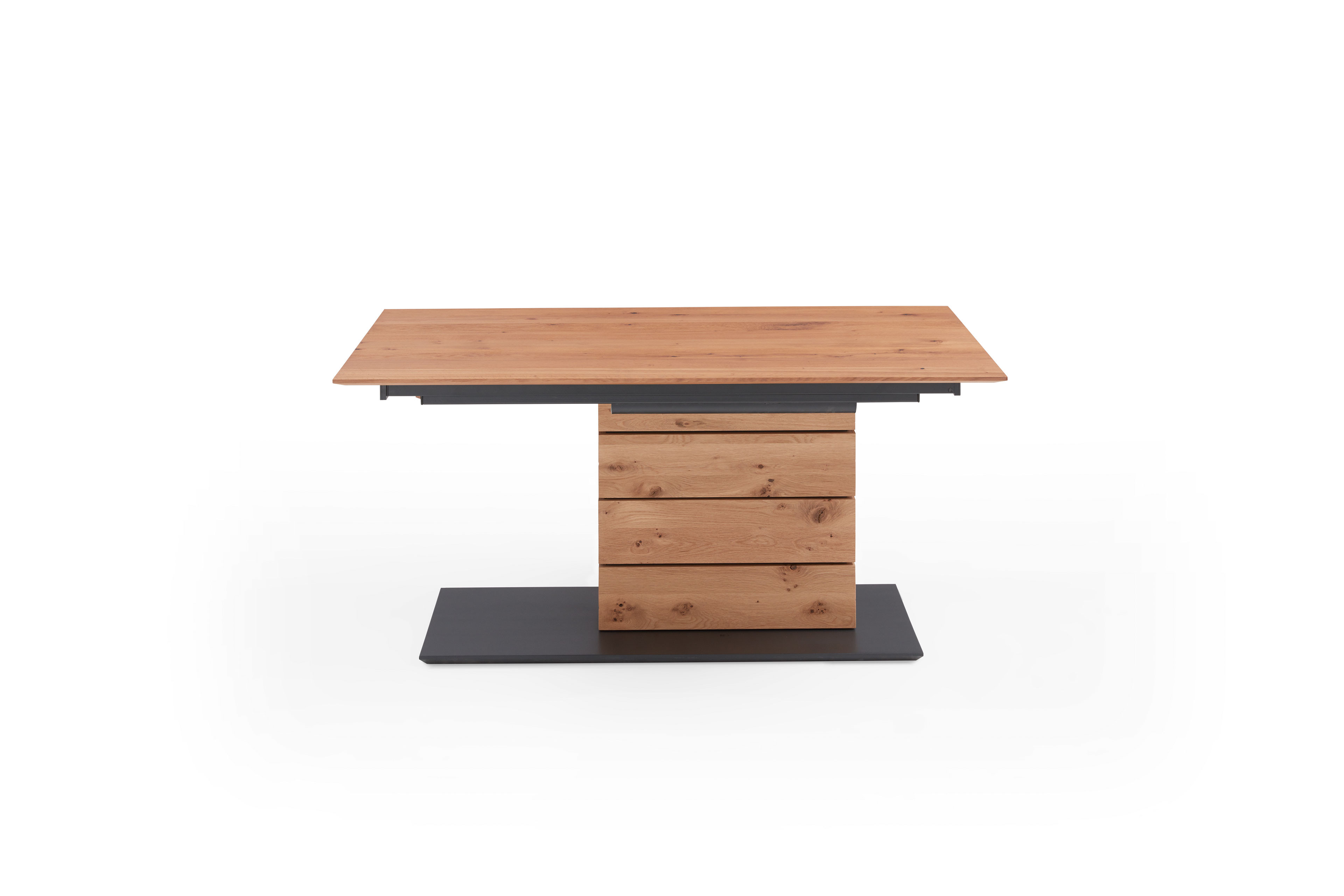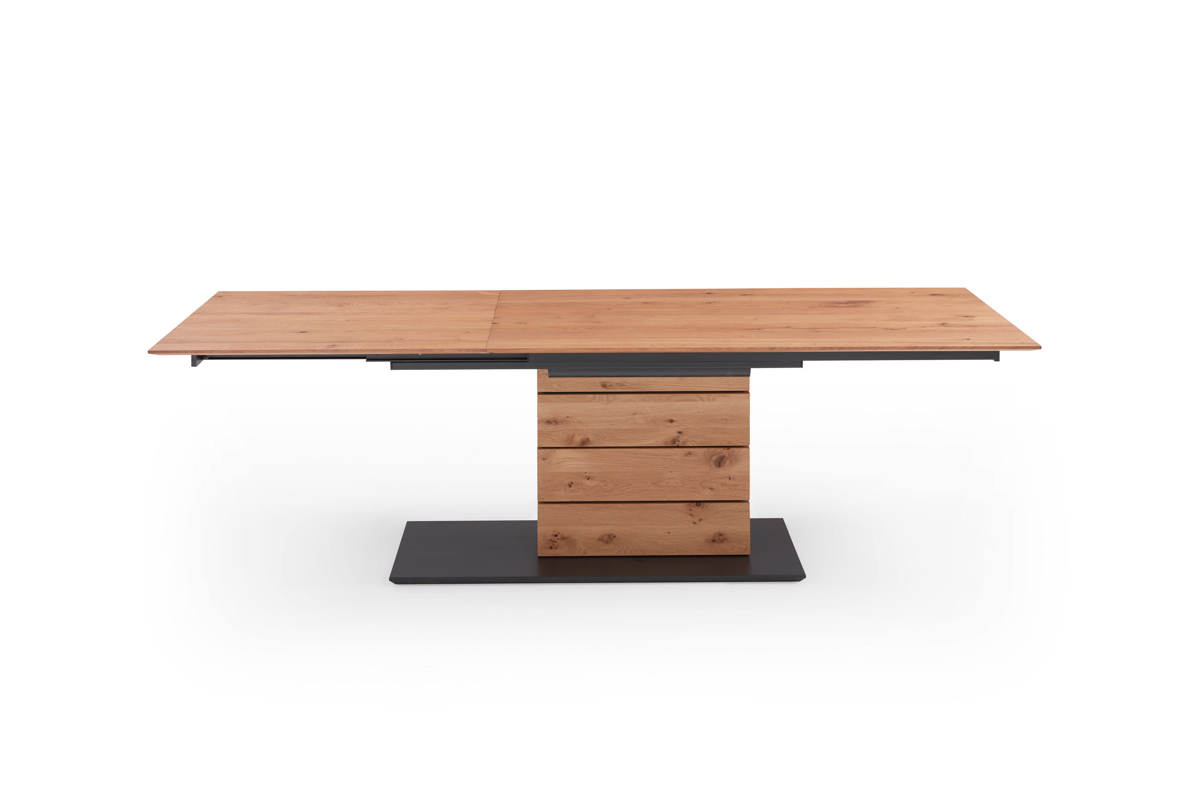 Der klassische, daher kommende Esstisch Caya aus dem Hause Hartmann präsentiert sich im natürlichen Design und überzeugt mit seiner praktischen Auszugsfunktion. Die etwa 16 mm starke Tischplatte ist aus dem massiven Holz der Kerneiche gefertigt und besitzt eine elegante Schweizer Kante. Dank seines Tischplattenmaßes von ungefähr 160 x 95 cm und dem integrierten Pöttker-Kopfauszug können bis zu zehn Personen an diesem Schmuckstück Platz nehmen und gemütlich mit Ihnen zu Abend essen. Ein absolutes Highlight ist das Säulengestell, dieses zeigt vier Hirnholzblöcke, welche auf Wunsch mit einer indirekten LED-Beleuchtung versehen werden können. Für den nötigen Stand sorgt die anthrazitfarbene Holzbodenplatte, die dem Modell eine exzellente Ausstrahlung verleiht. Richten auch Sie Ihre Wohnräume im traumhaften natürlichen Stil ein mit dem Hartmann Esstisch Caya und genießen Sie schon bald das unvergleichbare Ambiente.