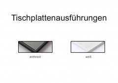 - Platte: Glas (ca. 6 mm stark) verklebt auf MDF (ca. 22 mm stark), Glasplattenunterseite weiß lackiert, Schweizer Kante
