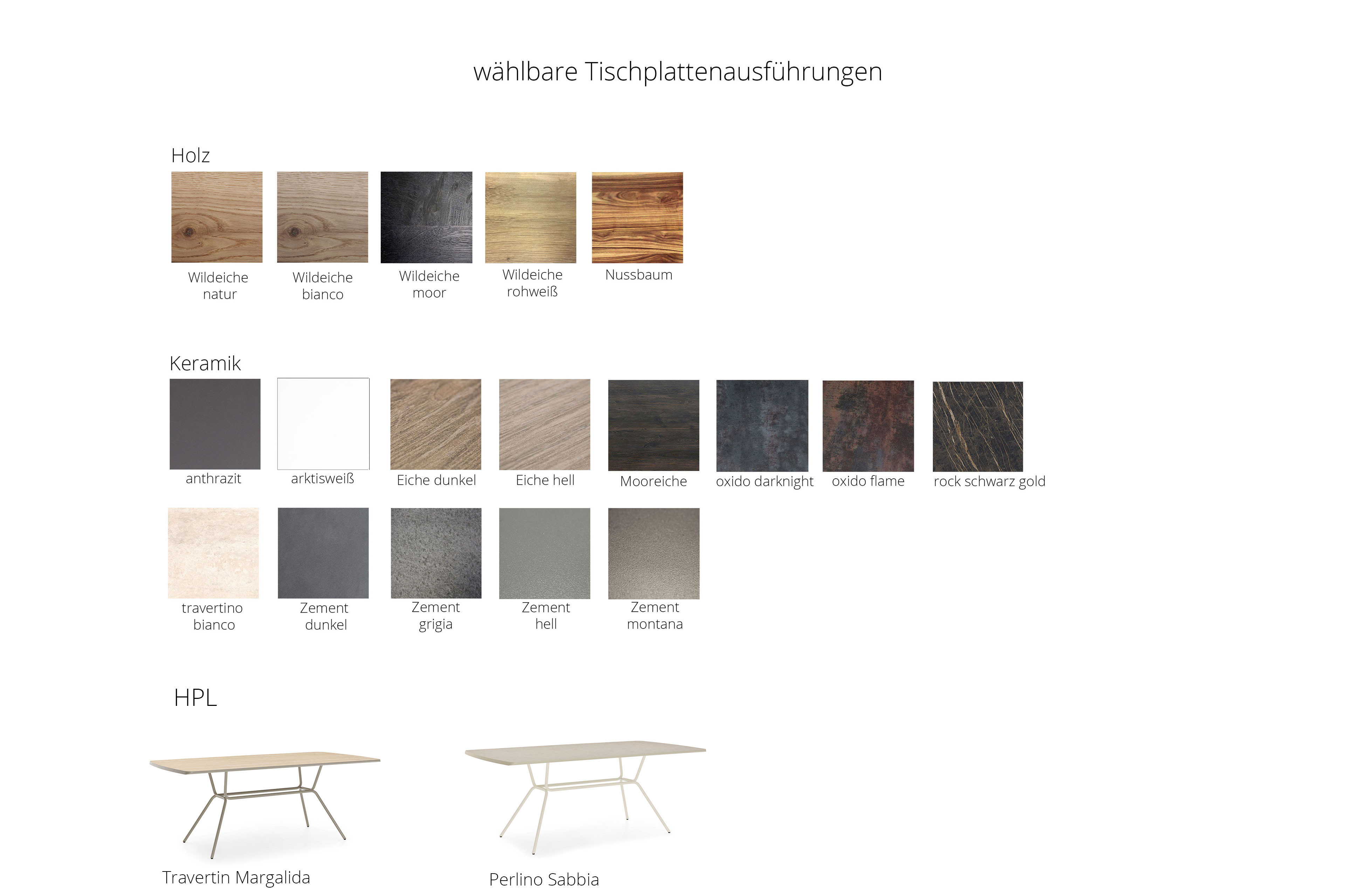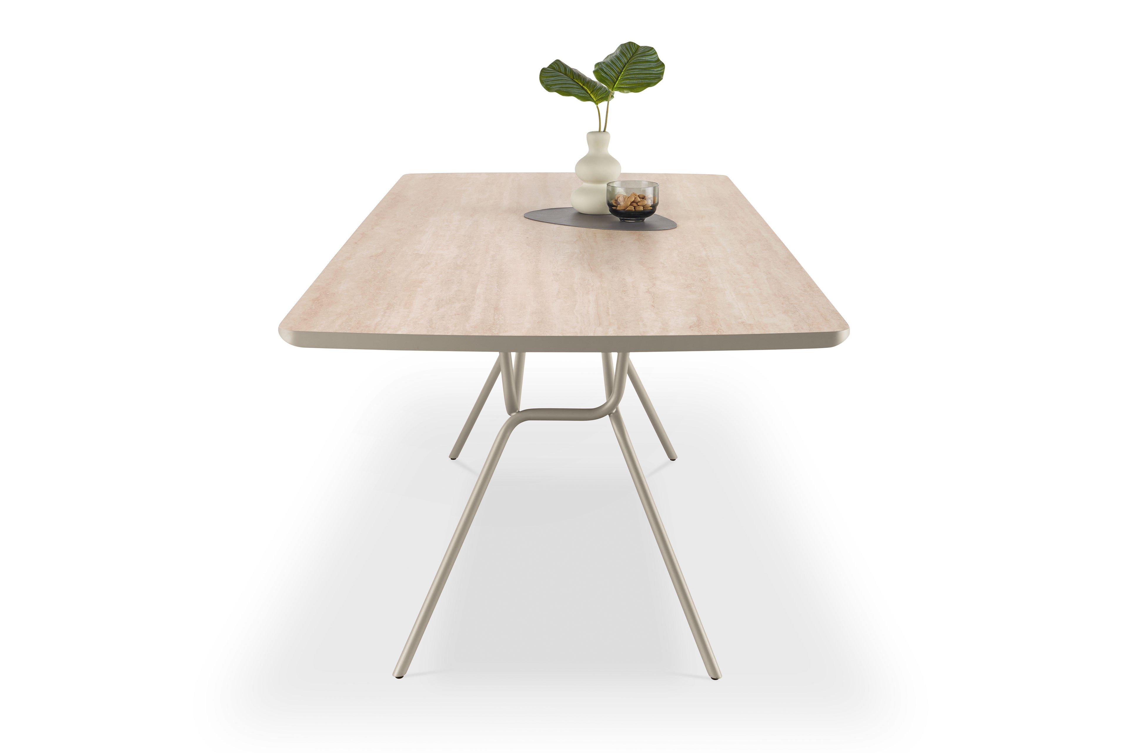 - Tischplatte: HPL auf MDF, Travertino Margalida, rechteckig, Stirnseiten leicht gerundet, Kantenausführung Freiform, ca. 28 mm stark