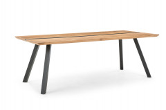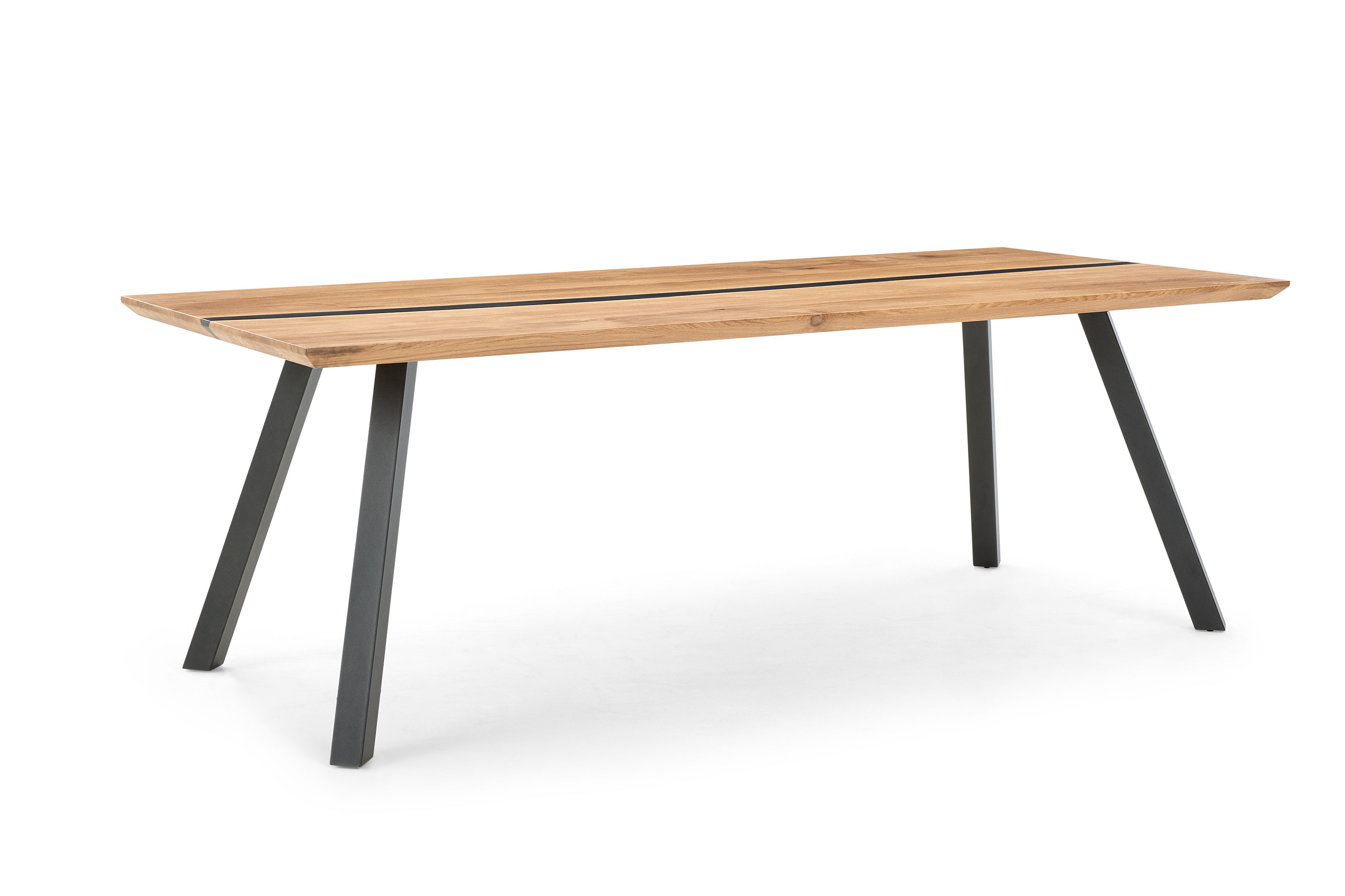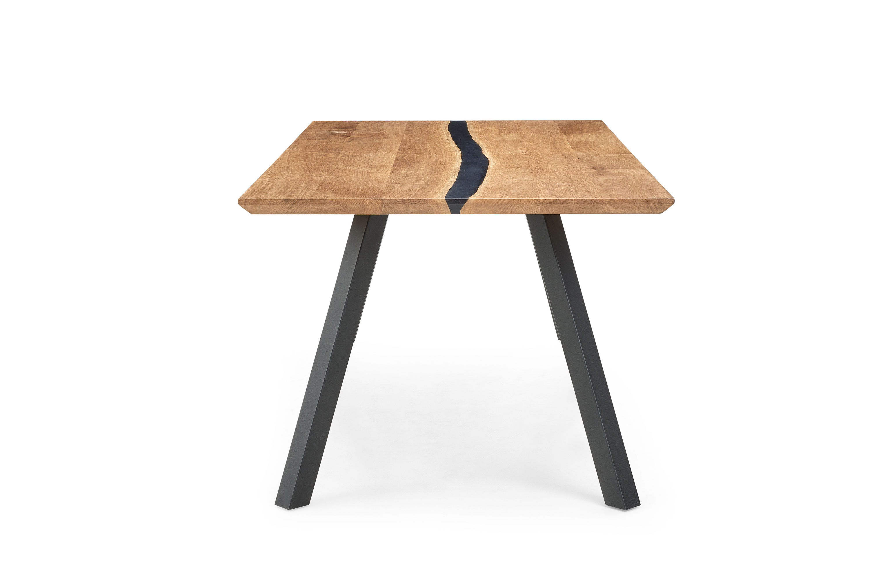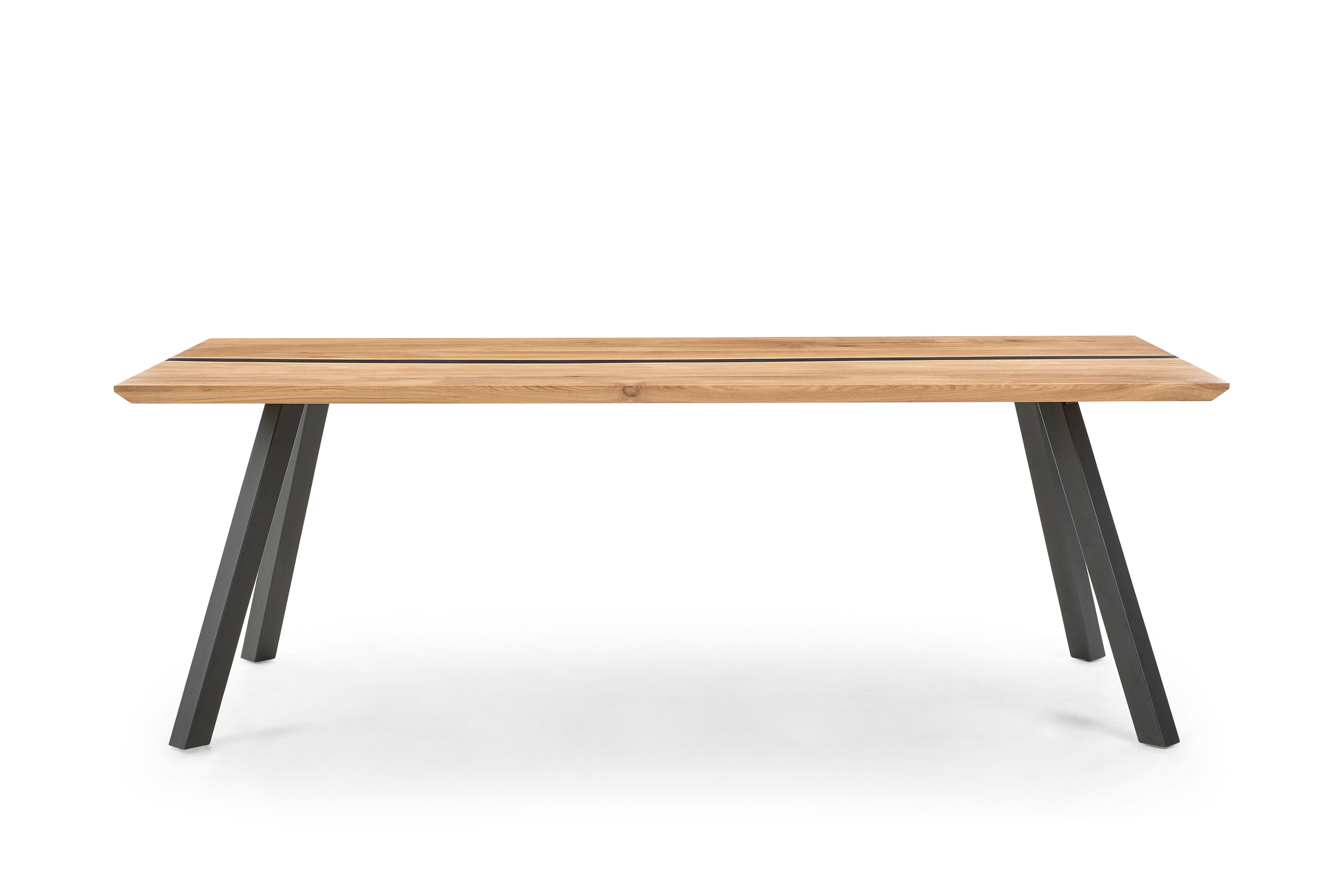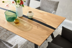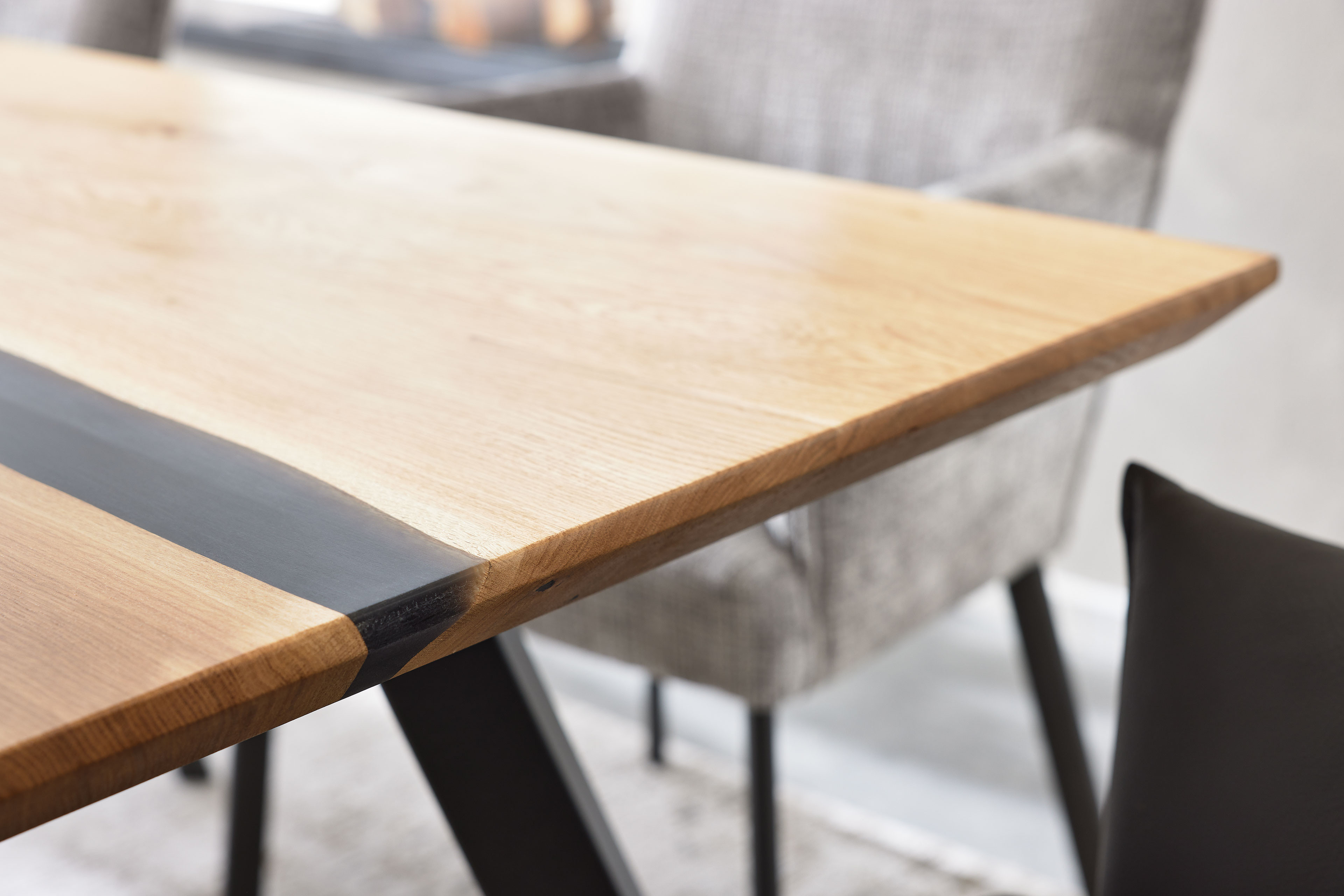 - Tischplatte: Wildeiche, massiv, geölt, Außenseite mit schweizer Kante, Innenseite echte Baumkante, Epoxidharzfüllung mittig in anthrazit, ca. 4 cm stark