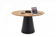 - Tischplatte: rund, Eiche massiv, seidenmatt lackiert, mit Facettenprofil, ca. 30 mm stark