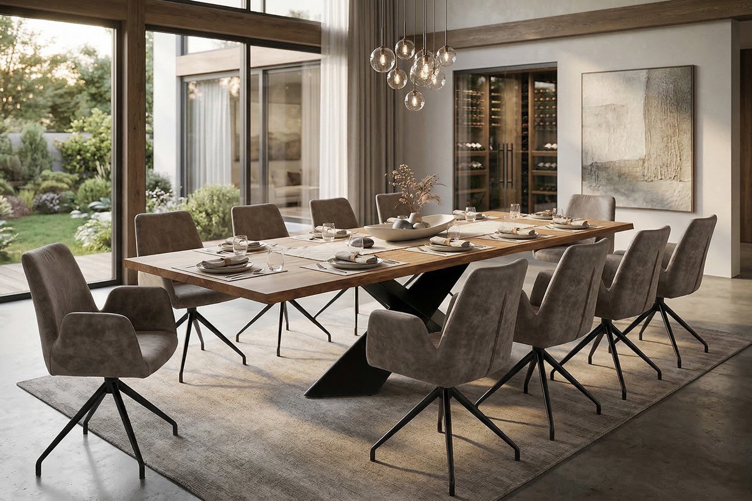 Der Nouvion Esstisch Alcedo vereint elegante Ästhetik mit funktionaler Raumausnutzung und lässt Ihr Esszimmer in neuem Glanz erstrahlen. Der Esstisch besticht durch seine Platte aus hochwertiger, geölter Brauneiche, welche eine warmes und einladendes Wohnflair schafft. Das markante Stahlgestell, welches als stabile Basis dient, verleiht dem Tisch zugleich einen urigen Charme und sorgt für ausreichend Beinfreiheit für alle Sitzenden. Dank des großzügigen Maßes von etwa 300 x 100 cm erlaubt das Möbel, gemütliche Familiendinner oder festliche Feierlichkeiten auszurichten - an diesem Tisch finden alle bequem Platz. Das Zusammenspiel von Holz und Stahl verleiht dem Tisch eine moderne Note und macht ihn zu einem einzigartigen Blickfang in Ihrem Esszimmer. Der Esstisch Alcedo - anmutig, üppig und mit viel Platz - ist die perfekte Wahl für alle, die Wert auf hochwertige Materialien, stilvolles Design und Funktionalität legen. Egal ob in einer modernen oder klassischen Einrichtung, dieser Tisch wird Ihren Raum auf elegante Weise ergänzen und zum Mittelpunkt Ihrer geselligen Zusammenkünfte werden.
