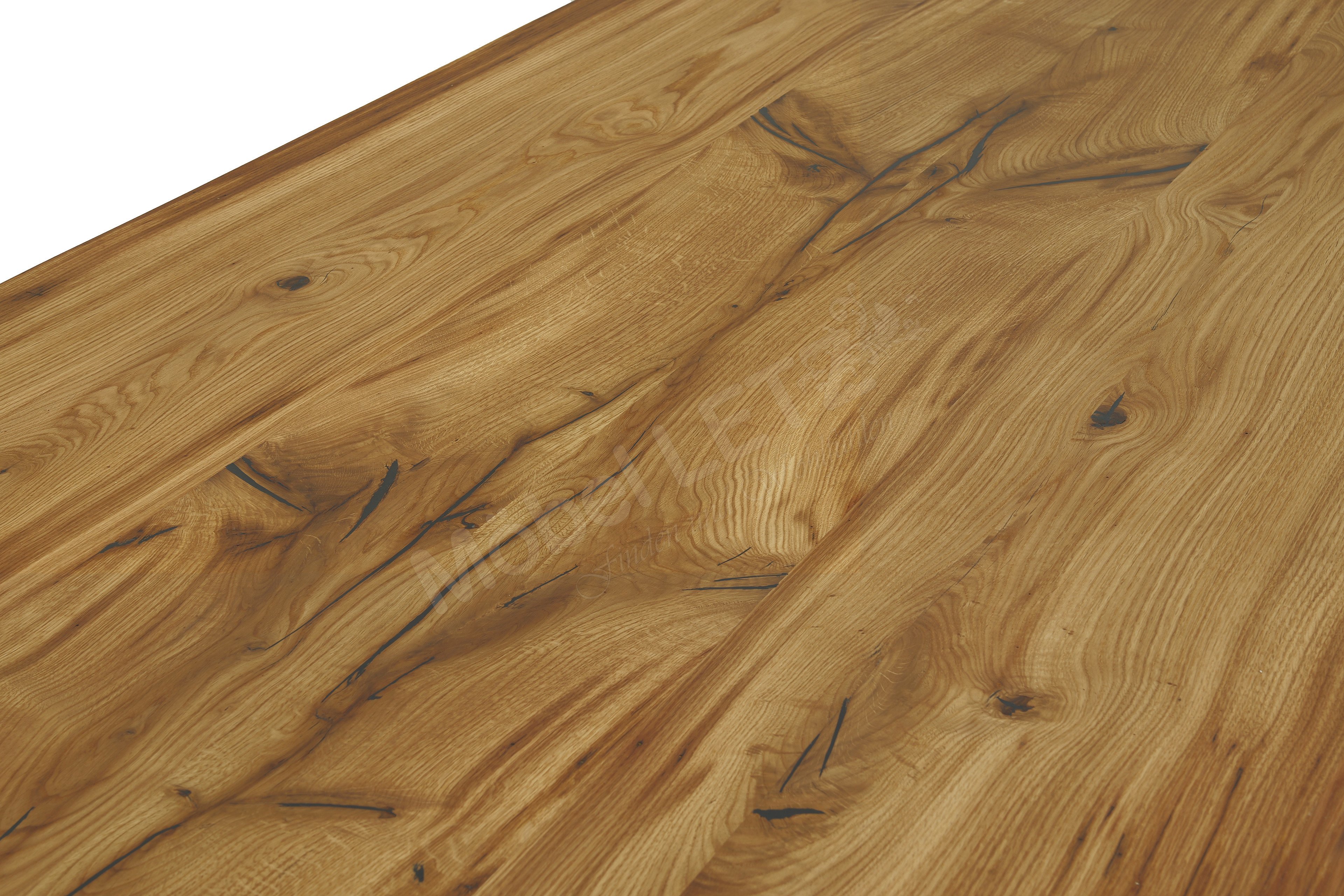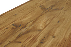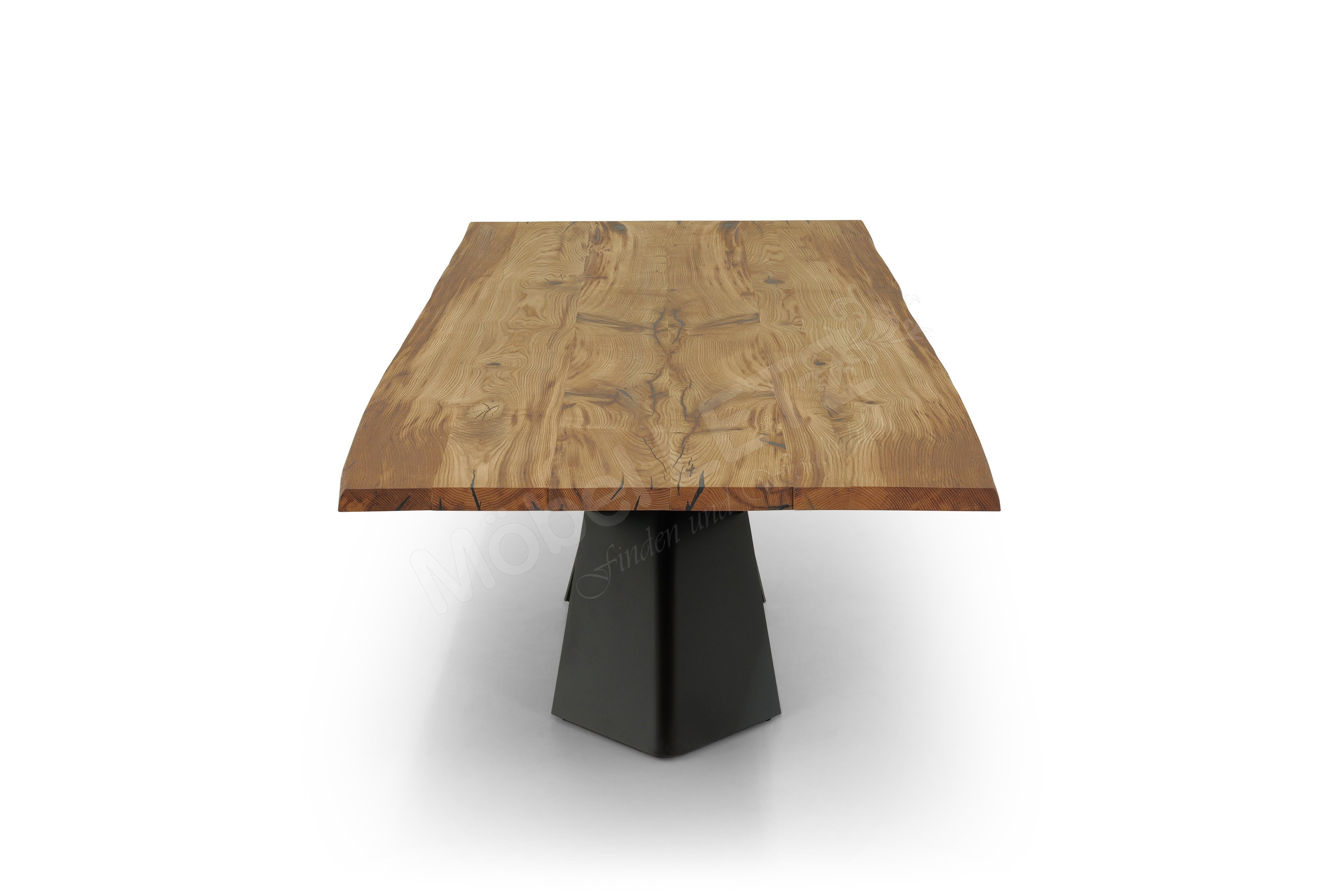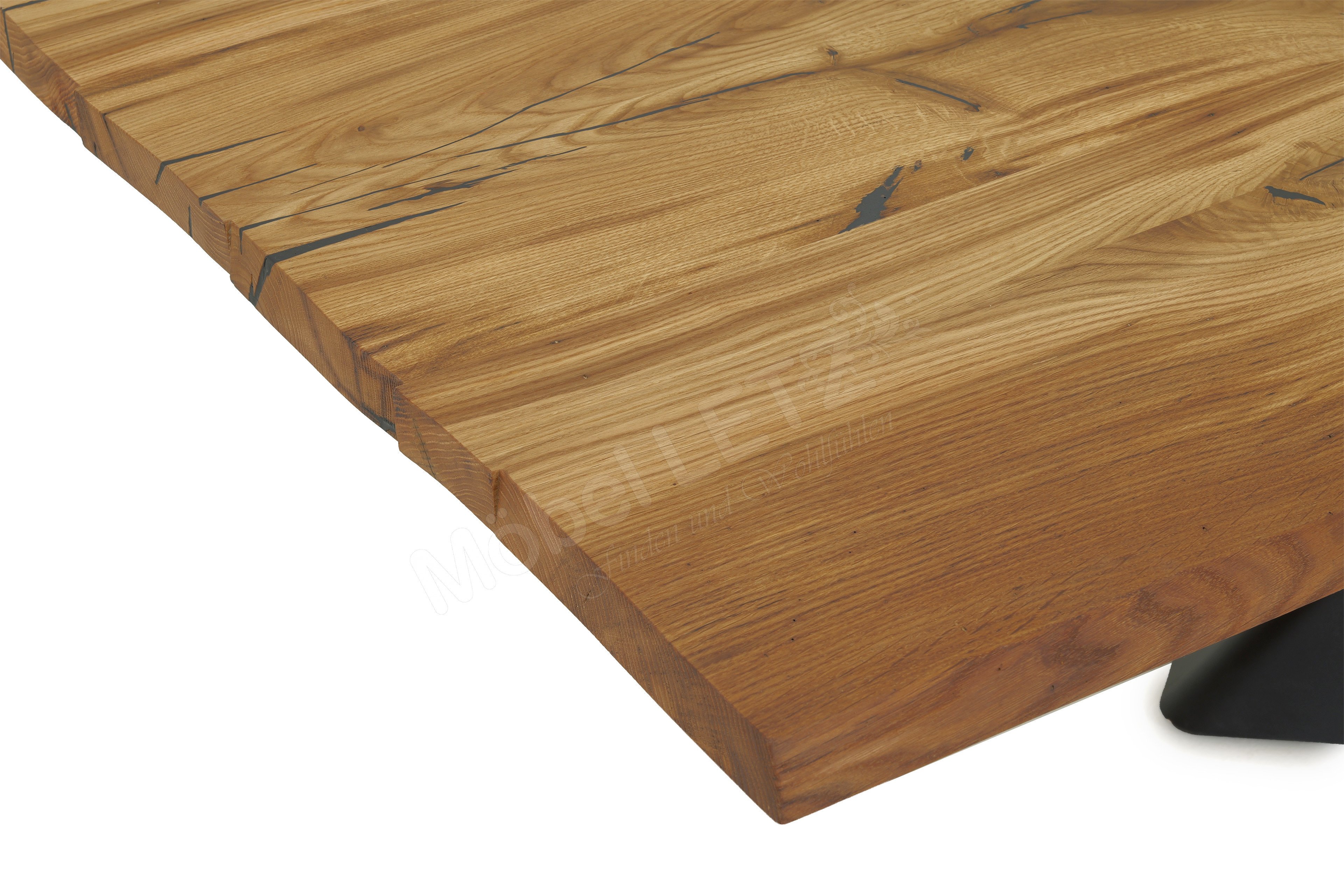 - Tischplatte: Brauneiche geölt, massiv, mit Waldkante, ca. 4 cm stark, etwaige Astlöcher und Risse mit Epoxidharz in Schwarz aufgefüllt