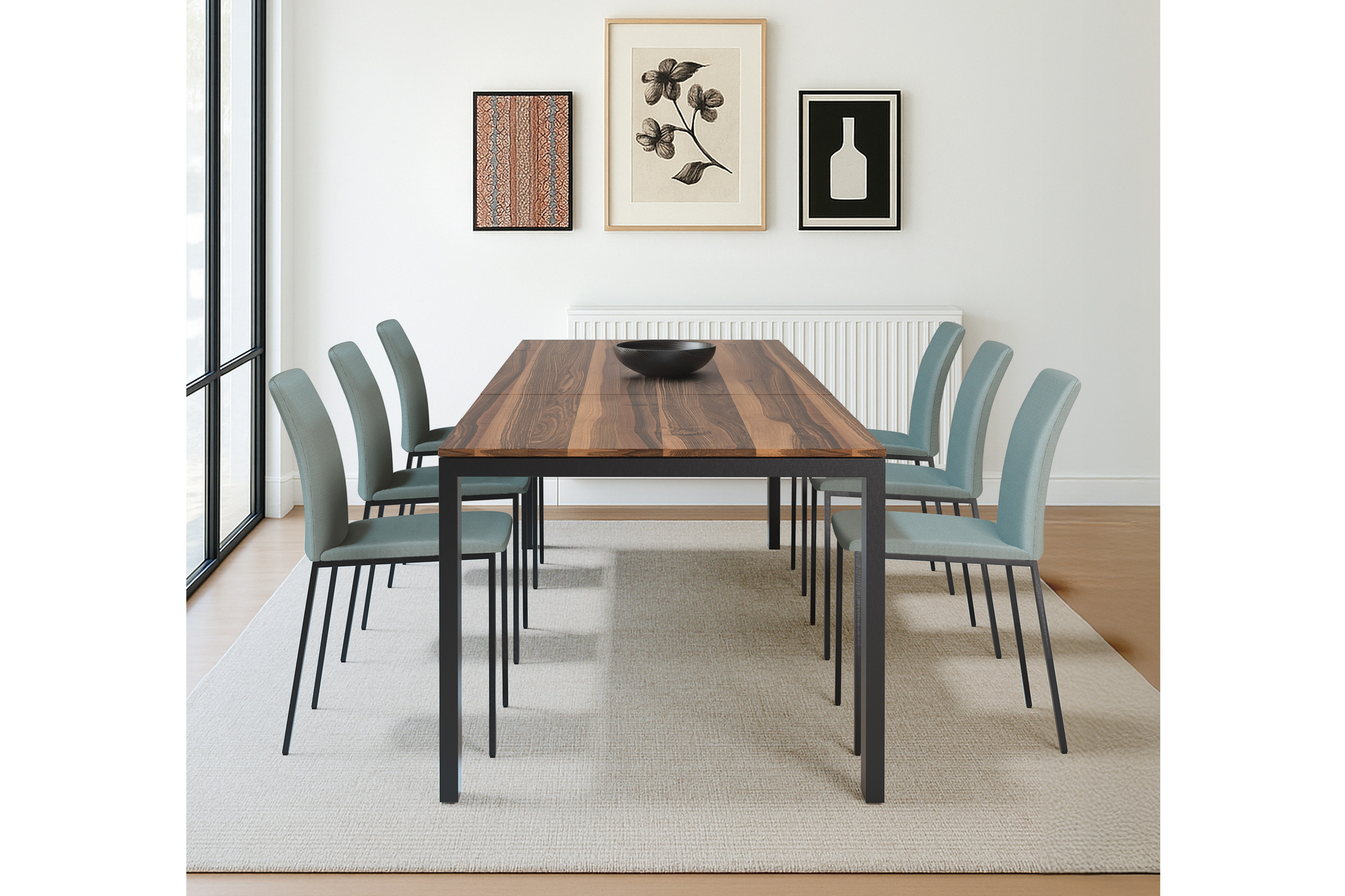 Der Esstisch Merkur Oslo von SIT Mobilia vereint zeitlose Ästhetik mit einer Atmosphäre, die zum Verweilen einlädt. Als zentraler Treffpunkt im Zuhause schafft er Raum für Begegnungen, Gespräche und gemeinsame Erlebnisse. Die edle Tischplatte aus Nussbaumholz beeindruckt durch ihre warme Ausstrahlung und die lebendige Maserung, die jedem Tisch einen unverwechselbaren Charakter verleiht. Mit seinem Maß von circa 200 x 95 cm bietet der Tisch großzügigen Platz für den Alltag und gesellige Runden. Dank einer integrierten Auszugsfunktion lässt sich die Tischfläche bei Bedarf auf wahlweise etwa 250 cm oder sogar ungefähr 300 cm erweitern. So entsteht im Handumdrehen zusätzlicher Raum für Gäste, besondere Anlässe oder lange Abende in größerer Gesellschaft – ohne dabei an Eleganz zu verlieren. Das klare Vierfußgestell aus schwarz lackiertem Stahl bildet einen stilvollen Kontrast zur natürlichen Holzplatte und verleiht dem SIT Mobilia Tisch eine moderne, zugleich ruhige Präsenz. Die Kombination aus warmem Holz und kühlem Metall wirkt ausgewogen und hochwertig, wodurch sich der Tisch harmonisch in unterschiedliche Wohnkonzepte einfügt. Das Möbel überzeugt nicht nur durch seine Gestaltung, sondern auch durch seine Flexibilität. Über unsere Zusatzoptionen stehen verschiedene Größen sowie alternative Oberflächenmaterialien zur Auswahl, sodass sich der Tisch individuell an räumliche Gegebenheiten und den persönlichen Geschmack anpassen lässt. Ergänzend kann der Stuhl Pavia optional gewählt werden, um ein stimmiges Gesamtbild zu schaffen und den Essbereich stilvoll zu vollenden.