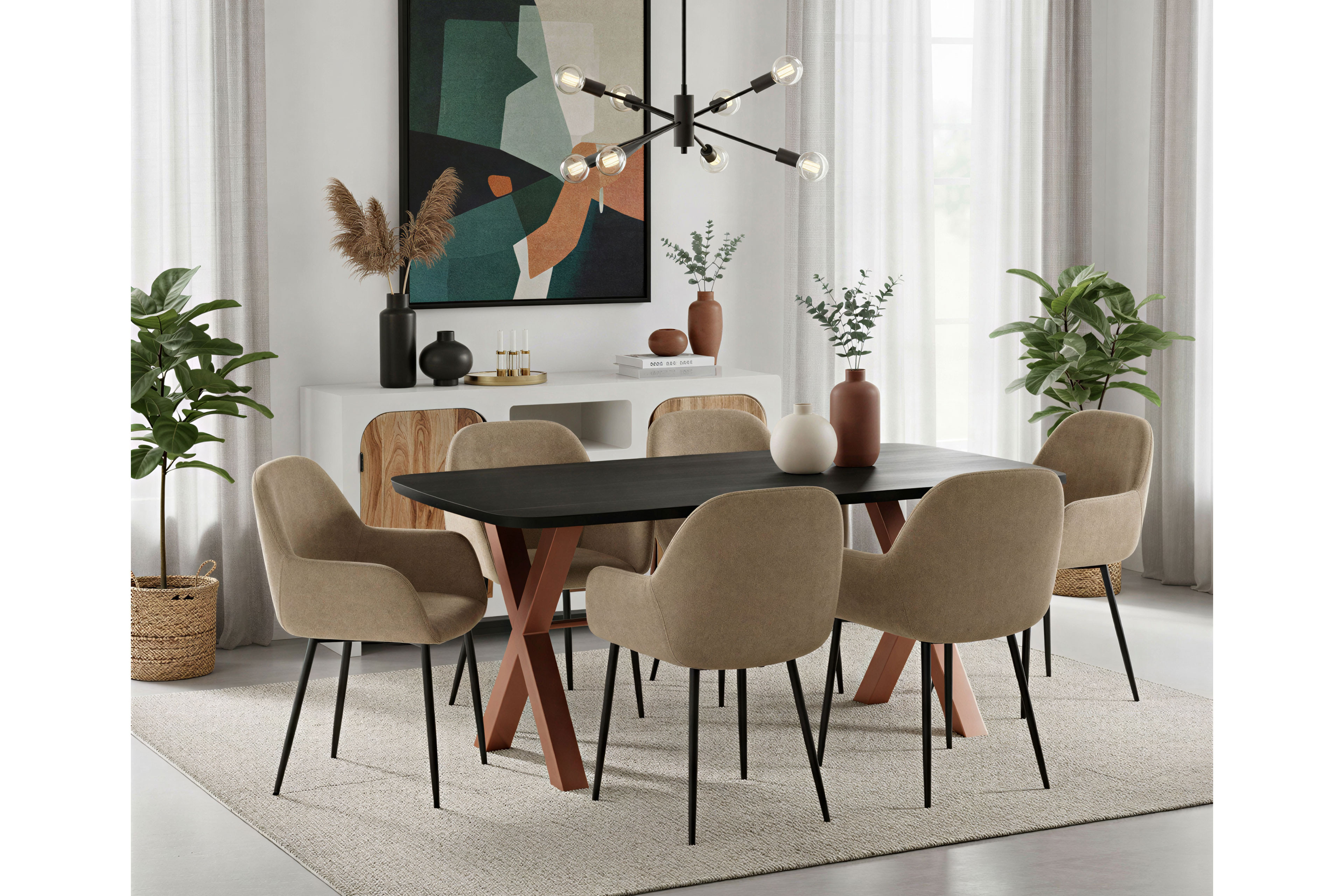 Der SIT Möbel Esstisch Black Smooth präsentiert sich als Synthese aus naturgewachsener Wärme und urbaner Präzision und setzt neue Maßstäbe für moderne Esswelten. Die Tischplatte aus Mangoholz in tiefem Schwarz wirkt wie eine nächtliche Landschaft aus Maserung und Licht, eine samtig-glatte Oberfläche, die berührt werden möchte und dabei gleichzeitig eine klare, akzentuierte Präsenz behält. Das materialreiche Schwarz betont die einzigartige Struktur des Holzes und reflektiert das Ambiente des Raumes mit einer sanften, subtilen Tiefe. Das X-Gestell in Antikbraun verleiht dem Tisch eine markante, doch zugleich elegante Silhouette. Die diagonale Dynamik des Gestells erzeugt eine gravitierende Balance zwischen Stabilität und Leichtigkeit, sodass der Esstisch sowohl in offenen Lofträumen als auch in behaglichen Wohnlandschaften eine souveräne Drehscheibe bildet. Die warme Patina des Antikbraun harmoniert perfekt mit der dunklen Platte und schafft eine harmonische Verbindung von traditioneller Handwerkskunst und zeitgemäßer Ästhetik. Dieser SIT Möbel Esstisch ist mehr als ein Möbelstück – er ist Bühne für Geschichten, Geselligkeit und unvergessliche Momente. Er lädt dazu ein, köstliche Mahlzeiten, inspirierende Gespräche und stille Augenblicke gleichermaßen stilvoll zu genießen. Die klare Linienführung, kombiniert mit der materialintensiven Präsenz des Mangoholzes, erzeugt eine Atmosphäre von nobler Ruhe, in der sich Form und Funktion in einem fließenden Tanz vereinen.
