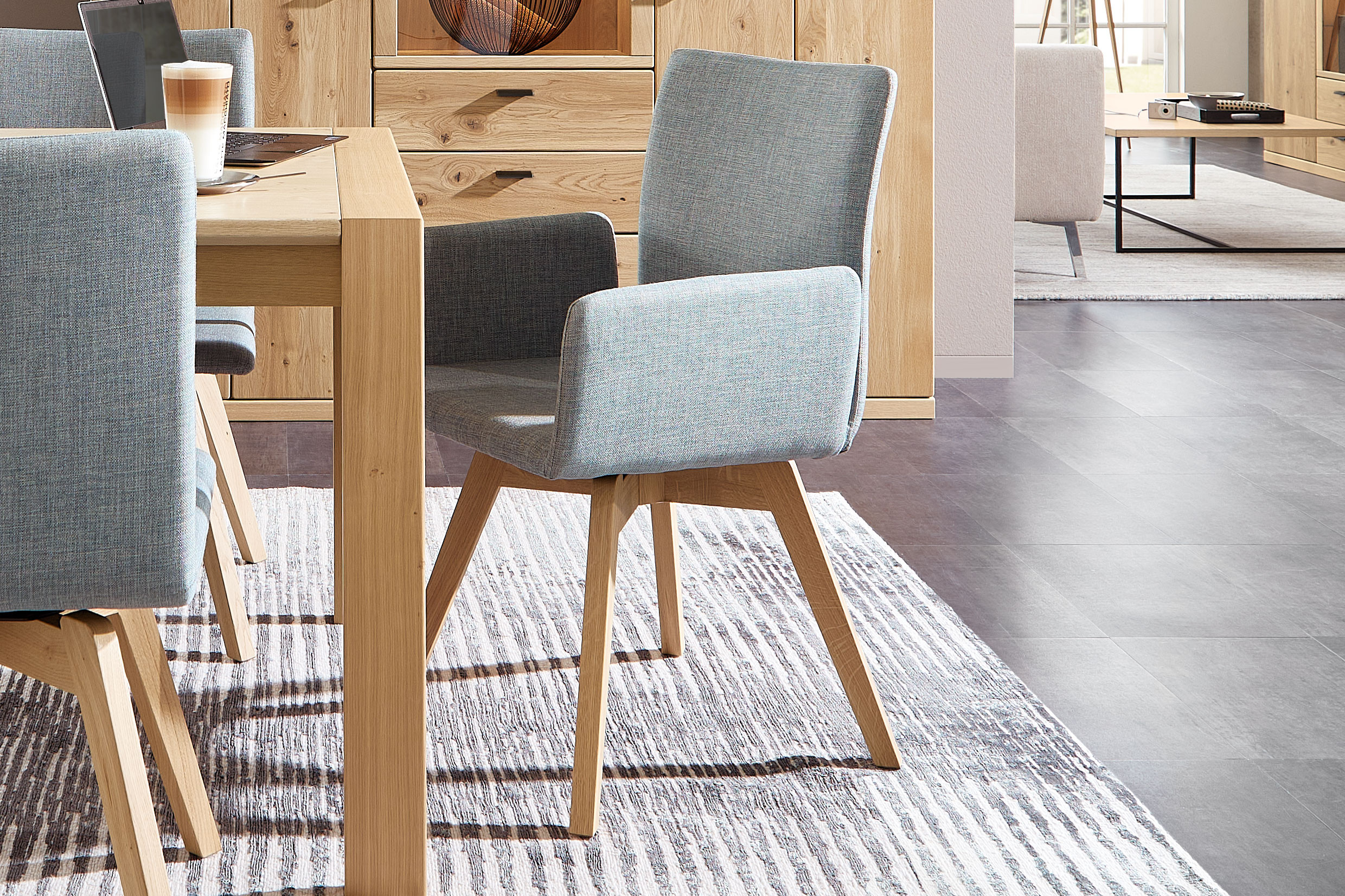 Der Rietberger Stuhl Allegro vereint zeitlose Eleganz mit moderner Formensprache und wird so zum stilvollen Mittelpunkt jedes Raumes. Sein Gestell aus massiver Asteiche überzeugt durch Stabilität, Langlebigkeit und eine natürlich warme Ausstrahlung. Die charaktervolle Holzmaserung macht jedes Exemplar zu einem Unikat und verleiht dem Design eine beeindruckende Tiefe. Gleichzeitig sorgt die sorgfältige Verarbeitung für eine klare, puristische Linie, die sich harmonisch in verschiedenste Wohn- und Arbeitswelten einfügt. Die ergonomisch geformte Sitzschale ist mit einem hochwertigen Flachgewebe bekleidet, das nicht nur optisch begeistert, sondern auch ein besonders angenehmes Sitzgefühl bietet. Die feine Struktur des Stoffes unterstreicht die ausgesprochen gehobene Haptik und lädt zum langen Verweilen ein. Ob im Esszimmer, im Homeoffice oder im Konferenzraum – dieser Stuhl spricht designaffine Genießer ebenso an wie Familien, Kreative oder anspruchsvolle Geschäftskunden. Allegro steht für Qualität, Komfort und Stilbewusstsein und schafft eine Atmosphäre, die Natürlichkeit und Exklusivität perfekt miteinander verbindet. Seine ausgewogenen Proportionen und die solide Konstruktion garantieren dauerhafte Freude, während die natürliche Farbgebung der Asteiche jedem Raum Ruhe, Wertigkeit und eine einladende Wohnlichkeit schenkt. Ein Statement für nachhaltiges Design und zeitgemäßen Komfort. Mit Charakter.