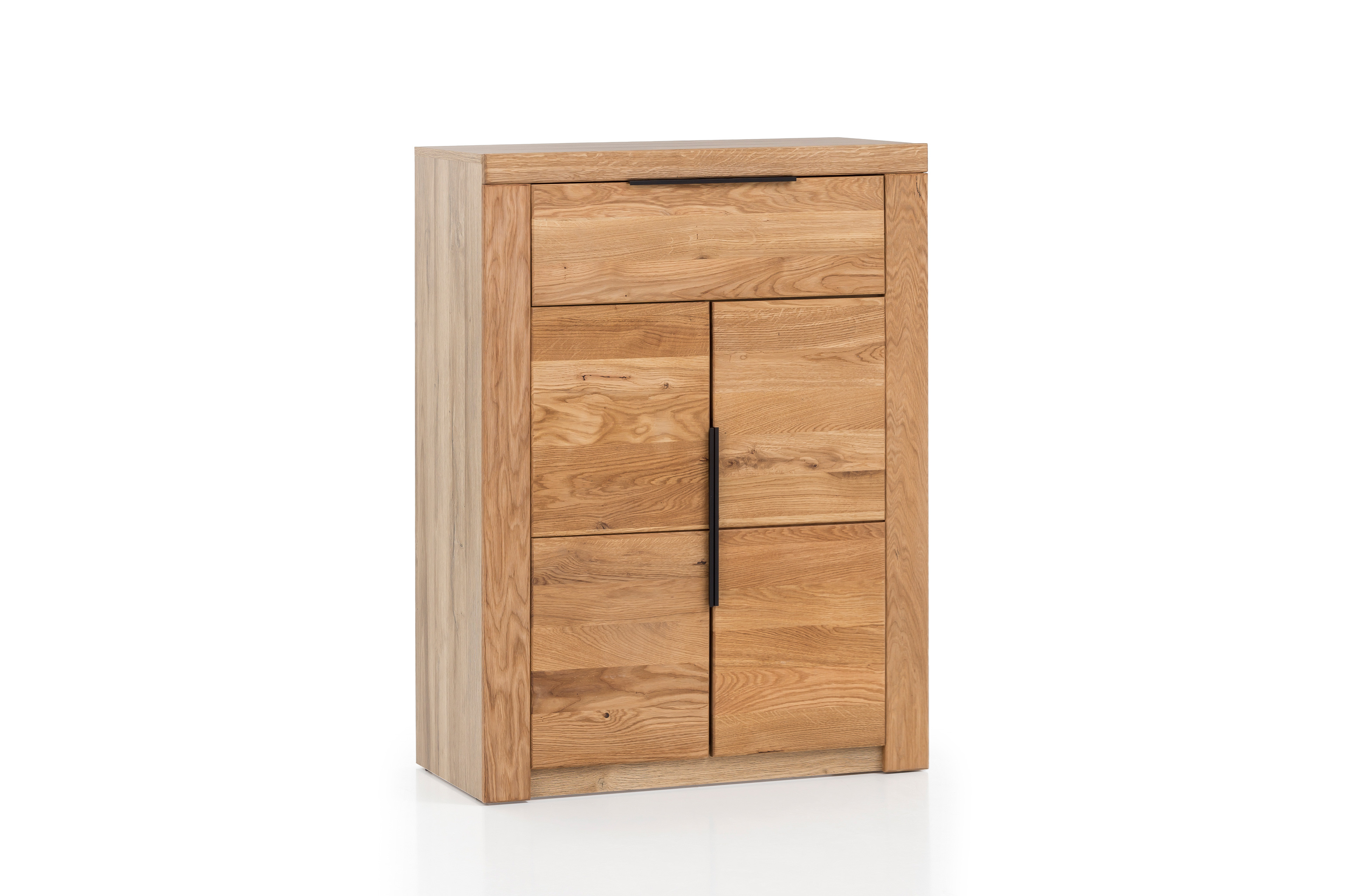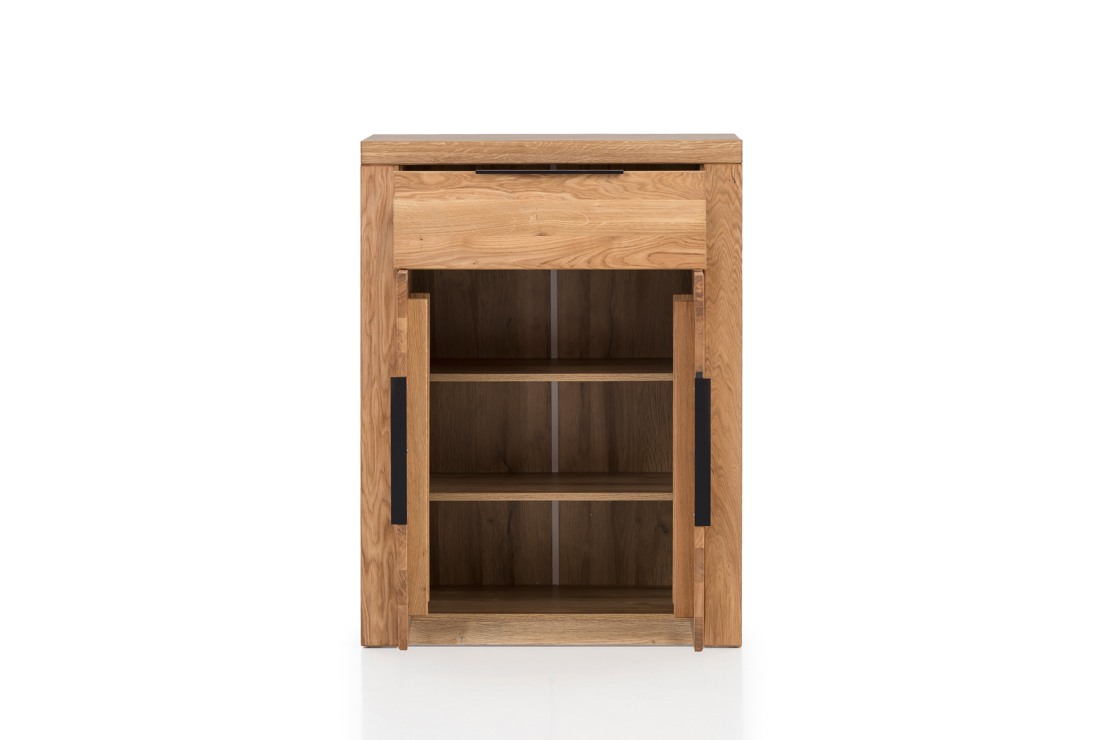 - Front: Eiche massiv, durchgehende Lamellen