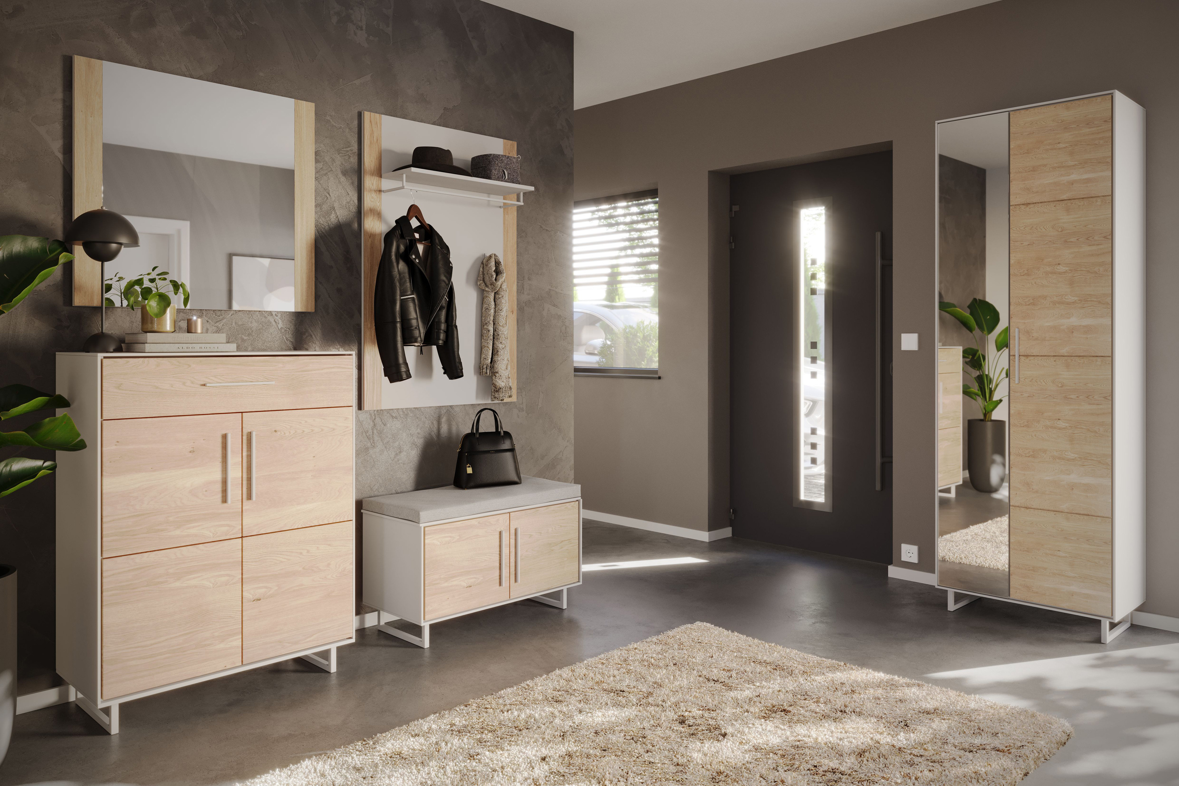 Wenn man nach einem langen Tag nach Hause kommt, wünscht man sich vor allem eines: einen Eingangsbereich, der Ruhe ausstrahlt und gleichzeitig perfekt organisiert ist – genau hier setzt das Garderobenset Kai von Elfo Möbel an und verbindet modernes Design mit durchdachter Funktionalität. Bereits im Grundangebot enthalten sind die komfortable Bank mit passendem Sitzkissen sowie das praktische Garderobenpaneel, das mit einem Hutboden, einer stabilen Kleiderstange und drei Haken ausgestattet ist und damit alles bereithält, was man für Jacken, Taschen oder Accessoires im Alltag benötigt, sodass Ordnung ganz selbstverständlich entsteht. Während die Bank nicht nur eine angenehme Sitzgelegenheit beim An- und Ausziehen bietet, schafft sie gleichzeitig wertvollen Stauraum, wodurch der Flur stets aufgeräumt wirkt und sich harmonisch präsentiert. Das Design überzeugt durch eine zeitgemäße Kombination aus warmen Holztönen und einem hellen Korpus, die dem Raum eine freundliche, einladende Atmosphäre verleihen und sich mühelos in unterschiedliche Einrichtungsstile integrieren lassen. Für noch mehr Stauraum und Komfort lässt sich das Set flexibel erweitern, denn optional stehen ein Schuhschrank, ein Spiegel sowie ein Garderobenschrank zur Verfügung, wodurch sich die Lösung individuell anpassen lässt und auch größeren Anforderungen gerecht wird. Die integrierte Soft-Close-Funktion sorgt dabei für ein sanftes und geräuschloses Schließen der Türen, was den hochwertigen Gesamteindruck zusätzlich unterstreicht und den täglichen Gebrauch besonders angenehm macht, sodass das Garderobenset Kai nicht nur optisch überzeugt, sondern auch im Alltag durch Komfort, Funktionalität und Langlebigkeit begeistert.