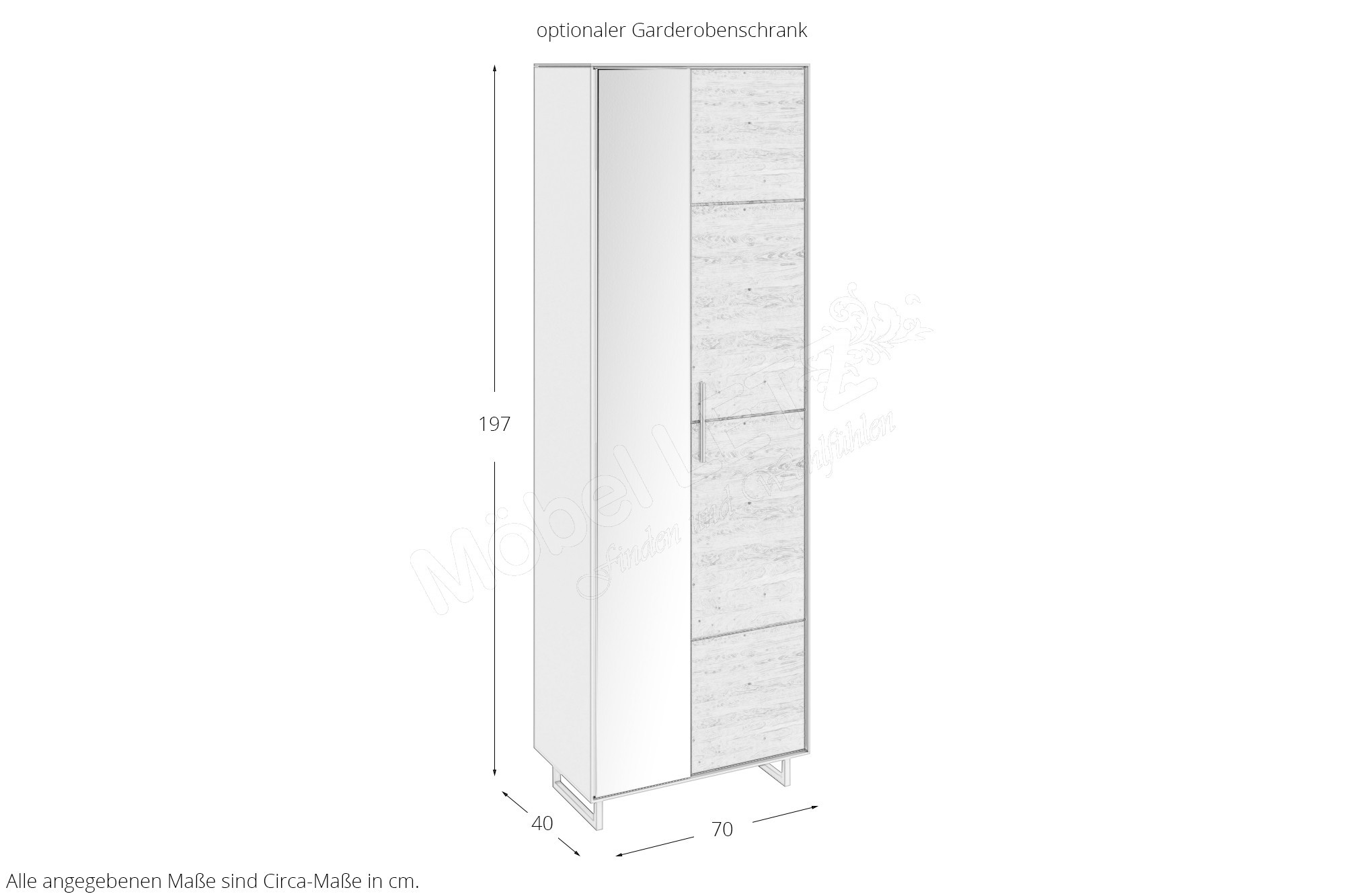 mit 1 Spiegeltür (links), 1 Holztür, 2 Einlegeböden (fest) und 1 ausziehbaren Kleiderstange, BHT ca.: 70/197/40 cm (Art-Nr. 5812)
