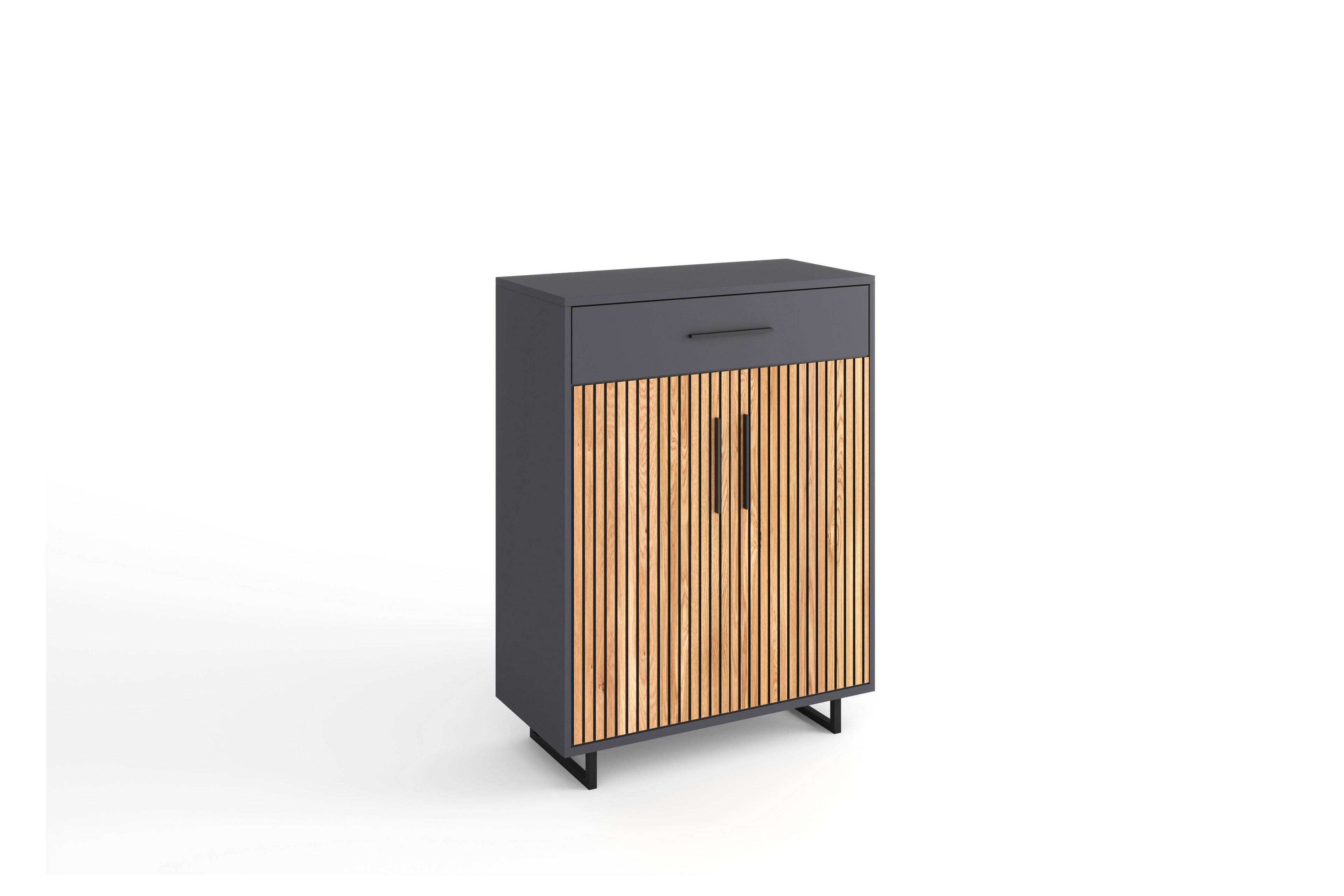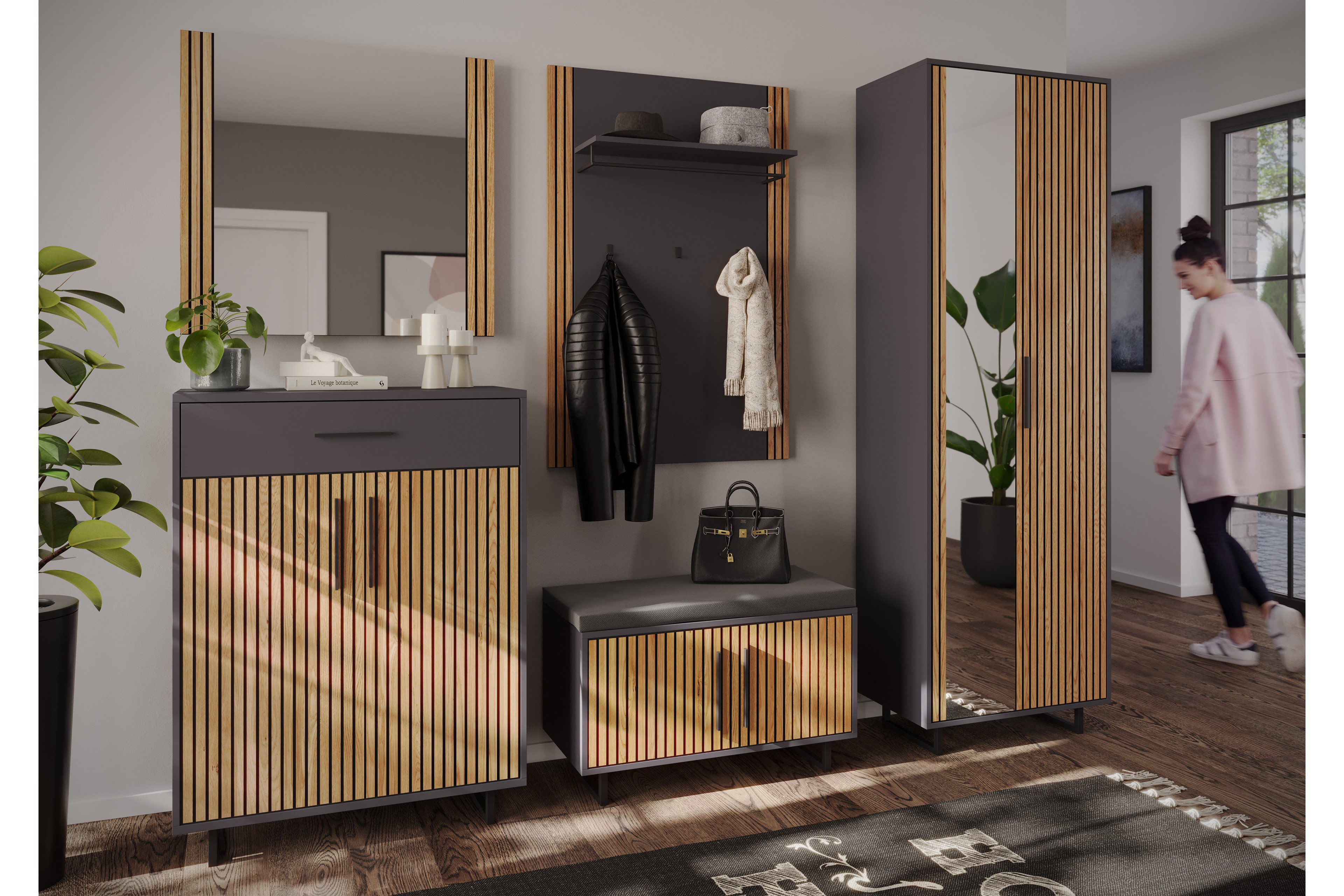 Wer kennt es nicht: Man kommt nach Hause, balanciert gleichzeitig Einkaufstaschen, Schlüssel und Jacke, stolpert halb über die eigenen Schuhe – und wünscht sich insgeheim, der Flur würde einfach mal „mitdenken“. Genau hier zeigt das Garderobenset Stella von Elfo Möbel, was modernes Möbeldesign heute leisten kann, denn es bringt nicht nur Ordnung in dieses alltägliche Chaos, sondern macht den Eingangsbereich zu einem funktionalen und stilvollen Ankerpunkt im Zuhause. Bereits im Grundangebot des Garderobensets Elfo Möbel sind eine komfortable Bank mit Sitzkissen sowie ein durchdachtes Paneel enthalten, das mit Hutboden, Kleiderstange und drei Haken ausgestattet ist und damit dafür sorgt, dass Jacken, Taschen und Accessoires endlich ihren festen Platz finden – ganz ohne Balanceakt an der Wohnungstür. Während man sich bequem auf die Bank setzt und die Schuhe ablegt, verschwindet das Durcheinander fast wie von selbst, und genau das ist der große Mehrwert dieses Systems. Optisch überzeugt das Ensemble mit einem ausdrucksstarken Kontrast aus anthrazitfarbenem Korpus und den charakteristischen Akustikpaneelen in Eiche an den Fronten, deren vertikale Struktur nicht nur modern wirkt, sondern dem Raum auch eine warme, wohnliche Tiefe verleiht, während die schwarzen Metallkufen für eine leichte, fast schwebende Anmutung sorgen. Wer noch mehr Stauraum benötigt, kann das Set flexibel erweitern, denn ein passender Schuhschrank, ein Spiegel sowie ein Garderobenschrank lassen sich optional ergänzen und fügen sich nahtlos ins Gesamtbild ein, sodass selbst größere Haushalte entspannt organisiert bleiben. Die integrierte Soft-Close-Funktion rundet das Nutzungserlebnis angenehm ab, da Türen sanft und leise schließen – ein kleines Detail, das im Alltag schnell unverzichtbar wird und das Gefühl unterstreicht, dass hier wirklich an alles gedacht wurde. So verwandelt sich der Flur Schritt für Schritt vom Stolperparcours in einen Ort, an dem man gerne ankommt und genauso gerne wieder losgeht.