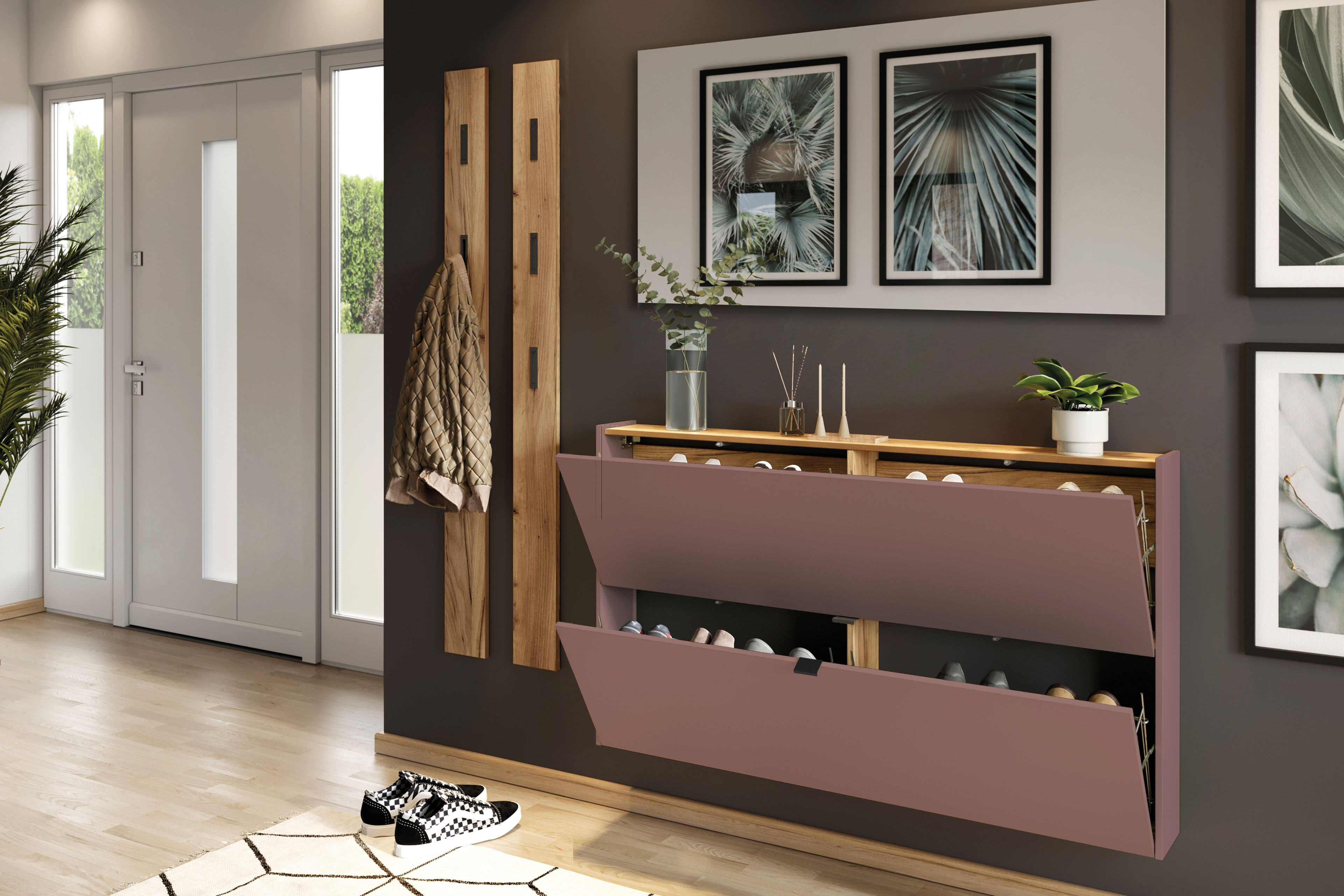 Die Garderobenkombination GW-Ameca von Germania hat eine wirklich einzigartige Farbkombination aus Toffee und Navarra-Eiche. Das Set beinhaltet einen modernen Hängeschuhschrank mit zwei großzügigen Schubladen, der Ihnen Platz für bis zu zwölf Paar Schuhe bietet. Somit haben Sie jederzeit Ordnung in Ihrem Eingangsbereich. Durch die hängende Montage wird die Reinigung des Bodens im Flurbereich ein Kinderspiel. Ein besonderes Highlight ist der passende Flächenspiegel, der das Ensemble perfekt abrundet. Er verleiht dem Raum zusätzliche Tiefe und Helligkeit, während er zugleich den letzten Blick vor dem Verlassen des Hauses ermöglicht. Optional können Sie sich die dazugehörigen Garderobenpaneele gleich dazu bestellen. Mit seinem durchdachten Design, den hochwertigen Materialien und der edlen Toffee-Farbgebung ist dieser Schuhschrank die ideale Lösung für alle, die Wert auf Ästhetik und Ordnung legen. Bestellen Sie sich das Garderoben-Set GW-Ameca von Germania und genießen Sie die harmonische Ausstrahlung Ihres neuen Eingangsbereiches.