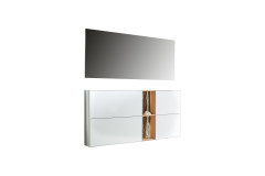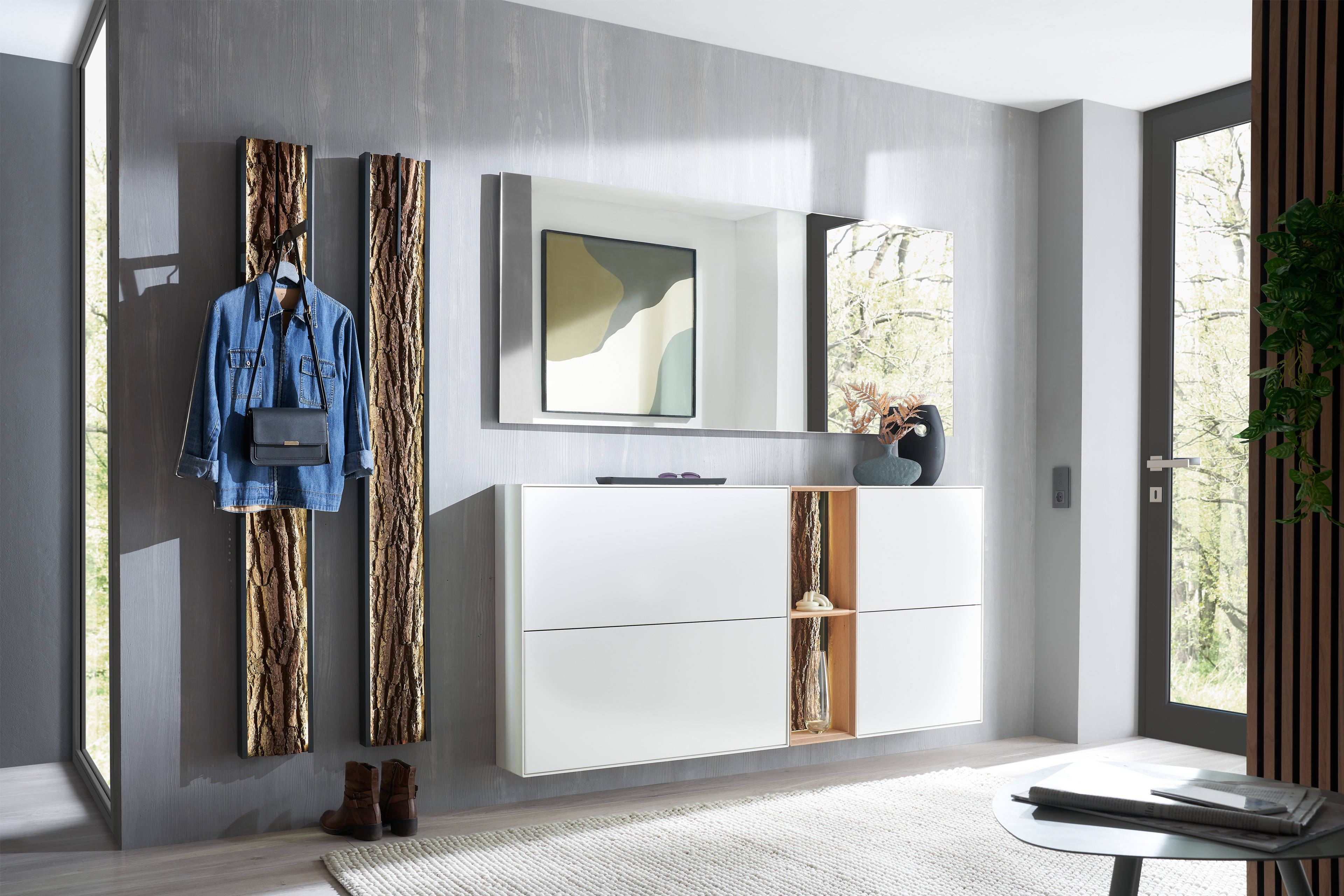 Die Garderobe Salvo von Hartmann Möbel verbindet natürliche Materialien, modernes Design und nachhaltige Verarbeitung zu einem hochwertigen Einrichtungselement für Ihren Eingangsbereich. Charakteristisch für dieses Modell sind die einzigartigen Applikationen aus echter Rinde. Front und Korpus bestehen aus massiver, weiß lackierter Kernbirke, einem langlebigen und besonders ausdrucksstarken Holz mit feiner Maserung. Dieser Naturwerkstoff wird von Hartmann sorgfältig verarbeitet und stammt aus nachhaltiger Forstwirtschaft – ideal für alle, die Wert auf ökologische Möbel legen. Der Schuhschrank der Garderobe Salvo bietet durch seine vier Klappen, hinter denen sich jeweils ein praktischer Schuhkorb verbirgt, viel Stauraum und eine übersichtliche Organisation. Ergänzt wird das Möbel durch zwei offene Fächer, die dekorative Akzente setzen oder schnellen Zugriff auf häufig genutzte Accessoires ermöglichen. Die abgebildeten Paneele sowie eine passende Beleuchtung sind optional erhältlich und ermöglichen eine individuelle Gestaltung je nach Raumsituation und persönlichem Stil. Salvo vereint Design, Funktionalität und Natur – für einen Eingangsbereich, der stilvoll empfängt und nachhaltig überzeugt.