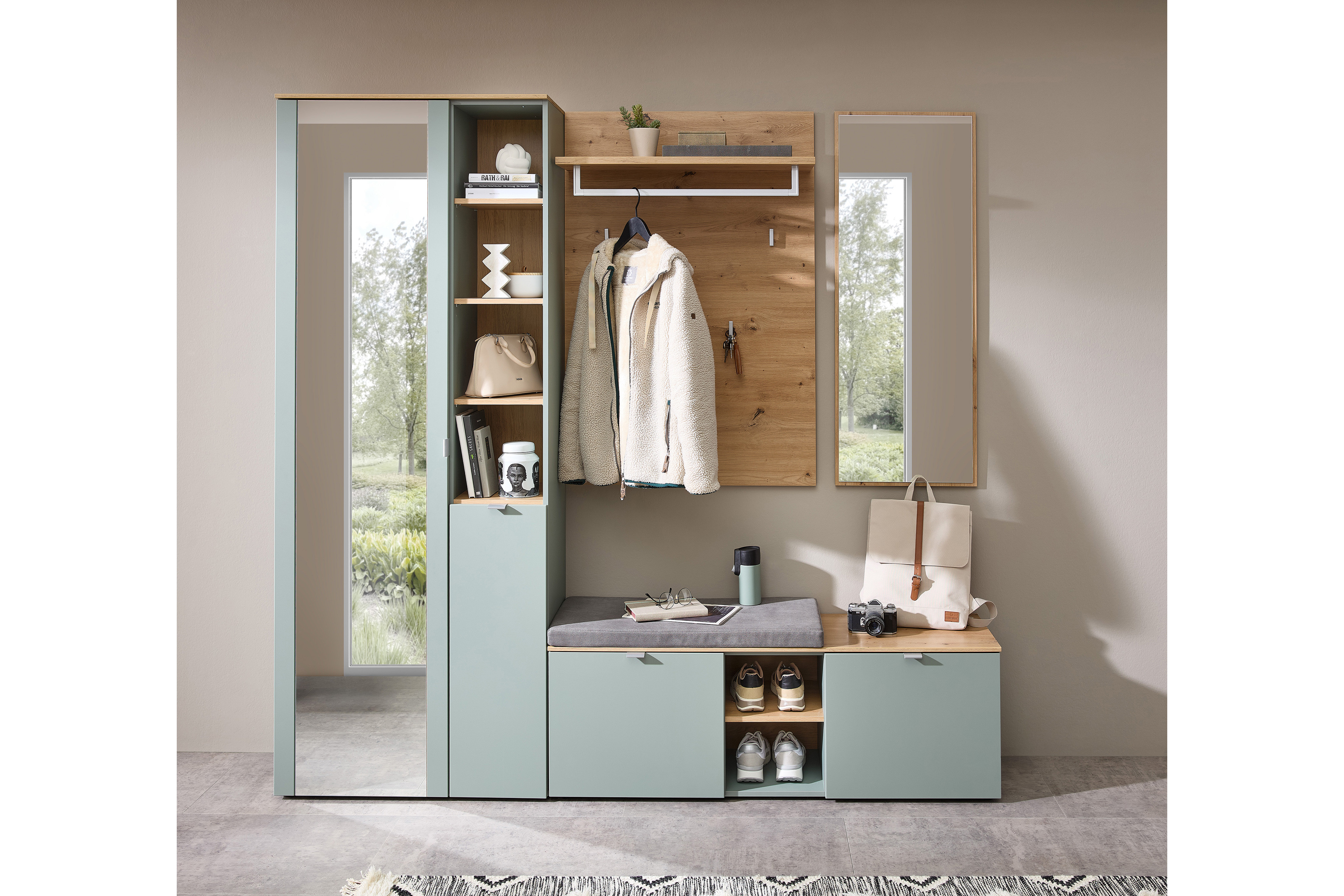 Die Garderobe Bari von Innostyle vereint modernes Design mit praktischer Alltagstauglichkeit und macht jeden Eingangsbereich zu einem einladenden Blickfang. Die schilfgrünen, matten Fronten und der farblich passende Korpus sorgen für eine ruhige, zeitgemäße Optik, während Absetzungen in Artisan Eiche für warme, natürliche Akzente im Raum stehen. Die silbermatten Metallgriffe unterstreichen den hochwertigen Gesamteindruck. Dank der praktischen Softclose-Funktion schließen die Türen sowie die Schubkästen angenehm leise und schonend, was den täglichen Gebrauch spürbar komfortabler macht. Die Garderobenbank bietet mit zwei offenen Fächern, zwei zusätzlichen Staufächern hinter Türen sowie einem hellgrauen, weich gepolsterten Sitzkissen nicht nur viel Platz, sondern auch eine bequeme Sitzgelegenheit zum Schuhe Anziehen. Das passende Garderobenpaneel mit Ablageboden, Kleiderstange und vier Haken schafft Ordnung für Jacken, Taschen und Accessoires, während der große Spiegel Ihre Diele optisch vergrößert und für den letzten Outfit-Check bereitsteht. Benötigen Sie zusätzlichen Stauraum? Dann buchen Sie sich den Garderobenschrank ganz einfach über die Zusatzoptionen hinzu. Bari von Innostyle - für einen Flur mit Ordnung und Stil.