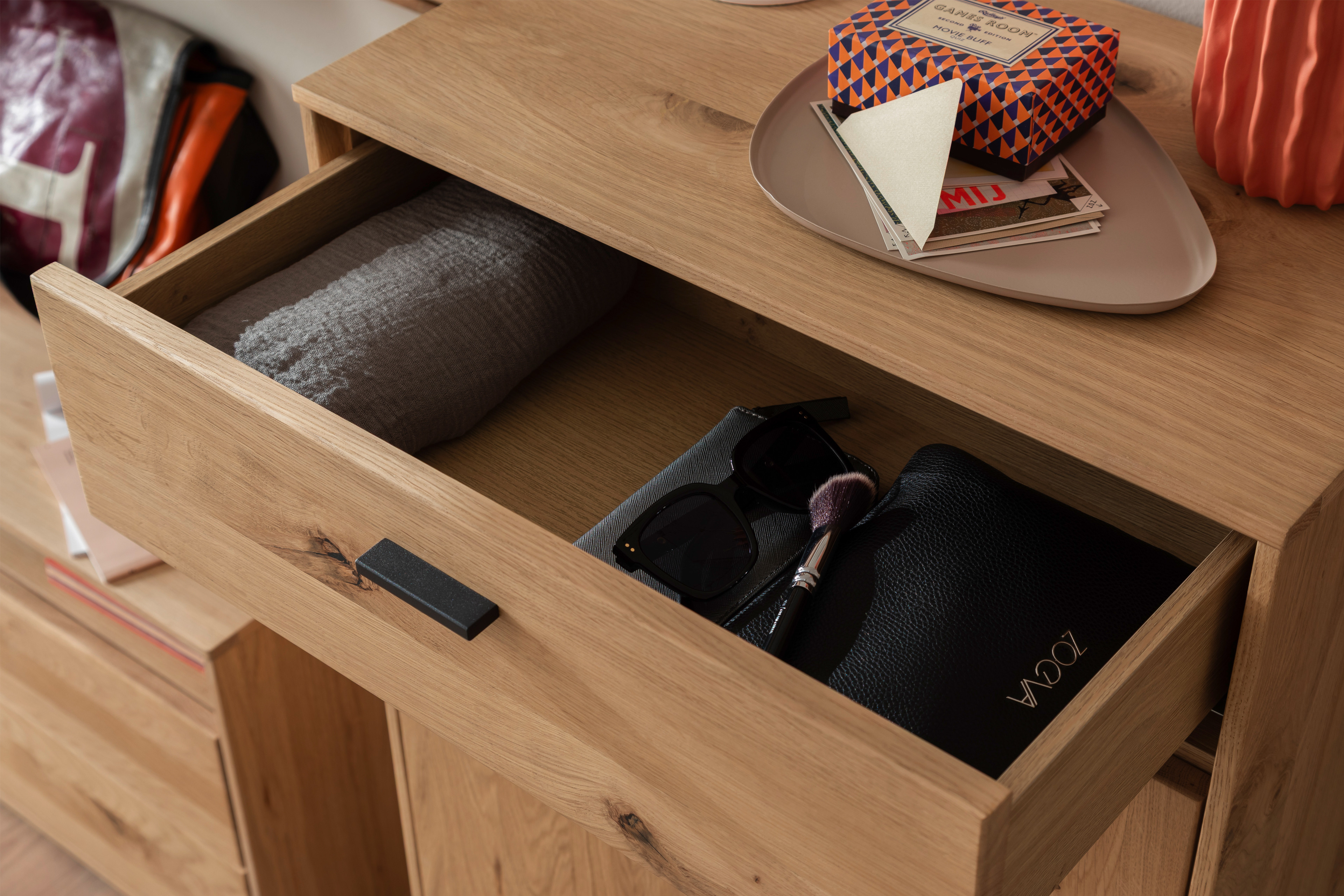 Mit Binz von MCA Furniture präsentieren wir Ihnen diese großzügige und stilvoll geformte Garderobe. Bestehend aus einer praktischen Bank und einem formschönen Paneel, bei der jedes Detail mit sorgfältiger Handwerkskunst durchdacht wurde, um Ihrem Eingangsbereich eine warme, einladende Atmosphäre zu verleihen, die gleichzeitig durch klare Linien und zeitlose Eleganz überzeugt. Die Bank besticht durch ihre stabile Sitzfläche, sie lädt komfortabel zum Verweilen ein, bietet eine entspannte Sitzhöhe, die dem Alltagsgebrauch mühelos standhält, während die Ast & Balkeneiche eine naturbelassene, harmonische Maserung mit markanten Holzmustern zeigt, die dem Raum Lebendigkeit und Charakter verleiht. Das Paneel ergänzt dieses Ensemble durch eine stilvolle, rahmenlose oder dezent eingefasste Aufhängelösung, die Ihre Mäntel, Jacken und Kleider sicher, ordentlich und sichtbar platziert, sodass Sie jeden Morgen einen klaren Überblick genießen und Ihre Garderobe mit Leichtigkeit organisieren können. Optional erhältlich ist ein Garderobenschrank, der sich nahtlos in das bestehende Designkonzept einfügt und großzügigen Stauraum bietet, damit Sie Taschen, Hüte, Schals und Saisonbegleiter sicher und ordentlich verstauen können. Die abgebildete Kommode ergänzt das Ensemble um weitere Ablageflächen sowie versteckten Stauraum, ideal für kleine Alltagsutensilien, Schmink- und Kosmetikspiegel oder Trageunterlagen, während ein Spiegel die Lichtwirkung verdoppelt, den Raum optisch vergrößert und beim Styling jederzeit eine klare, helle Sicht ermöglicht. Alle Komponenten zeichnen sich durch hochwertige, langlebige Griffe aus, deren metallische Beschläge in Schwarzgrau edle Akzente setzen und ein sanftes, reibungsloses Öffnen und Schließen garantieren. Greifen Sie zu und bestellen sie noch heute Ihr neues Garderobenset Binz von MCA Furniture.