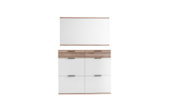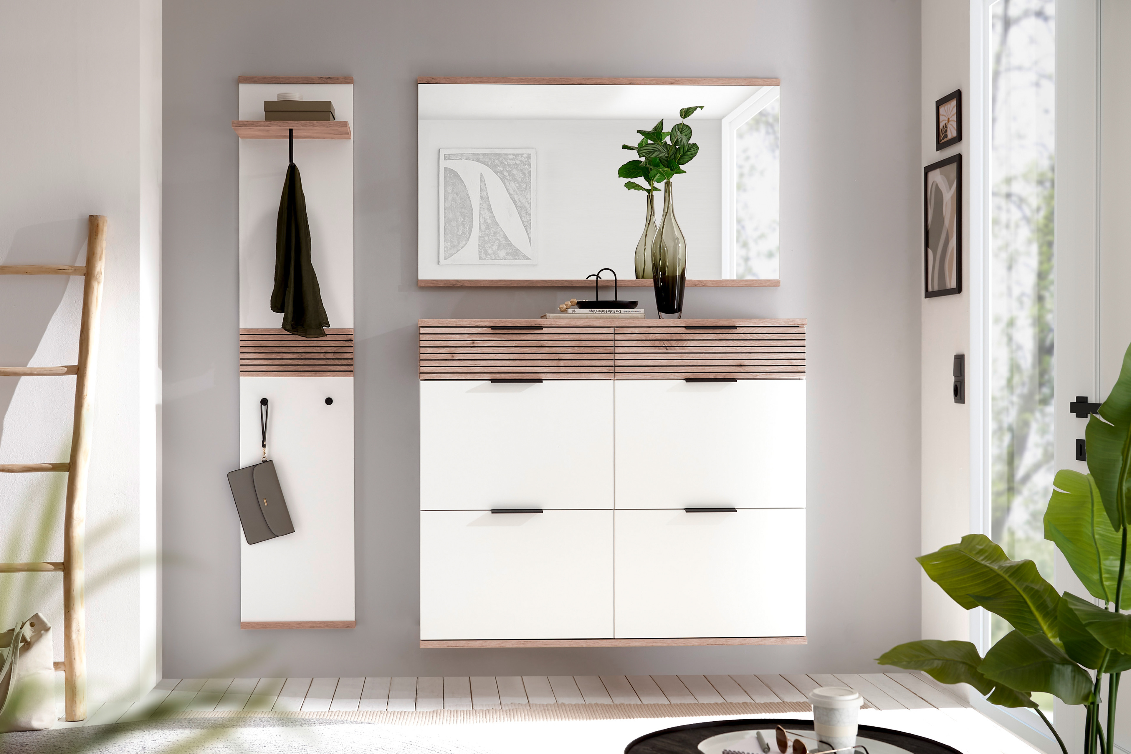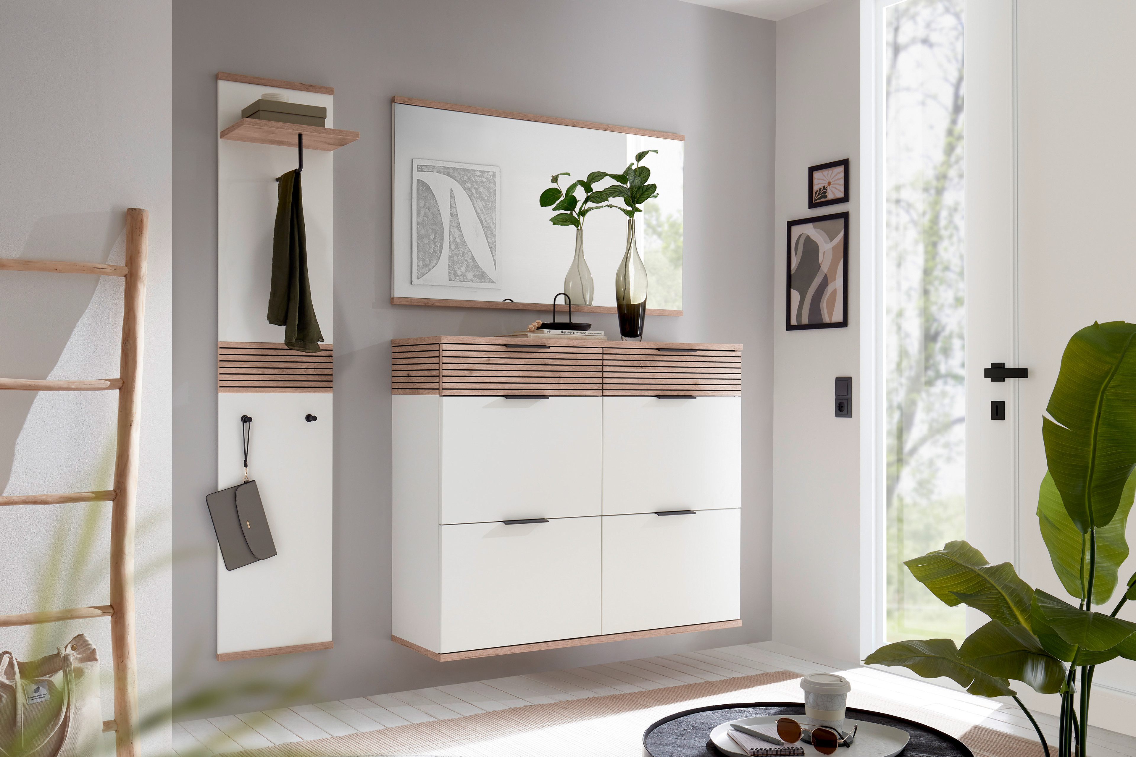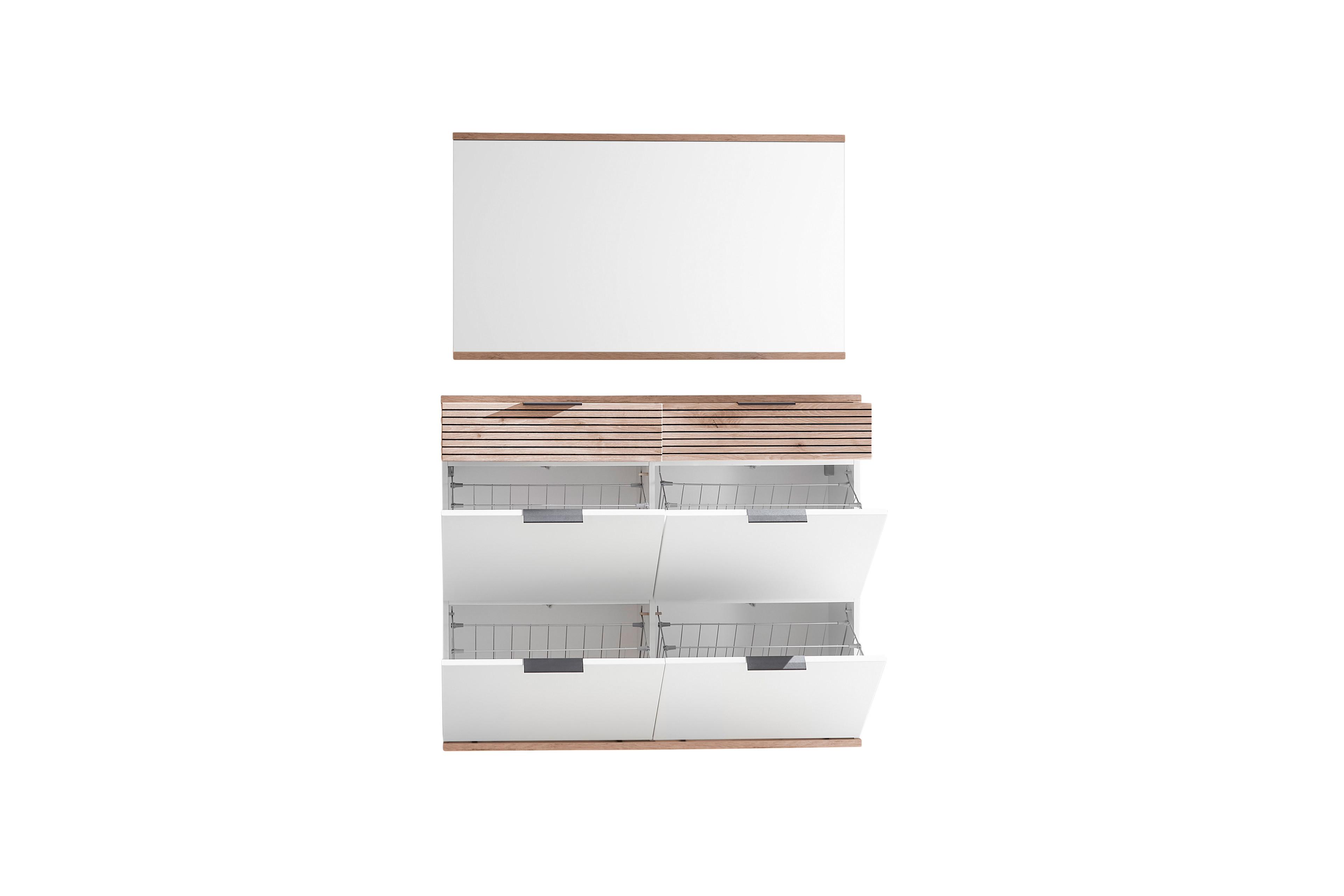 Eine harmonische Verbindung aus freundlicher Helligkeit und warmer, schöner Tiefe – das erwartet Sie mit dem Modell Montello aus dem Hause MCA Furniture. Diese durchdachte Garderobenlösung überzeugt mit klaren, formschönen Linien und einer makellosen, gepflegten Optik. Die Soft-White-Oberfläche wirkt sanft matt und strahlt Frische aus, während die markanten Viking-Oak-Akzente dem Ensemble charaktervolle Struktur und wohnliche Wärme verleihen. Der Schuhschrank bietet mit vier praktischen Klappen und zwei geräumigen Schubladen übersichtliche, ordentliche Aufbewahrung. Die großzügig bemessenen Fächer ermöglichen eine leichte Übersicht, schnellen Zugriff und eine ordentliche Sortierung Ihrer Schuhe – von straßentauglich bis formell. Die sanft laufenden Beschläge garantieren ein leises, reibungsloses Öffnen und Schließen. Der Spiegel rundet das Garderobenset ab und vergrößert optisch den Raum, reflektiert Licht und sorgt für eine helle, freundliche Atmosphäre beim An- und Auskleiden. Seine klare Optik fügt sich nahtlos in das Gesamtbild ein und bewahrt zugleich die moderne Eleganz des Designs. Optional lässt sich ein Paneel mit Kleiderstange, Haken und Ablageboden in unseren Zusatzoptionen auswählen. Es bietet zusätzliche Aufhängemöglichkeiten für Mäntel, Jacken und Kleider sowie eine praktische Ablagefläche für Hüte, Taschen oder Accessoires. Mit Montello von MCA Furniture entsteht eine kompakte, durchdachte Einheit, die Ordnung und Stil perfekt vereint.