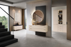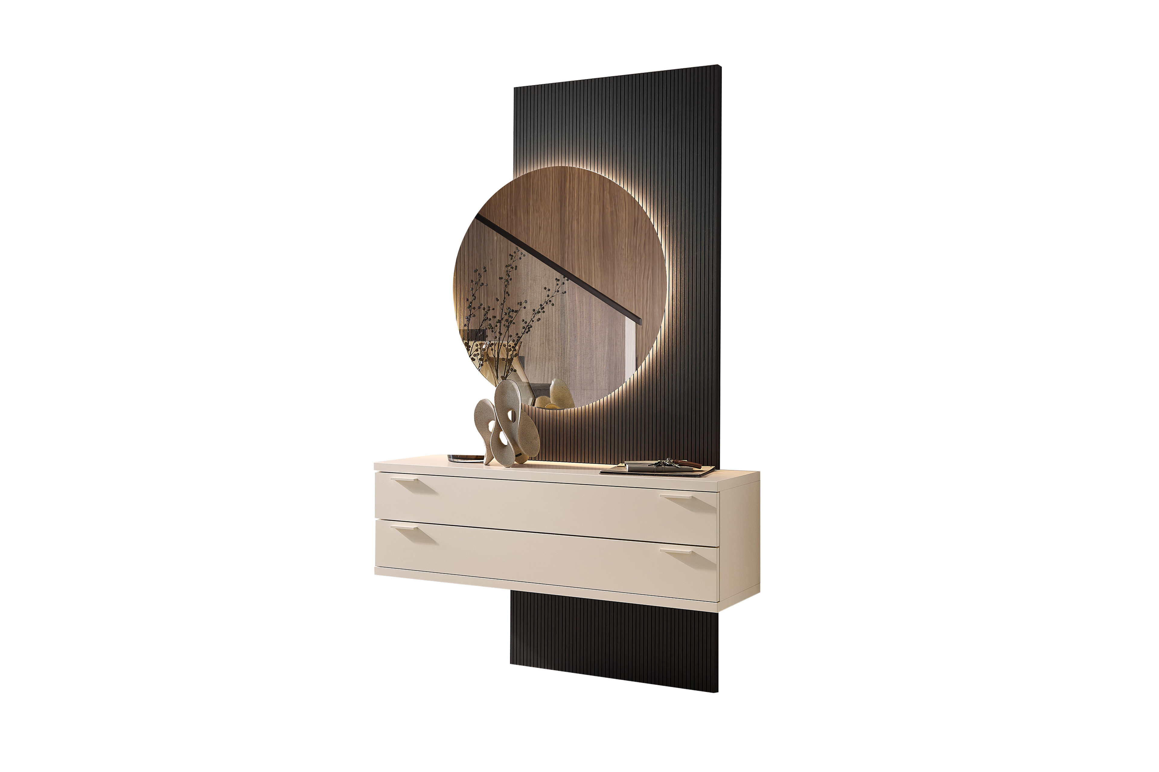 - Garderobe mit 1 Hängeelement mit 2 Schubkästen, 1 runden Spiegel und einem Paneel