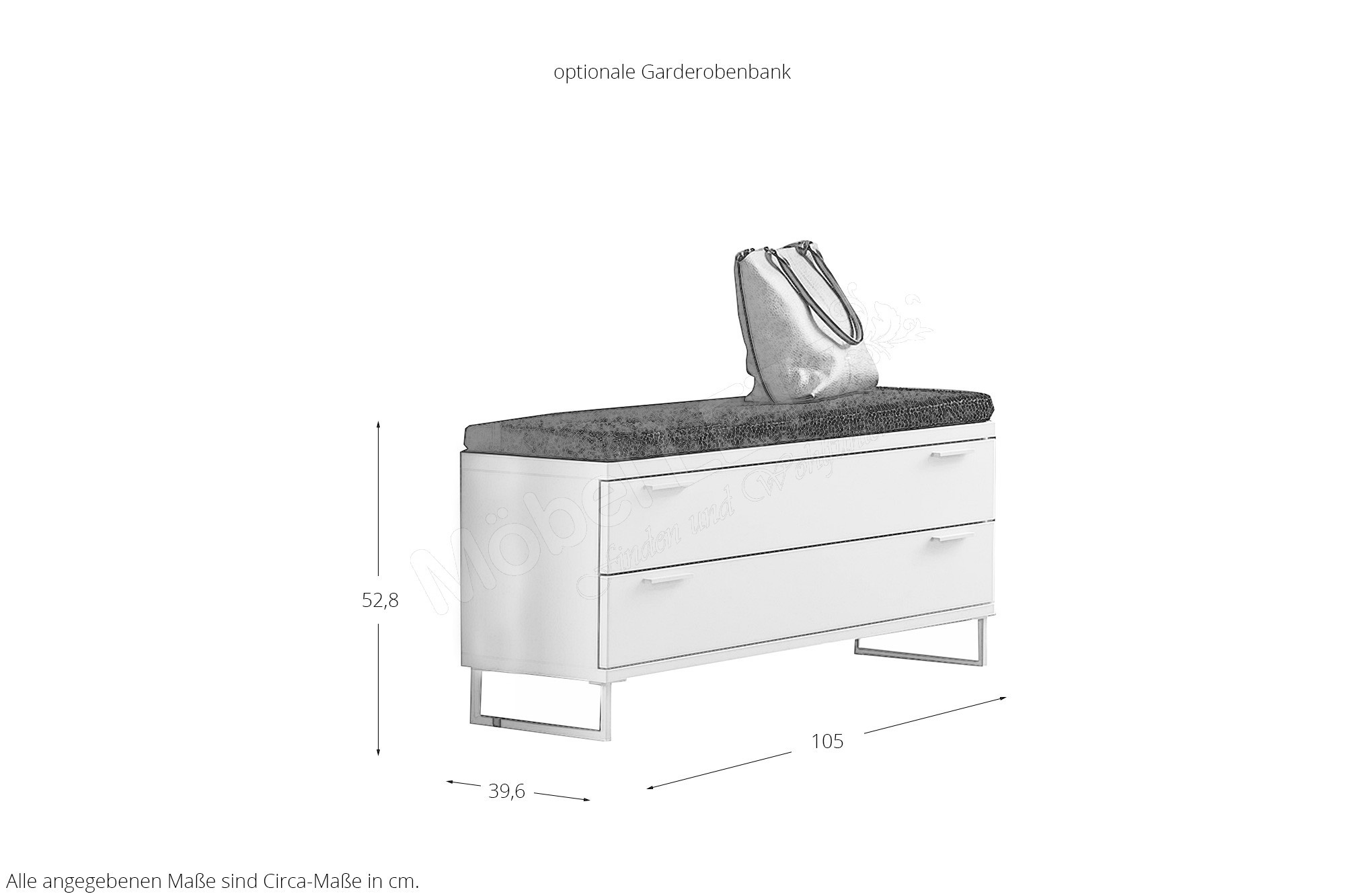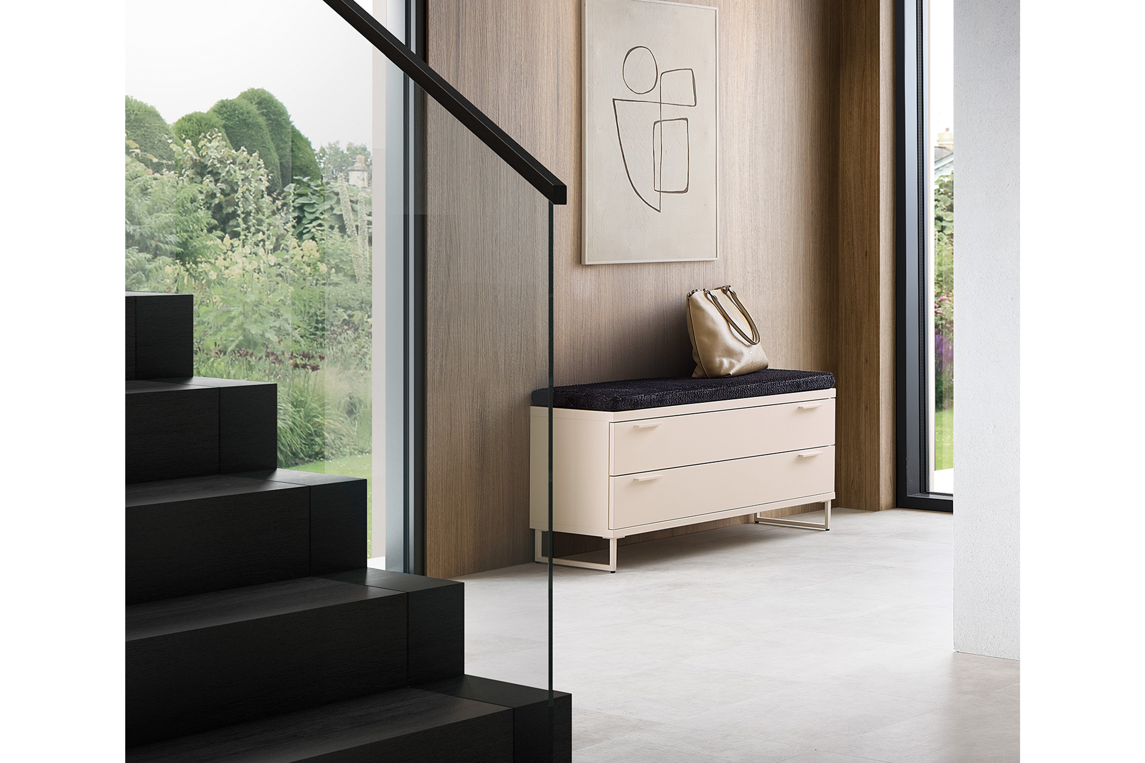 Diese edle Garderobenkombination von Rietberger mit dem Namen Siena verkörpert modernes Design, klare Linien und zeitlose Eleganz in Perfektion. Das wandhängende Element mit zwei großzügigen Schubkästen präsentiert sich in einem feinen Wollweißlack, der dem Raum eine helle, ruhige Atmosphäre verleiht und zugleich eine hochwertige, samtmatte Oberfläche bietet. Das Paneel in einer anspruchsvollen Ausführung in Deepline schwarz bildet einen ausdrucksstarken Kontrast zum sanften Wollweiß und setzt den modernen Charakter dieser Garderobe gekonnt in Szene. Hinter der feinen Struktur des Paneels verbirgt sich handwerkliche Präzision, die Qualität und Design auf höchstem Niveau vereint. Optional kann die Komposition durch eine stimmungsvolle Beleuchtung ergänzt werden, die die Materialien subtil in Szene setzt und für eine angenehme Atmosphäre sorgt. Ebenso optional ist die elegante Bank mit Kissen, die zusätzlichen Komfort und Stauraum bietet und den Eingangsbereich funktional abrundet. Die Kombination aus minimalistischer Formgebung, hochwertigen Oberflächen und flexibler Gestaltung macht diese Garderobe zu einem echten Blickfang in jeder modernen Wohnumgebung. Neben der hier gezeigten Variante sind zahlreiche weitere Lack- und Furnierausführungen möglich, wodurch sich das Möbel perfekt an unterschiedliche Einrichtungsstile und Farbwünsche anpassen lässt. So entsteht ein individuelles, maßgeschneidertes Einrichtungselement, das Funktion und Ästhetik auf höchstem Niveau vereint und den Eingangsbereich zu einem stilvollen Empfangsraum macht. Mit Siena von Rietberger treffen Sie garantiert die richtige Wahl.