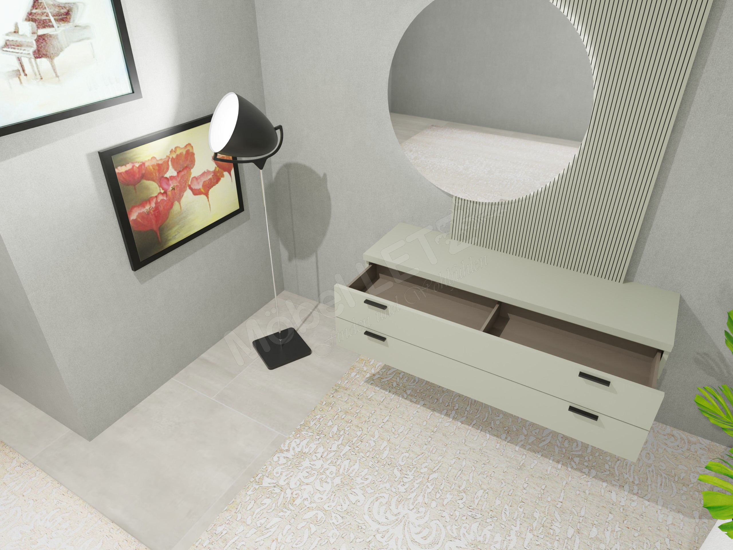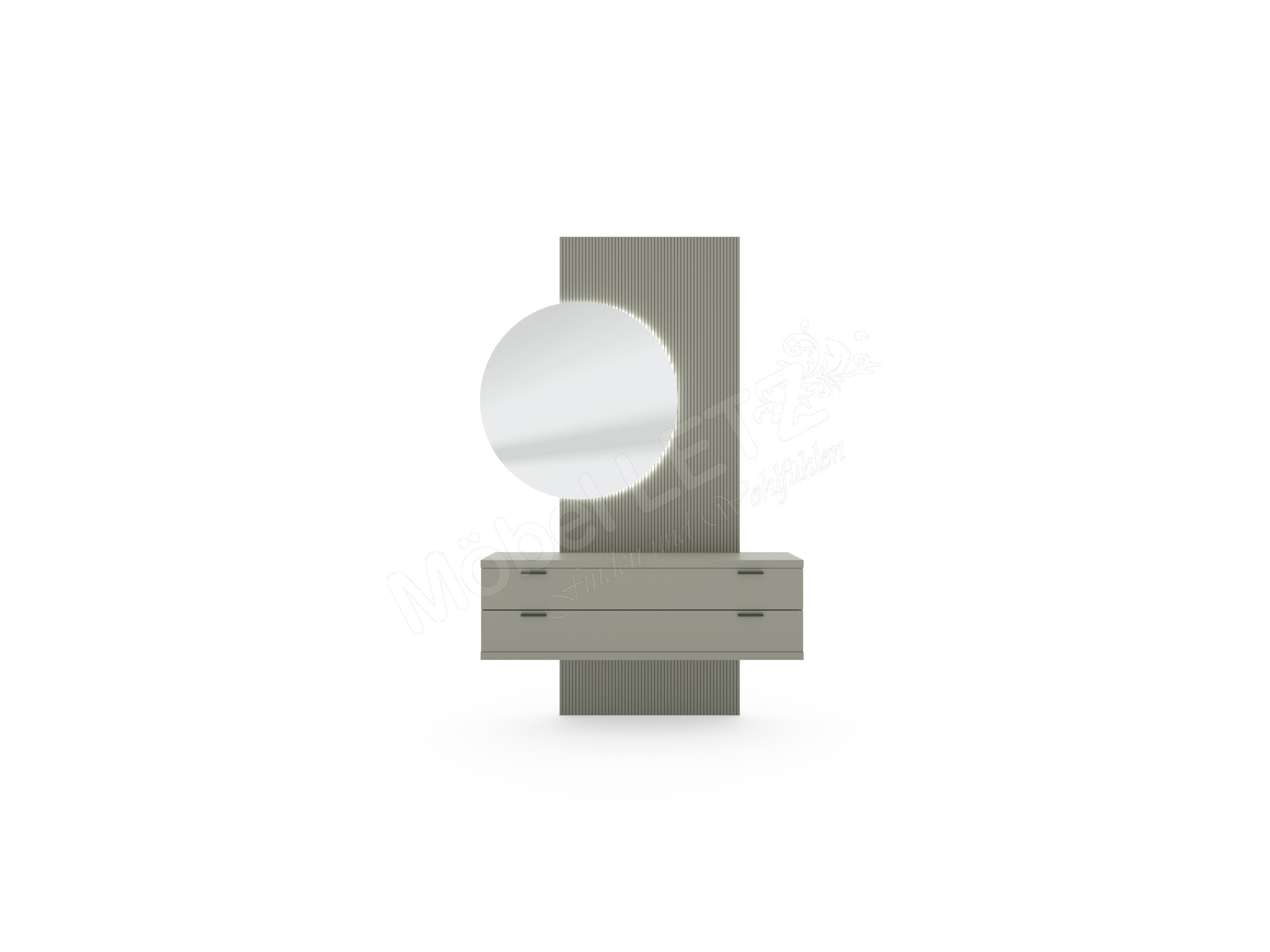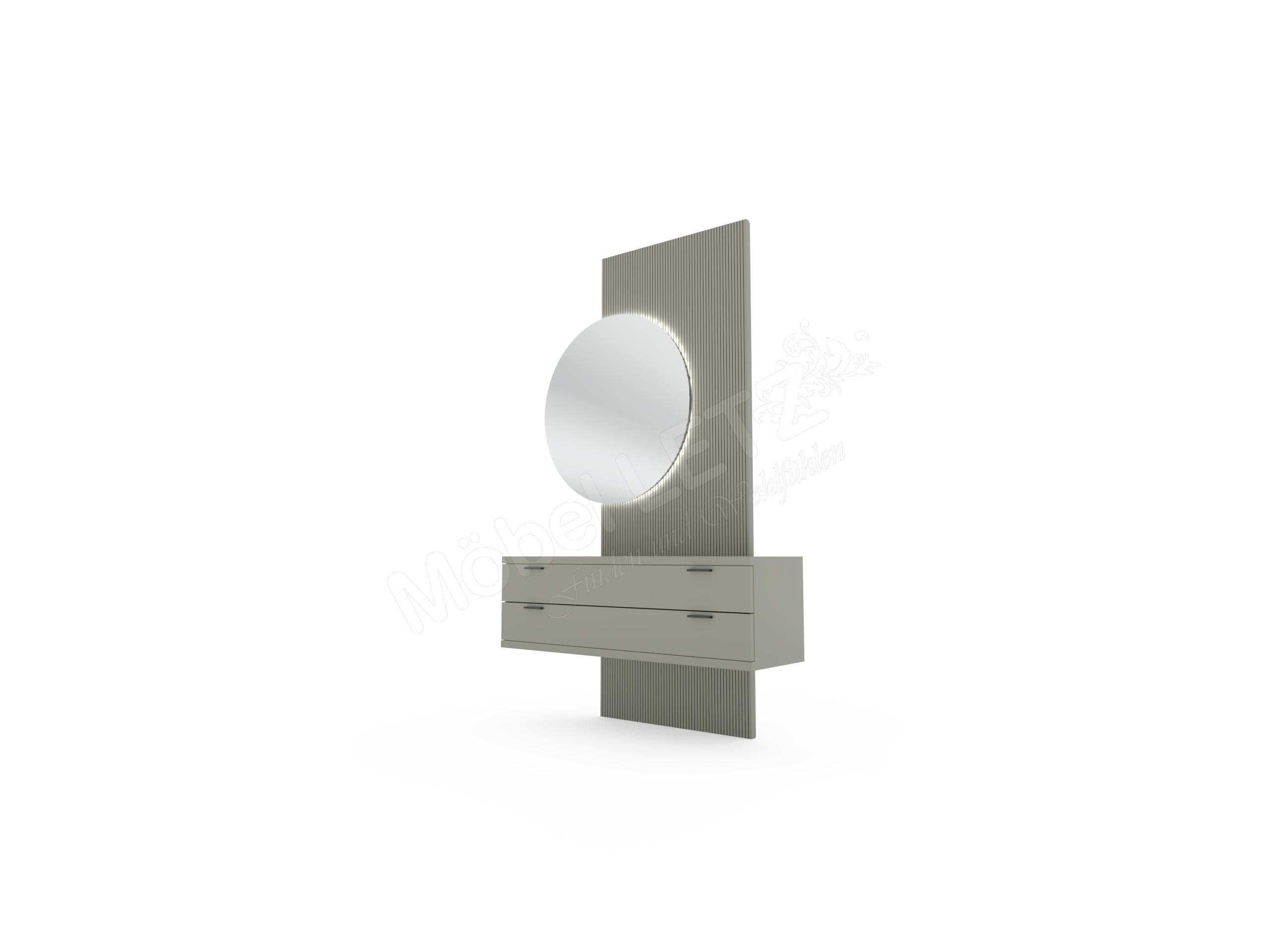 - Garderobe mit 1 Hängeelement mit 2 Schubkästen, 1 runden Spiegel mit LED-Beleuchtung und 1 Paneel