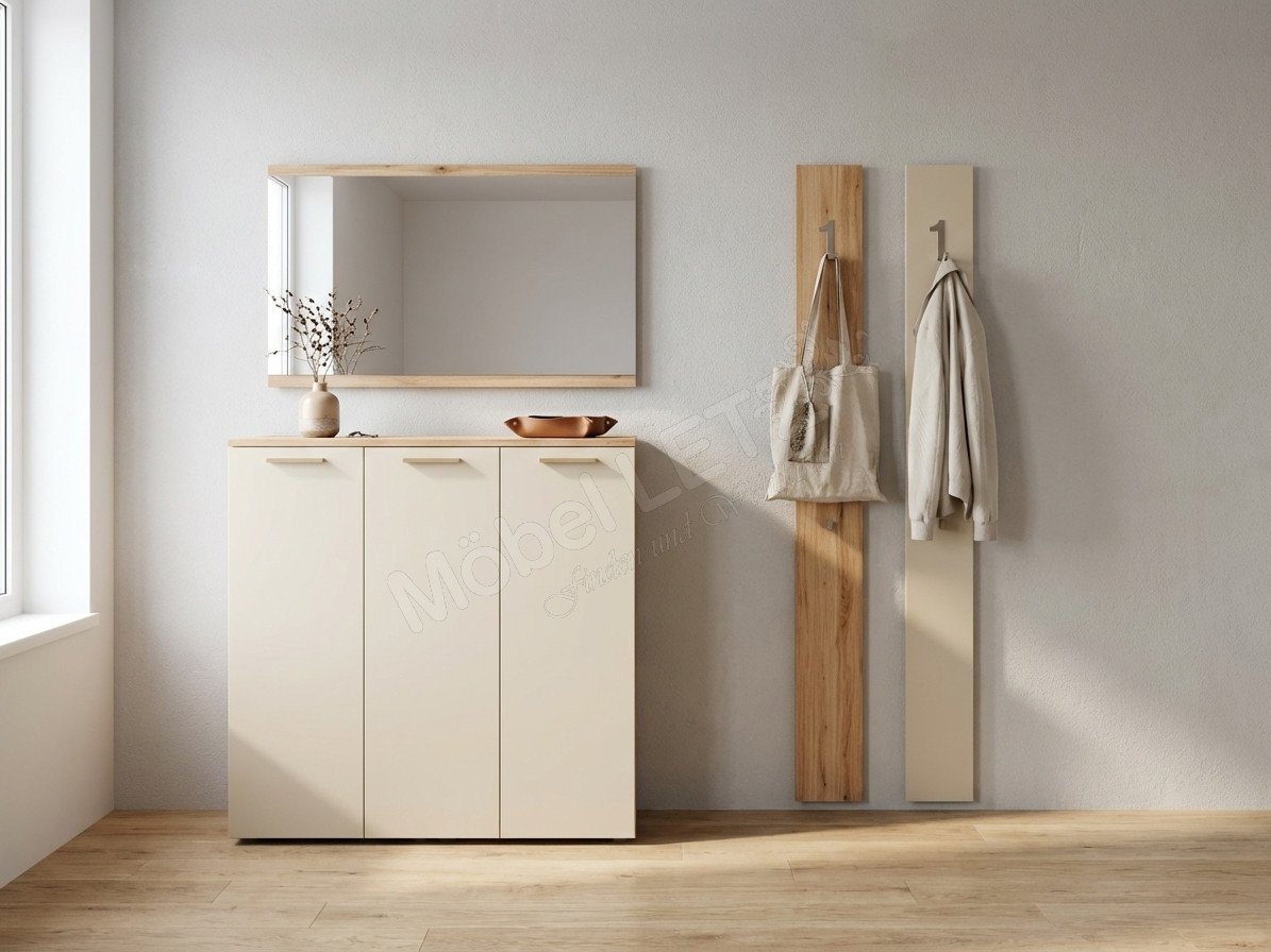 Sie kommen nach Hause, öffnen die Tür und werden von einem aufgeräumten, warmen Ambiente empfangen – genau dieses Gefühl vermittelt das Garderobenset Faro-Foyer von Wittenbreder vom ersten Moment an. Mit seiner harmonischen Kombination aus modernem Design und durchdachter Funktionalität wird das Garderobenset schnell zum stilvollen Mittelpunkt deines Eingangsbereichs. Die Kommode mit drei Türen bietet großzügigen Stauraum, hinter dem sich acht flexibel nutzbare Einlegeböden verbergen, sodass Schuhe, Taschen und Alltagsgegenstände ordentlich und griffbereit verstaut sind, während die matte, beige Front in sanfter Eleganz mit dem Korpus in authentischer Wildbuche Nachbildung zusammenspielt und eine warme, natürliche Atmosphäre schafft. Darüber fügt sich der Spiegel perfekt ins Gesamtbild ein, reflektiert das Licht und lässt den Raum offener wirken – ideal für den letzten prüfenden Blick, bevor Sie das Haus verlassen. Die beiden schlanken Paneele ergänzen das Set nicht nur optisch, sondern auch funktional: Mit jeweils einer stabilen Kleiderstange und zwei Haken bieten sie ausreichend Platz für Jacken, Mäntel oder Taschen und sorgen dafür, dass alles seinen festen Platz hat. So entsteht ein Flur, der Soe jeden Tag aufs Neue willkommen heißt und gleichzeitig für Struktur und Leichtigkeit sorgt. Faro-Foyer von Wittenbreder – ein durchdachtes Möbelensemble, das Design und Alltag mühelos vereint und dein Zuhause schon beim Ankommen besonders macht.