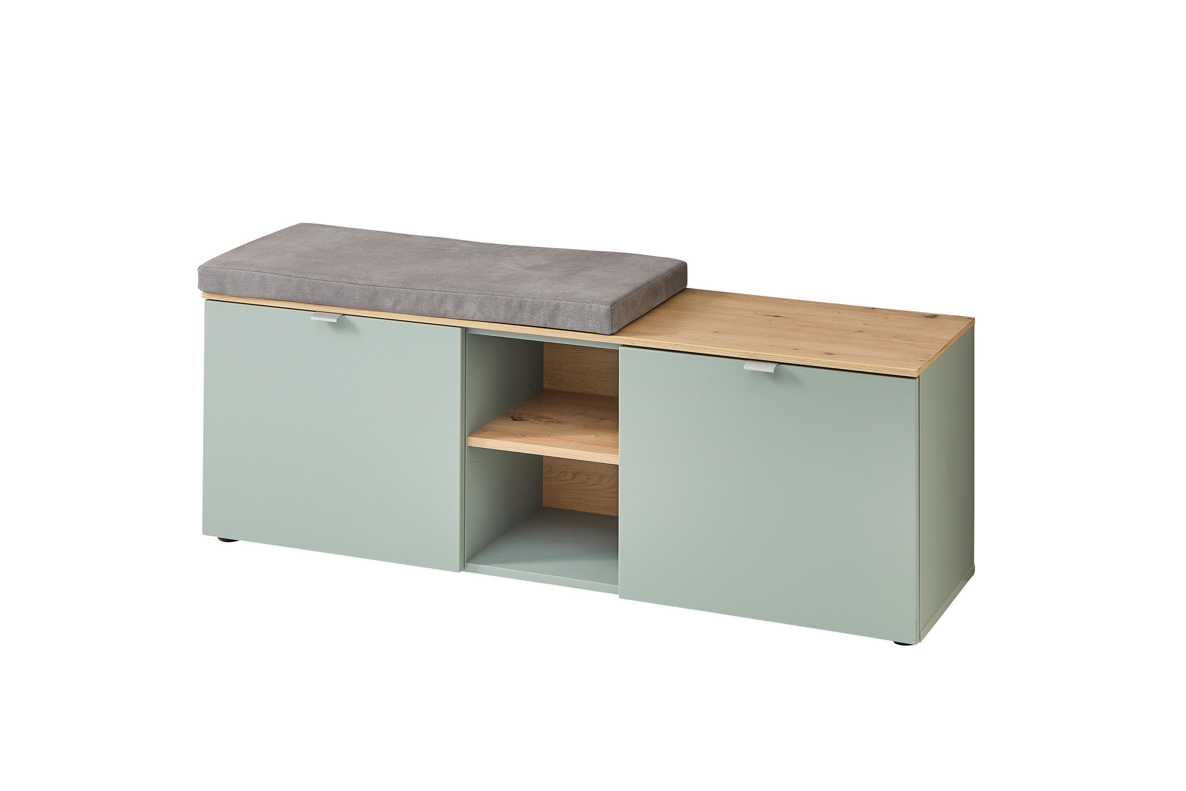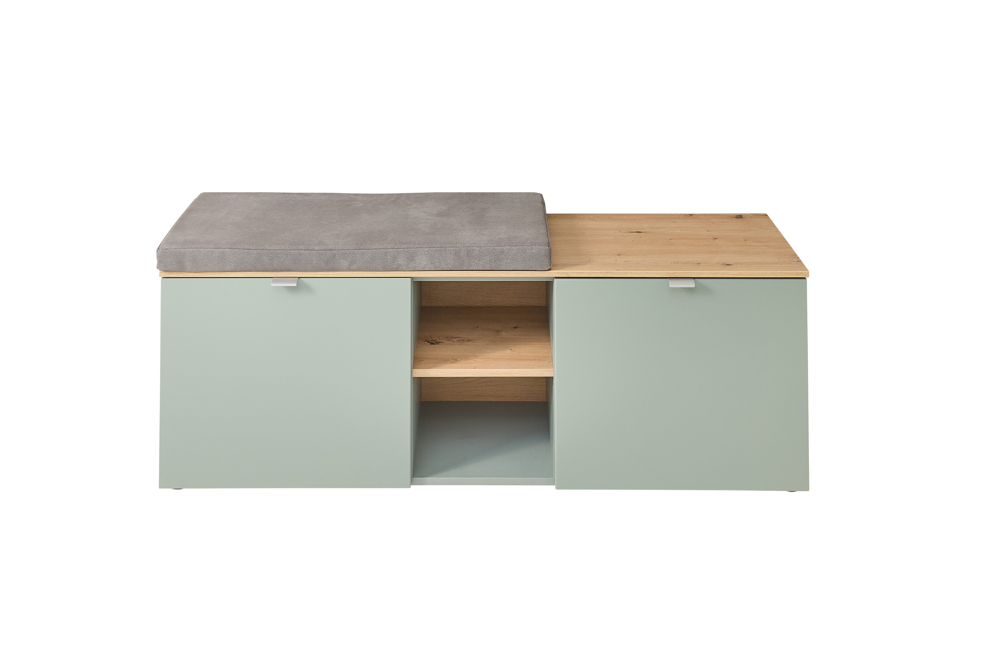 - Bank mit 2 Holztüren, 2 offenen Fächern, 3 Fachböden und 1 Sitzkissen