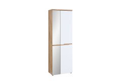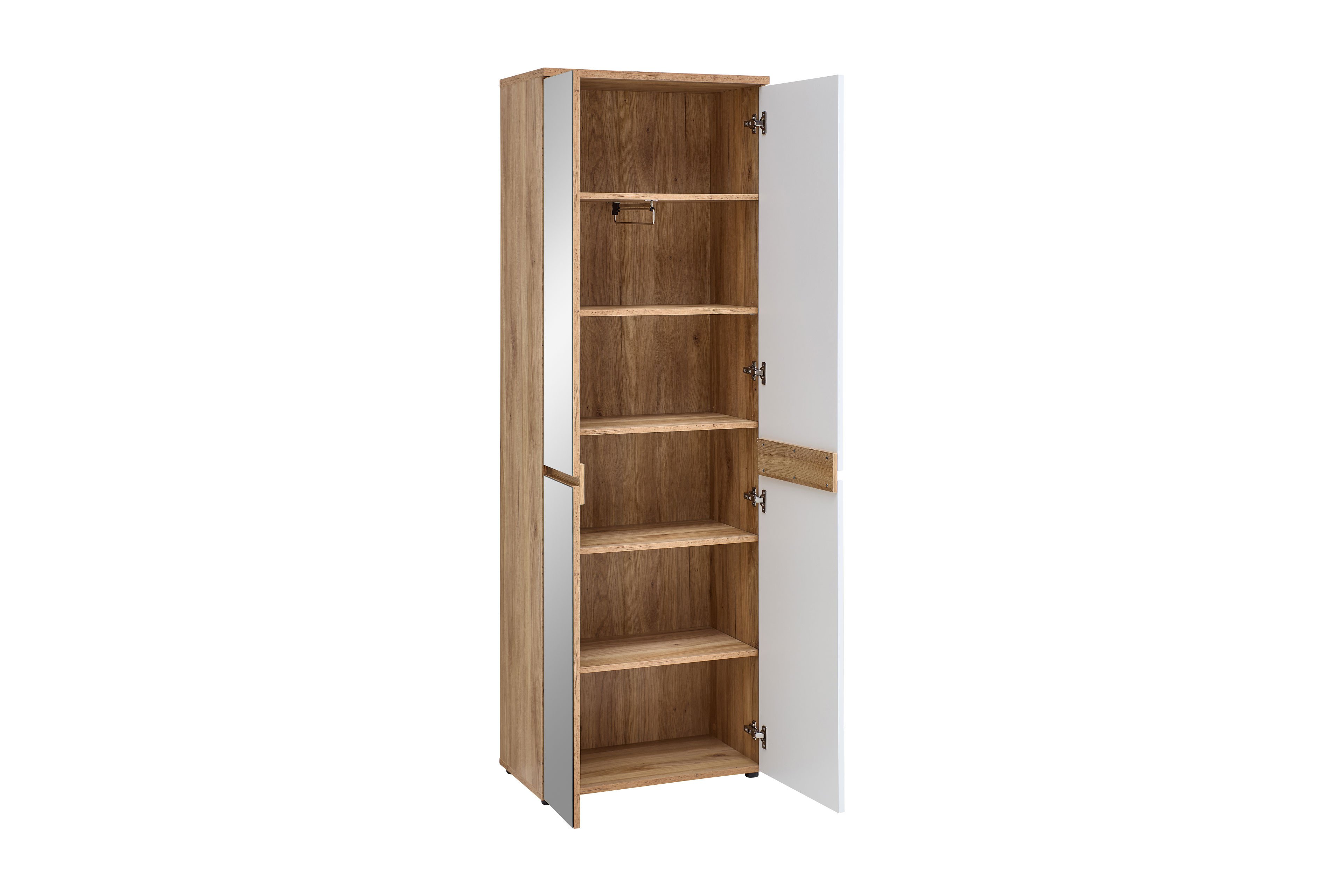- Garderobenschrank mit 1 Spiegeltür (links), 1 Holztür, 1 K-Boden (fest) mit ausziehbarer Kleiderstange und 4 Einlegeböden (verstellbar)