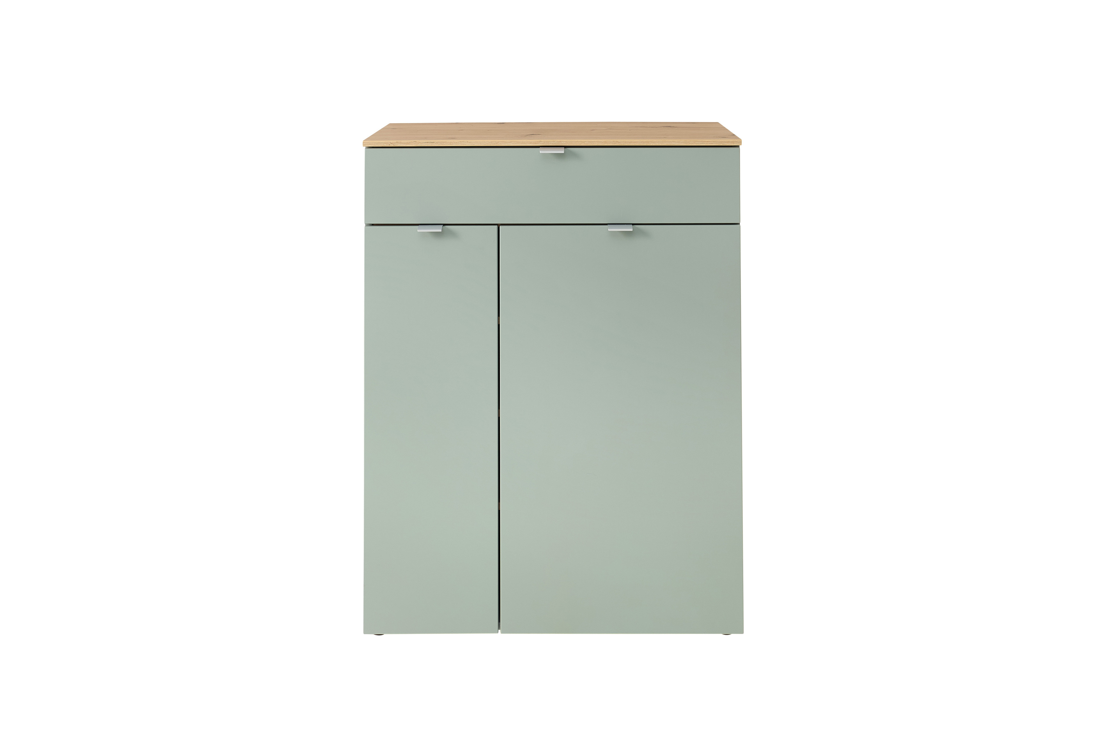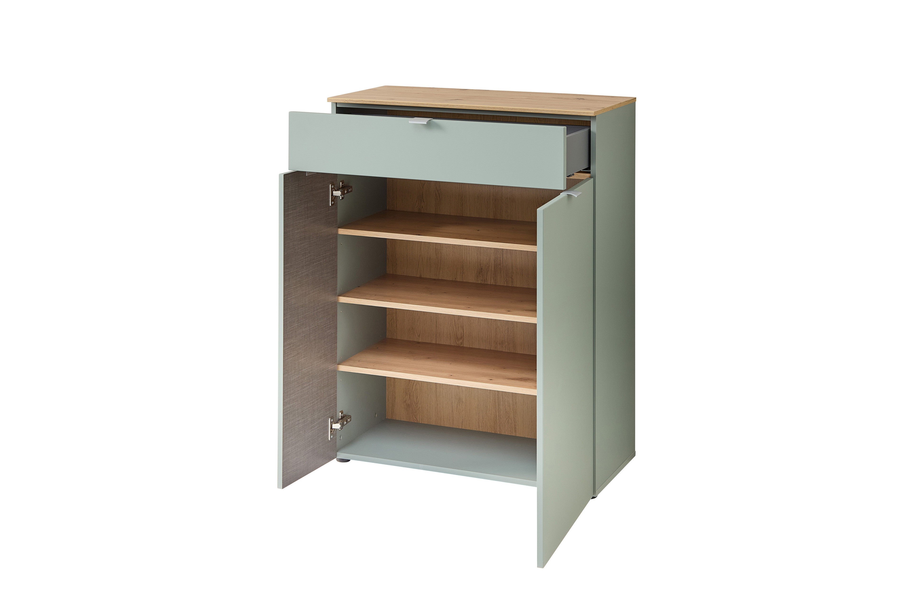 Die Flurkommode Bari von Innostyle verbindet stilvolle Eleganz mit praktischer Funktionalität und wird in jedem Eingangsbereich sofort zum Blickfang. Die sanft matten Fronten in Schilfgrün harmonieren perfekt mit dem warmen Akzenten in Artisan-Eiche, wodurch eine moderne, zugleich natürliche Atmosphäre entsteht, die Ihren Flur direkt einladender wirken lässt. Hinter den Türen offenbart Bari großzügigen Stauraum. Mehrere stabile Einlegeböden bieten reichlich Platz für Schuhe und Accessoires, während der Schubkasten ideal für Kleinteile wie Schlüssel oder Pflegeprodukte ist. Hochwertige Beschläge und eine angenehm glatte Oberfläche unterstreichen die langlebige Qualität des Möbels. Mit seiner klaren Formensprache fügt sich der Schuhschrank mühelos in verschiedenste Wohnstile ein und sorgt dafür, dass Ihr Zuhause schon beim Betreten ordentlich und harmonisch wirkt. Bari ist nicht nur ein funktionaler Helfer, sondern ein modernes Einrichtungselement, das Ihren Flur sichtbar aufwertet und jeden Tag aufs Neue begeistert. Innostyle - im Dienste schöner und moderner Einrichtung.