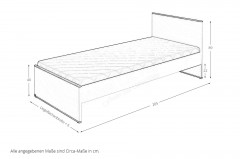 - Jugendbett: ohne Lattenrost und Matratze, Häupter + Bettseiten, Bettseitenhöhe ca. 39 cm, lichte Höhe unter dem Bett ca. 21,6 cm