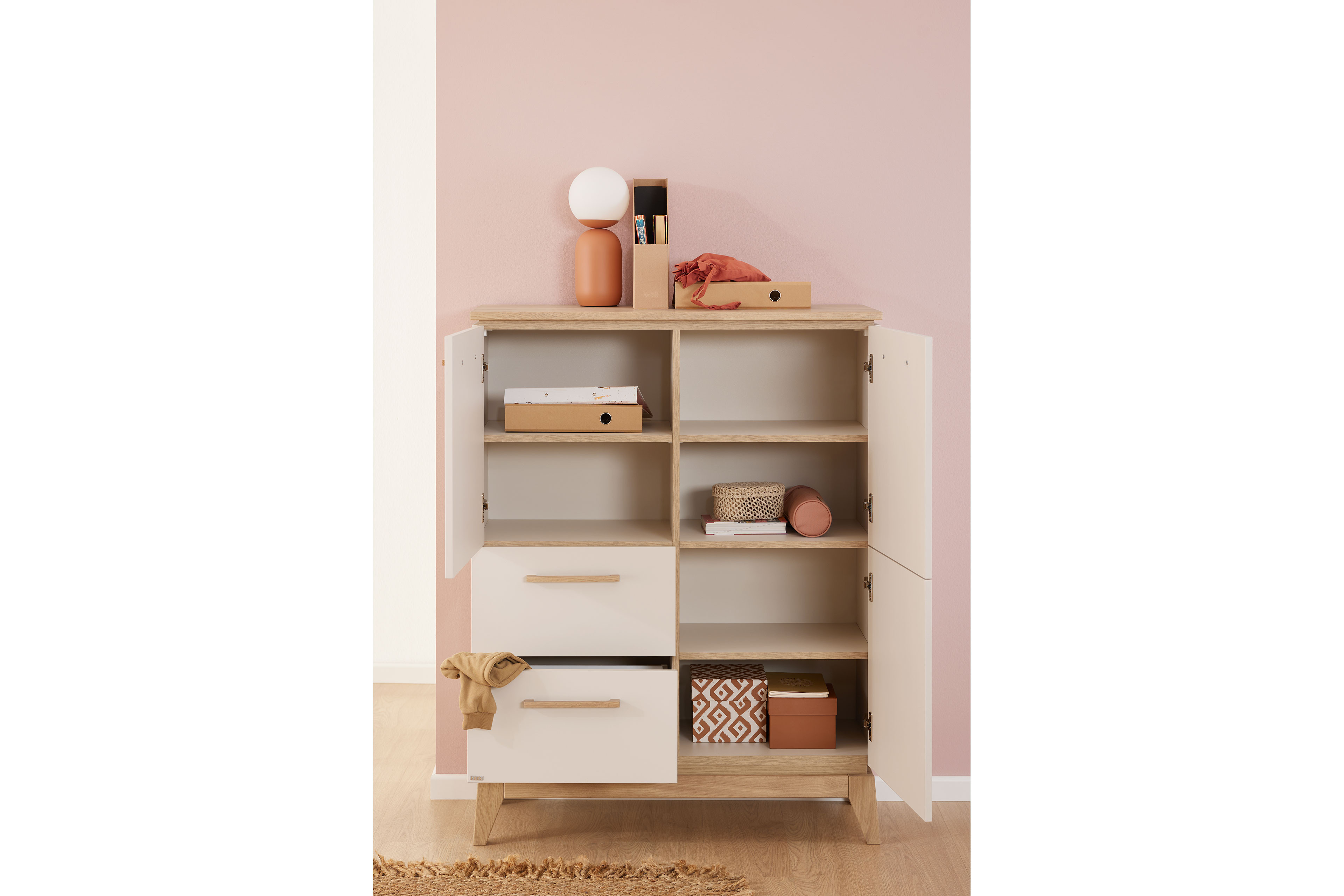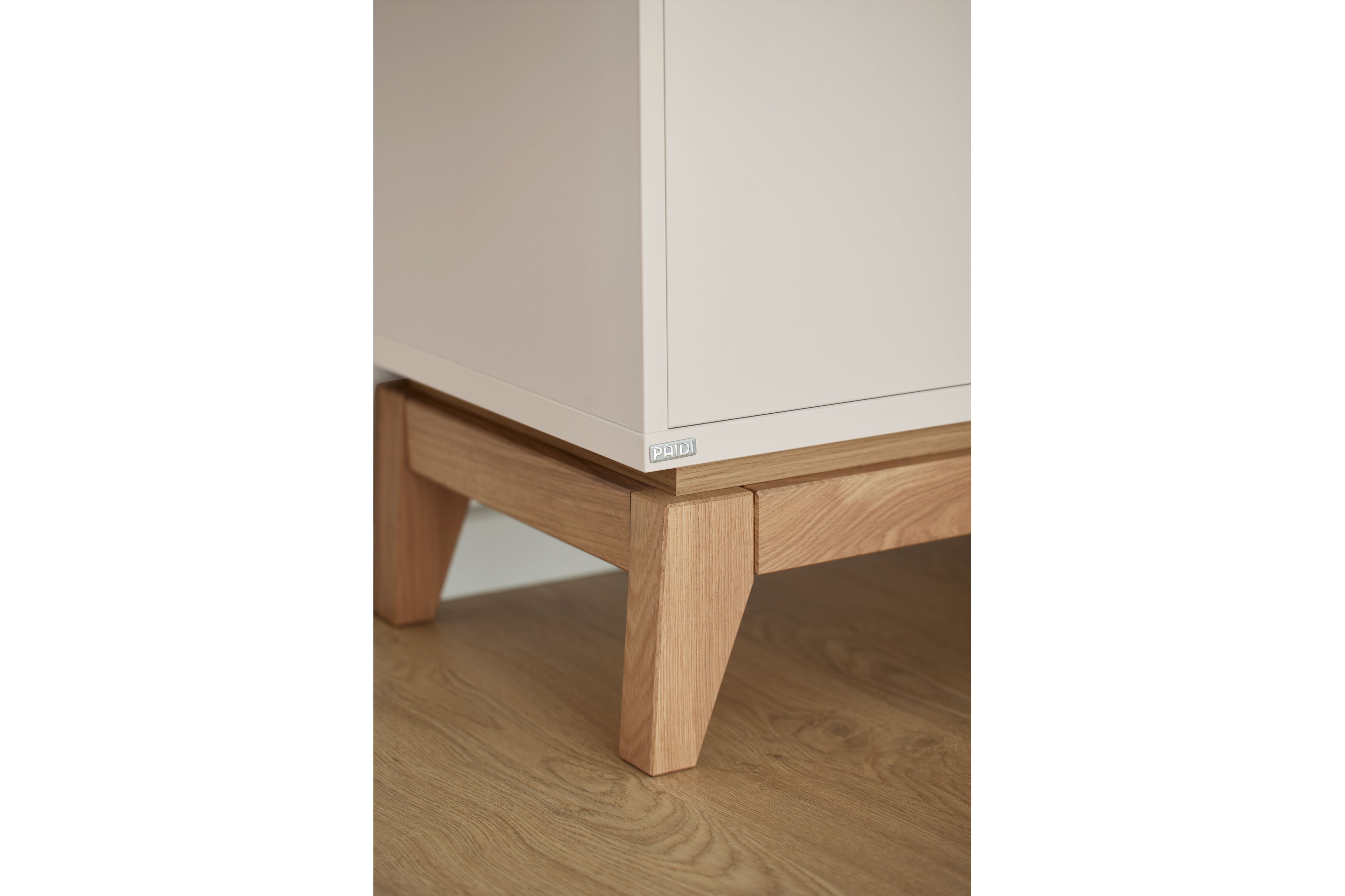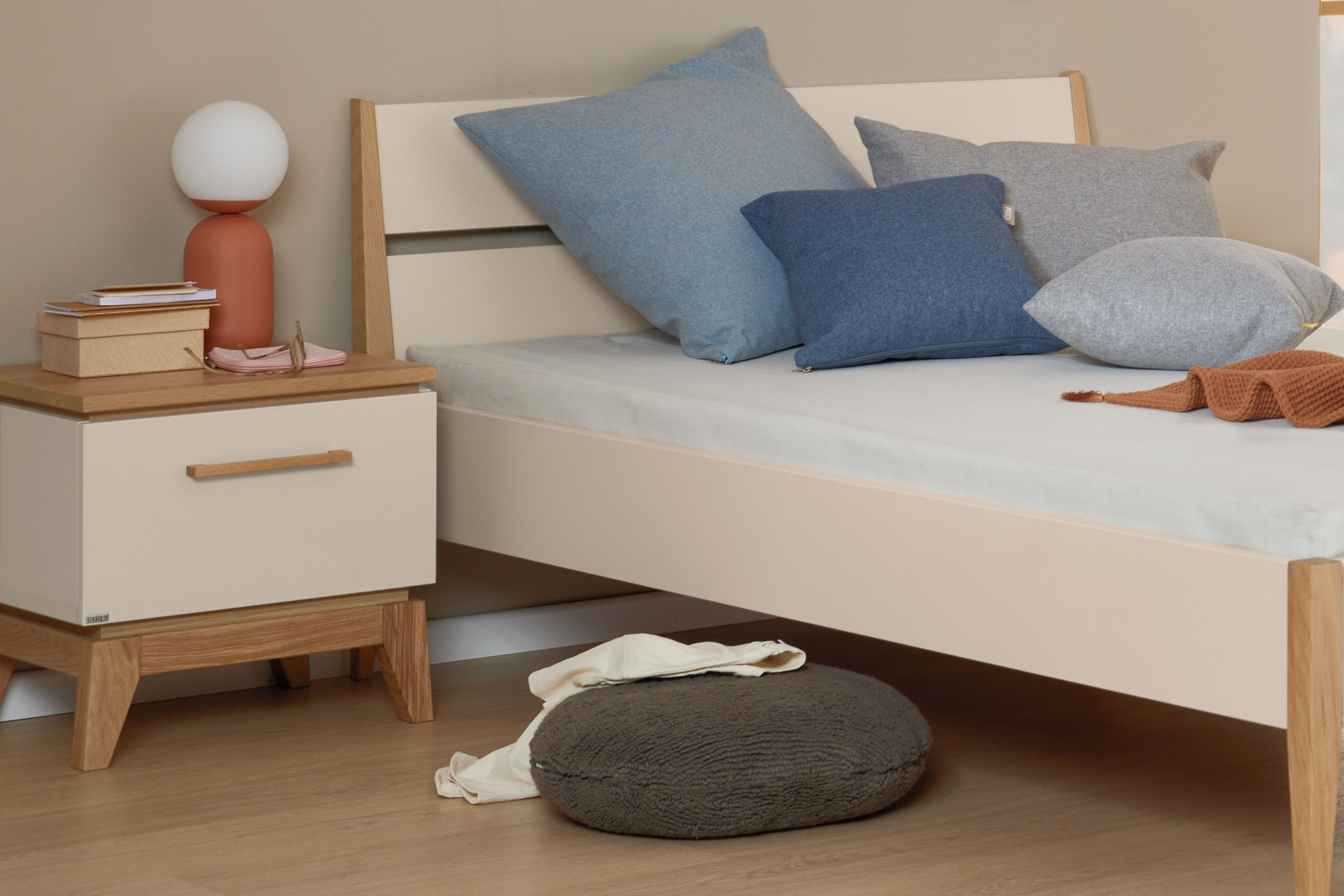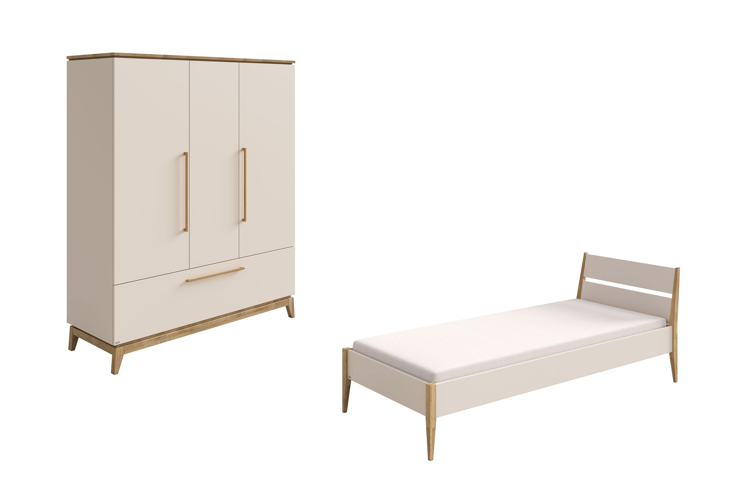 Das Paidi Jugendzimmer Stiene präsentiert sich in der eleganten sowie hellen Ausführung Cashmere-Beige mit Absetzungen aus massivem Eichenholz und verbindet zeitloses Design mit angenehmer Komfortausstattung. Der Kleiderschrank 3T1S kommt mit drei verkürzten Türen, einer praktischen Schublade mit geteilter Innenaufteilung und einer strukturierten Innenausstattung daher, die das Verräumen von sämtlichen Textilien erleichtert. Links befindet sich ein 60er Wäschefach mit drei Einlegeböden, mittig ein 46er Wäschefach mit ebenfalls drei Böden und rechts ein 60er Kleiderfach mit einem Einlegeboden sowie einer Kleiderstange. Die Traumliege besticht durch ihr geteiltes Kopfteil und bietet eine komfortable Schlaffläche von 90 x 200 cm. Optional erhalten Sie über unsere Zusatzattribute auch einen passenden Lattenrost, um den Liegekomfort abzurunden und ergänzende Möbelstücke wie die Nachtkonsole, die Wandboxen, das Highboard und das Standregal. Alle Elemente des Jugendzimmers Stiene von Paidi sind mit unserem Online-Möbelplaner frei miteinander kombinierbar, sodass Sie sich Ihre wunschgerechte und bedarfsgemäße Einrichtung auch gern ganz individuell konfigurieren können. So lässt sich die Zusammenstellung an Raumgröße, Nutzungsbedarf und Stilwunsch anpassen. Stiene von Paidi ... Design trifft Gemütlichkeit im Jugendzimmer.