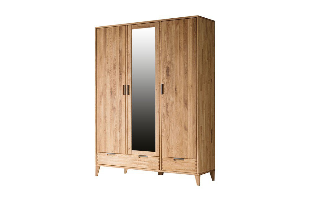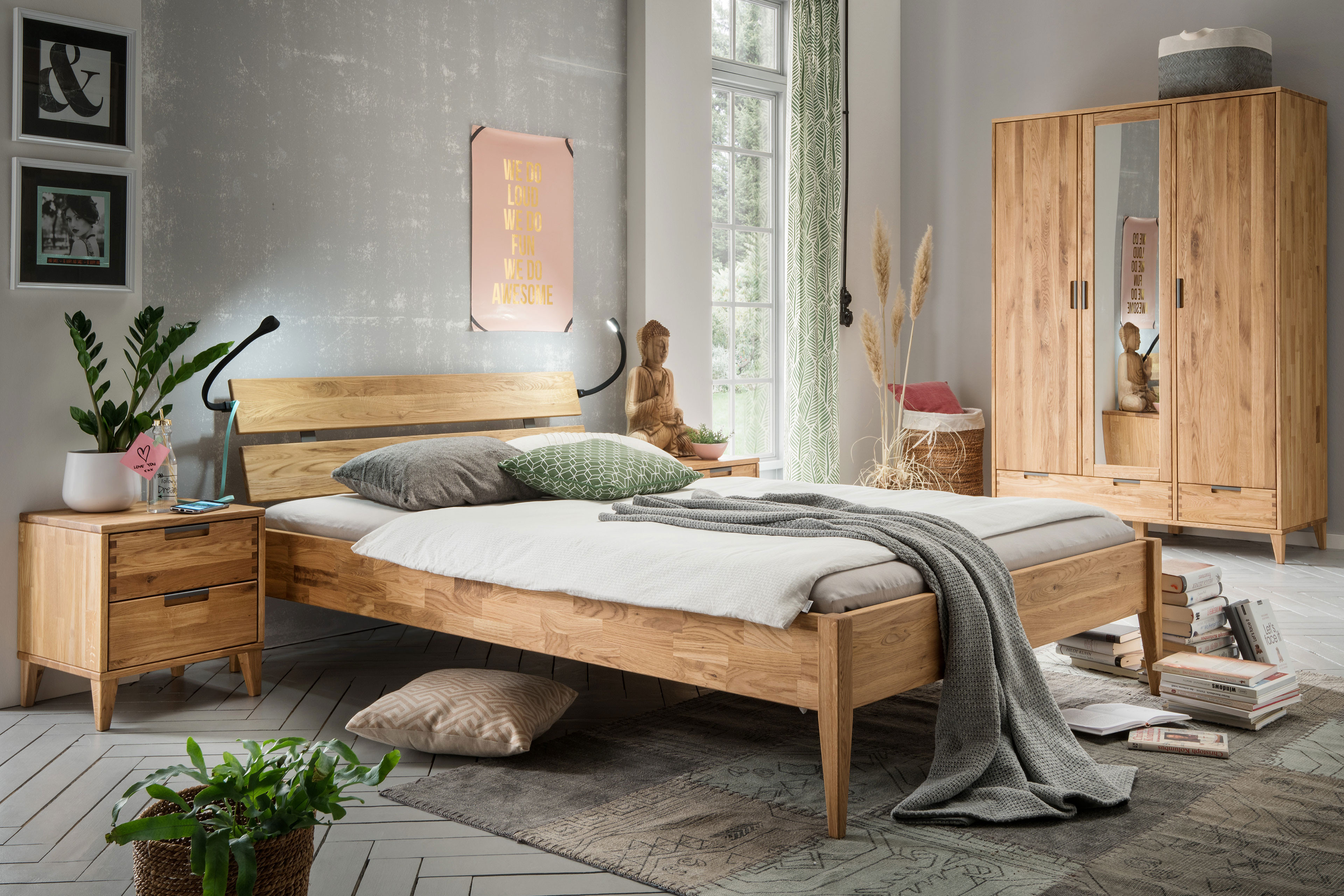 Das 3-teilige Jugend- und Schlafzimmer-Set aus dem vielseitigen Echtholz-Einrichtungsprogramm Mido von SKALIK verbindet zeitlose Ästhetik mit praktischer Funktionalität. Die Kombination ist aus massivem Eichenholz gefertigt und zeigt sich mit natur-farben geölten Oberflächen, die jedes Interieur auf stilvolle Weise bereichern. Der Kleiderschrank mit drei Türen überzeugt durch klare Linien: zwei Holztüren verleihen eine warme, einladende Ausstrahlung, während die Spiegeltür für eine optische Raumvergrößerung sorgt und Ihnen die Möglichkeit schenkt, das gewählte Outfit mal im Ganzen betrachten zu können. Zwei gedämpft schließende Schubkästen bieten ausreichend Ordnungsmöglichkeiten für Kleidung und Accessoires. Das Bett hat eine Liegefläche von 90 x 200 cm und sorgt mit einer Einstiegshöhe von etwa 45 cm für eine komfortable Zugänglichkeit. Passendes Bettzubehör bildet die ideale Basis für eine ergonomische Schlafposition - schauen Sie sich die Vielzahl der Lattenroste und Matratzen in unserem Online-Shop an. Die Nachtkonsole komplettiert das Set: Zwei gedämpft schließende Schubkästen ermöglichen die Unterbringung von Utensilien wie Lesebrille, Buch und Smartphone in Griffnähe. Besonderer Mehrwert liegt in den Zusatzoptionen: Durch weitere Holztöne, Bettgrößen und Griffausführungen lässt sich das Mido-Programm von SKALIK individuell an Ihre Räume und Vorlieben anpassen. Entdecken Sie Qualität und zeitlose Eleganz - für Räume, die Ruhe, Ordnung und Wertbeständigkeit ausstrahlen.
