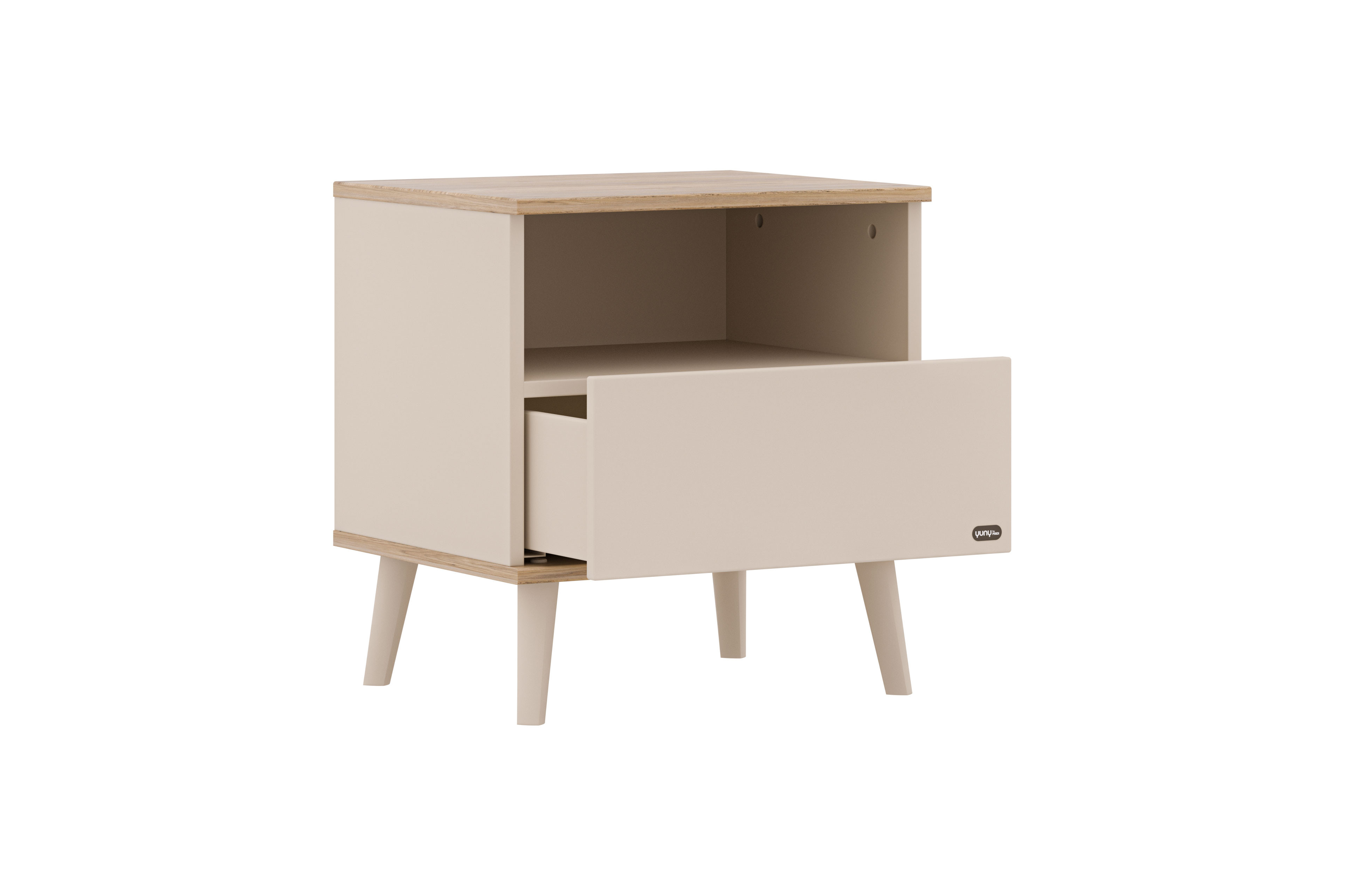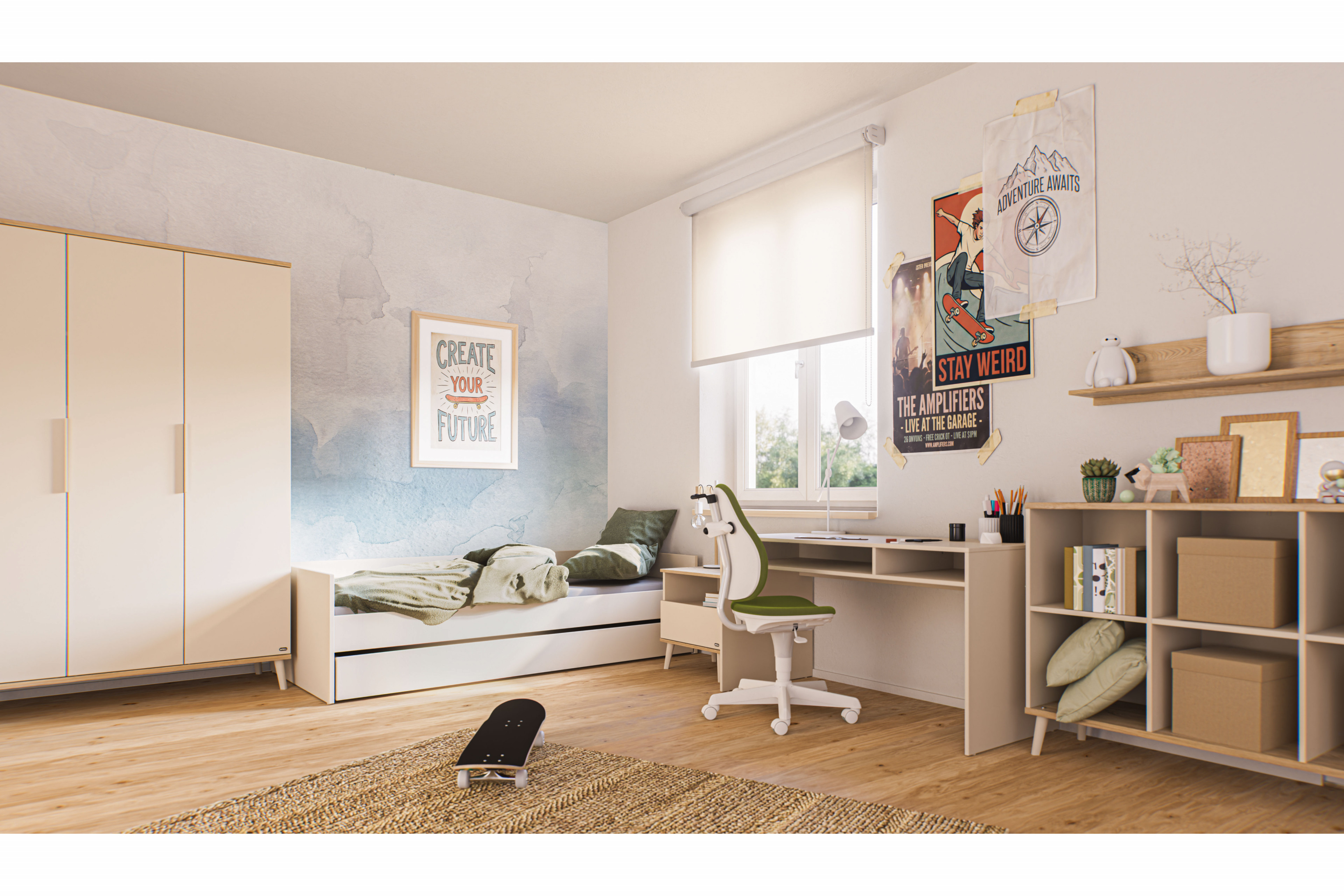 Entdecken Sie in diesem Angebot das Jugendzimmer-Set aus der Serie Hazel von YUNY by Paidi - diese Kombination verbindet gekonnt zweckmäßige Funktionen mit zeitloser Optik. Platz für Kleidungsstücke bietet der etwa 130 cm breite Schrank mit drei Türen, die durch ihre integrierte Dämpfung angenehm leise schließen. Hinter den drei Schranktüren verbergen sich ein schmales Wäschefach mit drei Fachböden sowie ein breites Kleiderfach mit einem Boden und zwei Kleiderstangen - perfekt, um alle Kleidungsstücke ordentlich unterzubringen. Die Kojenliege hat eine Schlaffläche von 90x200 cm und punktet zudem mit einer überzeugenden Funktion: Sie hat einen Schubkasten, der entweder zum Verstauen von beispielsweise Bettzeug oder als schnell verfügbares Gästebett nutzbar ist. Ihnen gefällt die abgebildete Komplett-Einrichtung? Dann können Sie sowohl die Nachtkonsole als auch den Schreibtisch mit Stauraum und das etwa 124 cm breite Sideboard mit sechs offenen Fächern direkt hier im Artikel über unsere Zusatzoptionen zum Warenkorb hinzufügen. Passendes Bettzubehör ist ebenfalls direkt über unseren Online-Shop bestellbar. Die hellen Oberflächen im Farbton Cashmere-Beige in Verbindung mit den natürlich wirkenden Akzenten in Eiche-Montana-Nachbildung lassen eine einladend wohnliche Atmosphäre entstehen. Sie möchten die Zusammenstellung gern individuell gestalten? Dann nutzen Sie dafür unseren Konfigurator - hier können Sie sich aus unterschiedlichen Typen ganz einfach eine Einrichtung planen, die Ihren individuellen Wünsche entspricht. Hazel aus der Kollektion YUNY by Paidi - praktische Lösungen und maximale Flexibilität.