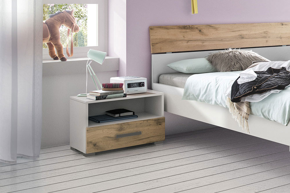 - Bettkonsole: 1 offenes Fach, 1 Schubkasten