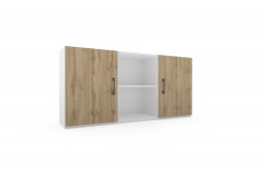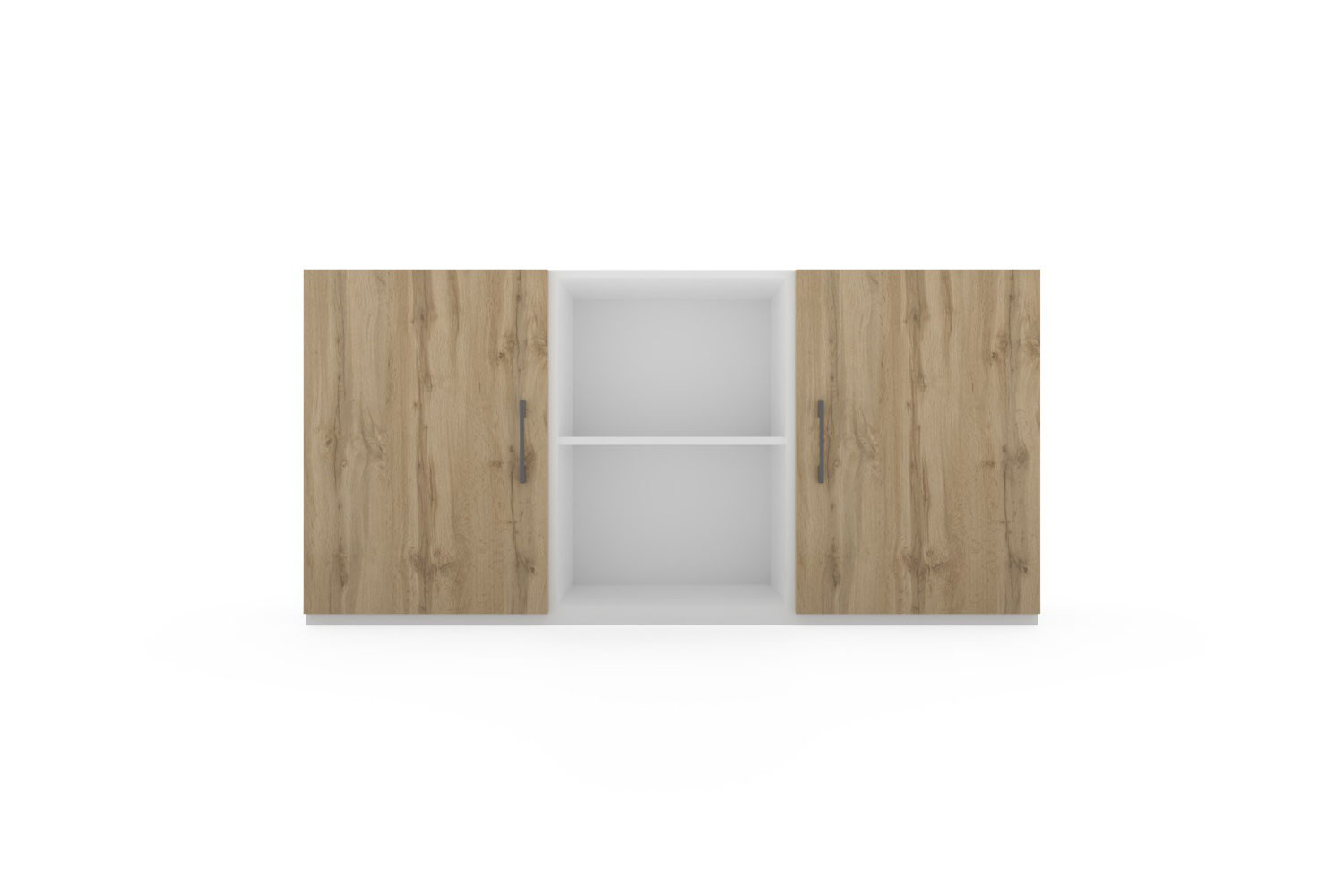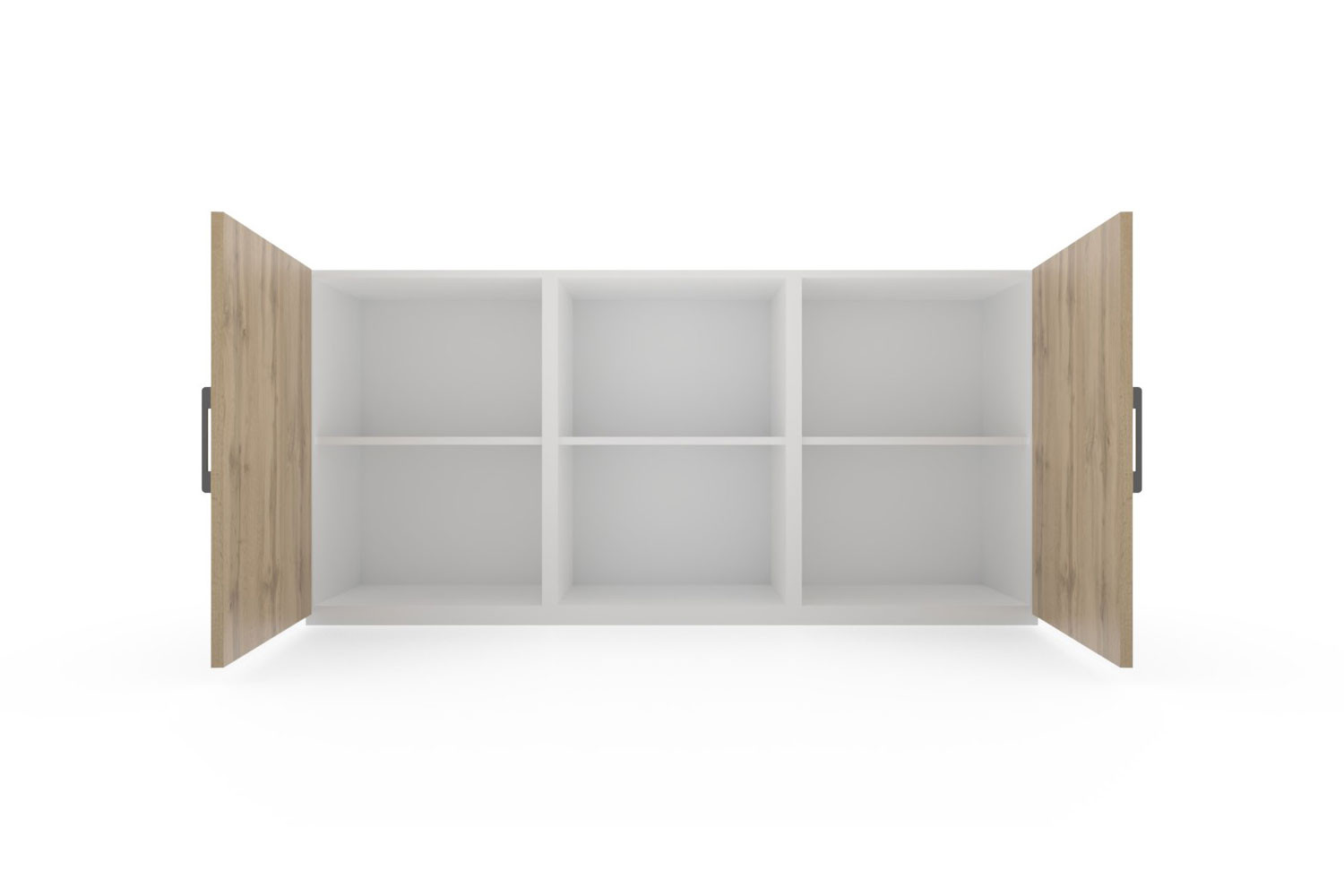 Die abgebildete Kommode aus der YOUNG LIVING-Kollektion cadre.plus von Röhr-Bush bietet ein hohes Maß an gestalterischer Freiheit. Sie ist eine gelungene Kombination aus drei separat stellbaren Elementen und eröffnet Ihnen vielfältige Möglichkeiten zur individuellen Raumgestaltung - ob als kompakte Einheit oder als flexibel arrangierbare Einzelmodule. Das linke und das rechte Element ist jeweils mit einer Tür versehen, hinter der sich ein Einlegeboden befindet. Das mittig platzierte Regal mit zwei offenen Fächern bringt Leichtigkeit in das Gesamtbild und eignet sich beispielsweise ideal zur Präsentation von Büchern, dekorativen Objekten oder persönlichen Accessoires. Der Korpus sowie das Regalelement sind in einem zeitlosen Weiß gehalten, während die Türfronten in ressourcenschonender Votan-Eiche-Nachbildung einen warmen, natürlichen Kontrast setzen. Mit einem Gesamtmaß von ca. 150 cm Breite und ungefähr 73 cm Höhe fügt sich die Kommode aus dem Jugendzimmer-Programm cadre von Röhr-Bush auch mühelos in verschiedenste Wohnbereiche ein, egal ob im Wohn-, Gäste-, Speise- oder Schlafzimmer, im Eingangsbereich oder Homeoffice. Darüber hinaus lassen sich über unsere Zusatzoptionen individuelle Anpassungen vornehmen: Die Türen sind auf Wunsch in einer alternativen Ausführung wählbar und passende Dämpfer sorgen für ein sanftes Schließen. cadre.plus von Röhr-Bush - kontrastreich kombinieren ...