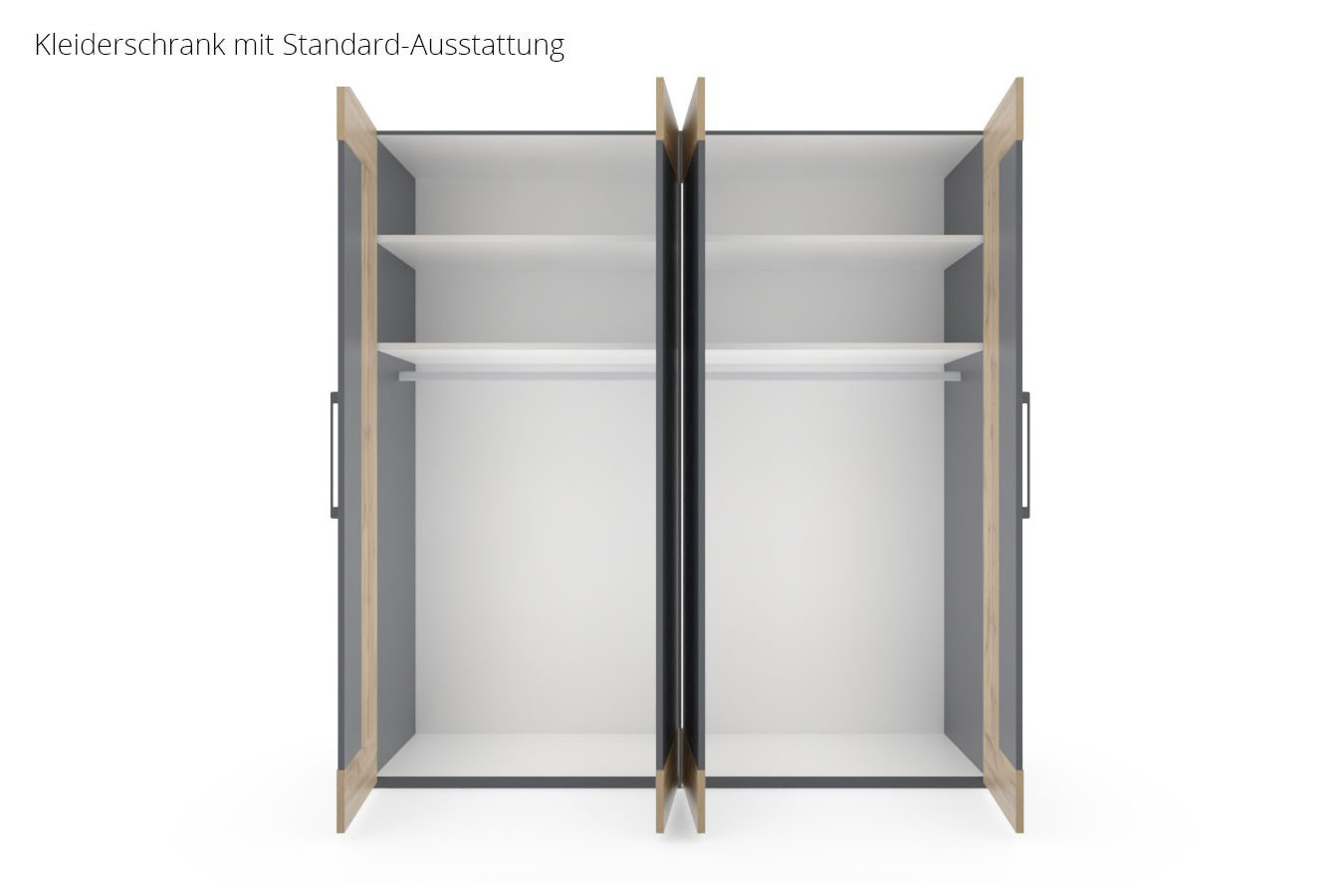 In der breitesten Kleiderschrank-Variante, die das Einrichtungsprogramm cadre.plus aus der YOUNG LIVING-Kollektion von Röhr-Bush zu bieten hat, präsentiert sich der hier vorgestellte Ordnungshüter. Mit seinem anthrazit-farbenen Korpus und seiner gleichfarbigen Front sorgt er für ein edles Erscheinungsbild, das durch die ressourcenschonende Holznachbildung in Eiche eingerahmt wird und dadurch einen natürlichen Touch erhält. Die anthrazitfarbenen Bügelgriffe passen sich der dunklen Oberfläche an und vereinfachen das Öffnen und Schließen der vier Schranktüren. Hinter diesen befinden sich zwei Segmente, die mit jeweils zwei Fachböden und einer Kleiderstange ausgestattet sind. Somit stellt der Schrank mit seiner Standard-Ausstattung Platz für Pullover, T-Shirts, Hosen und Jacken bereit. Je nachdem, wie Sie die Kleidungsstücke bevorzugt aufbewahren, können Sie über unsere Zusatzoptionen unterschiedliches Zubehör erwerben, um den Schrank-Innenraum nach Ihren Wünschen zu gestalten. Ob weitere Fachböden oder praktische Innenschubladen - hier können Sie nach Bedarf die gewünschten Komponenten auswählen. Viele weitere Möbelstücke aus dem Programm cadre.plus von Röhr-Bush können Sie in unserem Online-Shop und in unserem Konfigurator entdecken.