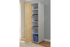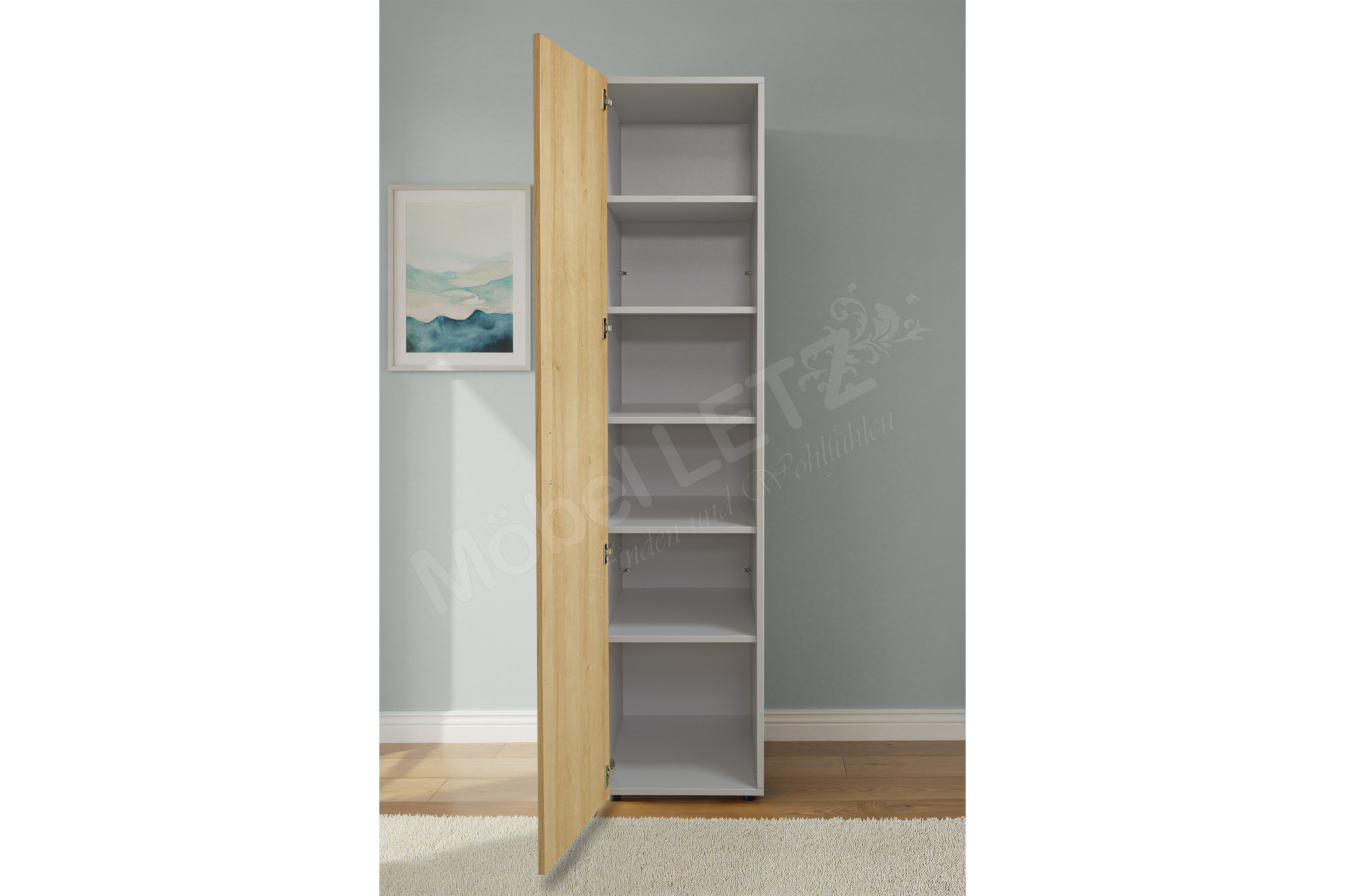 Dieser schmale Drehtürenschrank aus der Programmreihe level 2 von Rudolf Möbel ist nahezu überall einsetzbar. Aufgrund seiner Breite von gerade mal etwa 46 cm ist er nicht nur der ideale Schrank in kleineren Zimmern, sondern auch der perfekte Nischenschrank. Falls also nicht allzu viel Stellplatz im Raum vorhanden ist, sollte jede Stauraum-Möglichkeit genutzt werden und auch eventuell ein schmaler Lückenfüller wie dieser praktische Rudolf-Schrank zum Einsatz kommen. In unserem Angebot wird Ihnen der schmale Wäscheschrank mit einem hellgrauen Korpus und einer Front in Natureiche Nachbildung vorgestellt. Dabei schmückt sich die leise schließende Drehtür mit einer etwa 26 cm breiten und ungefähr 207 cm hohen Spiegelfläche. Hinter der Tür befinden sich fünf Einlegeböden. Level 2 von Rudolf Möbel bietet für alle Charaktere stilbewusste Lösungen bis ins kleinste Detail.