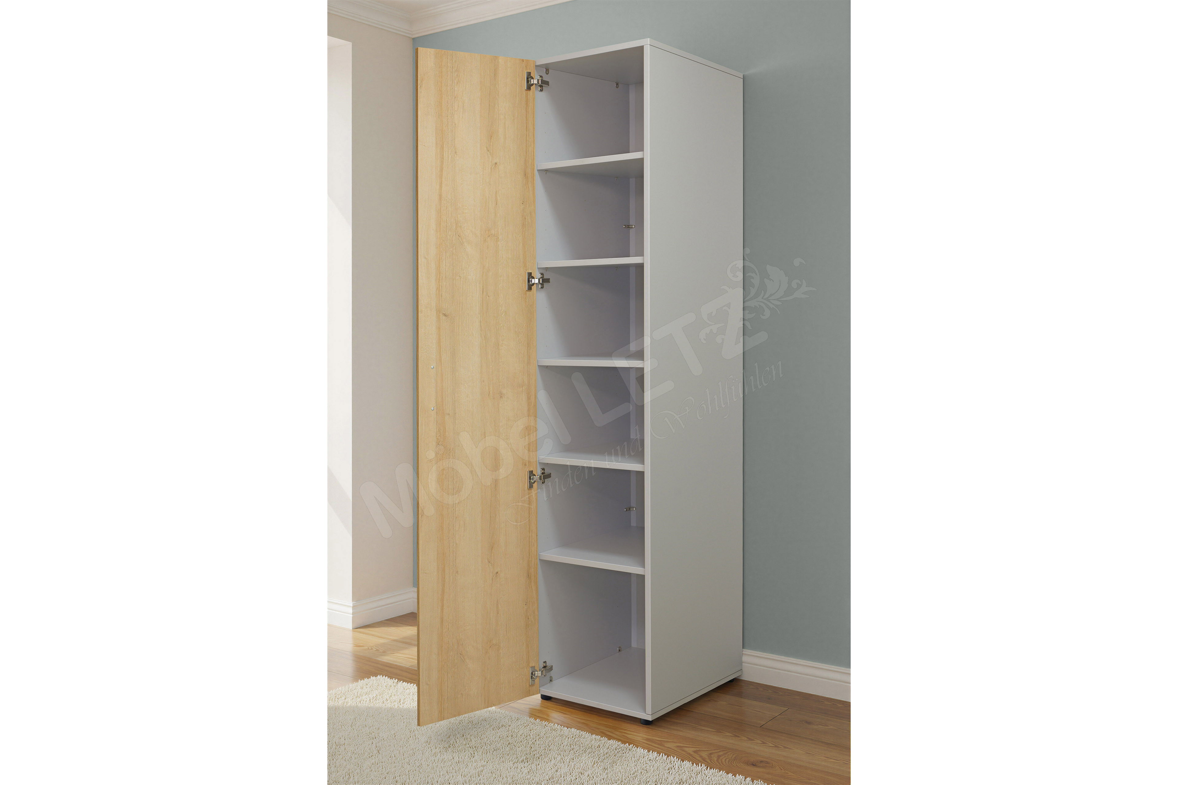 Dieser schmale Drehtürenschrank aus der Programmreihe level 2 von Rudolf Möbel ist nahezu überall einsetzbar. Aufgrund seiner Breite von gerade mal etwa 46 cm ist er nicht nur der ideale Schrank in kleineren Zimmern, sondern auch der perfekte Nischenschrank. Falls also nicht allzu viel Stellplatz im Raum vorhanden ist, sollte jede Stauraum-Möglichkeit genutzt werden und auch eventuell ein schmaler Lückenfüller wie dieser praktische Rudolf-Schrank zum Einsatz kommen. In unserem Angebot wird Ihnen der schmale Wäscheschrank mit einem hellgrauen Korpus und einer Front in Natureiche Nachbildung vorgestellt. Dabei schmückt sich die leise schließende Drehtür mit einer etwa 26 cm breiten und ungefähr 207 cm hohen Spiegelfläche. Hinter der Tür befinden sich fünf Einlegeböden. Viele weitere Kastenmöbel sowie Betten finden Sie im modellzugehörigen Planer, der Ihnen die Möglichkeit schenkt, sich nach Belieben das passende Möbelstück auszusuchen oder sich eine komplette Zimmer-Einrichtung zusammenzustellen. Level 2 von Rudolf Möbel bietet für alle Charaktere stilbewusste Lösungen bis ins kleinste Detail.