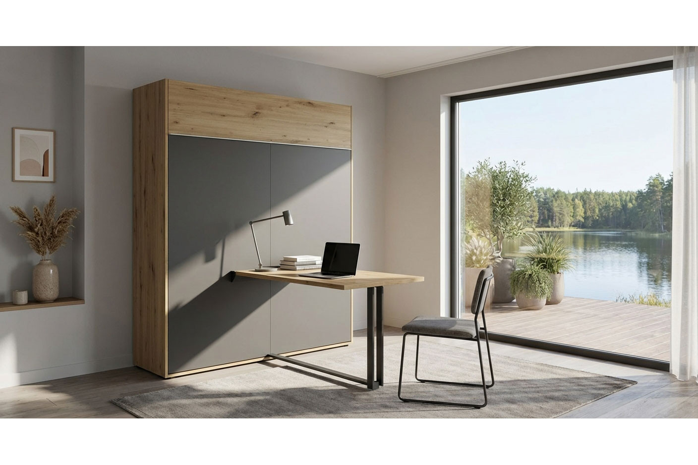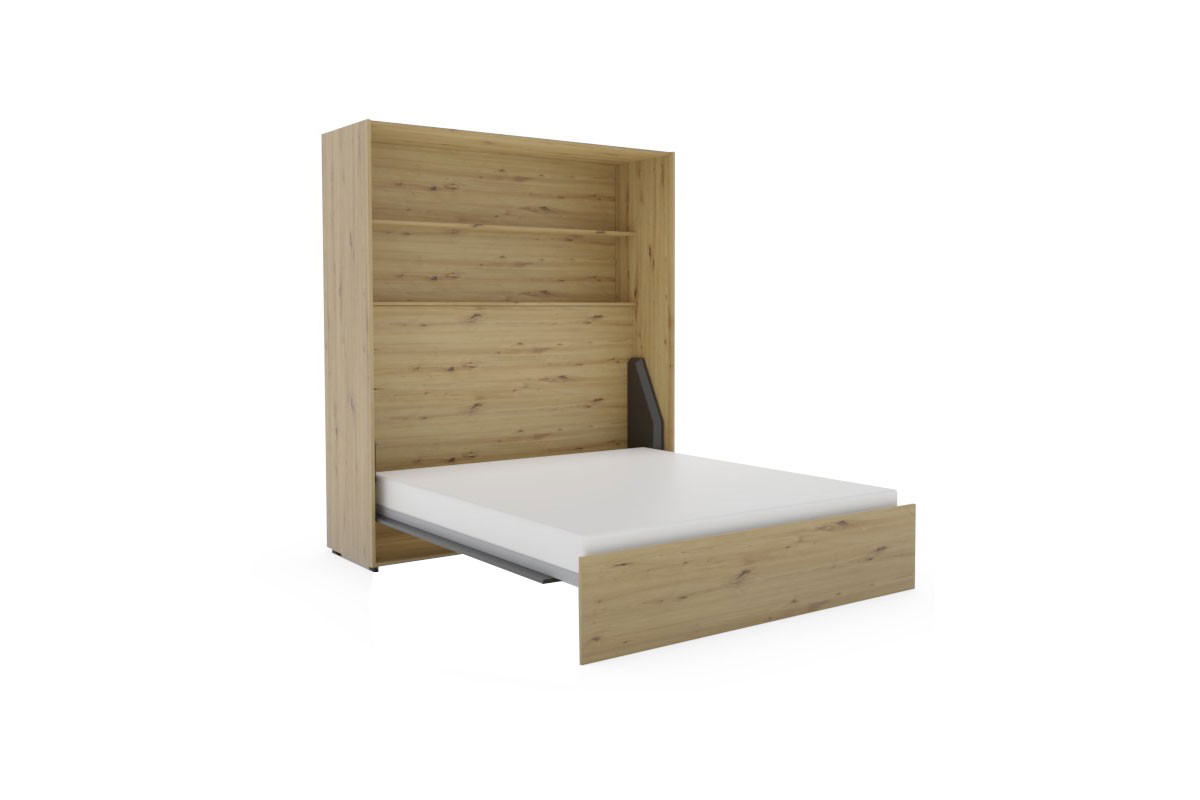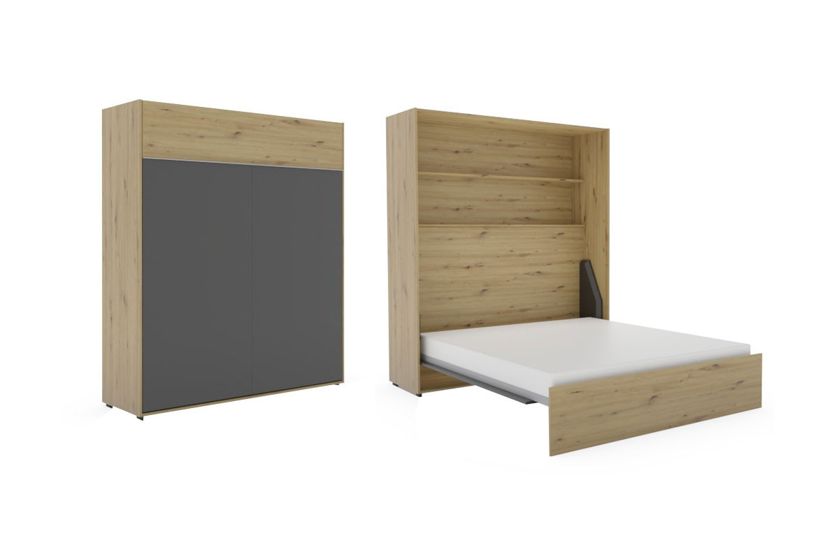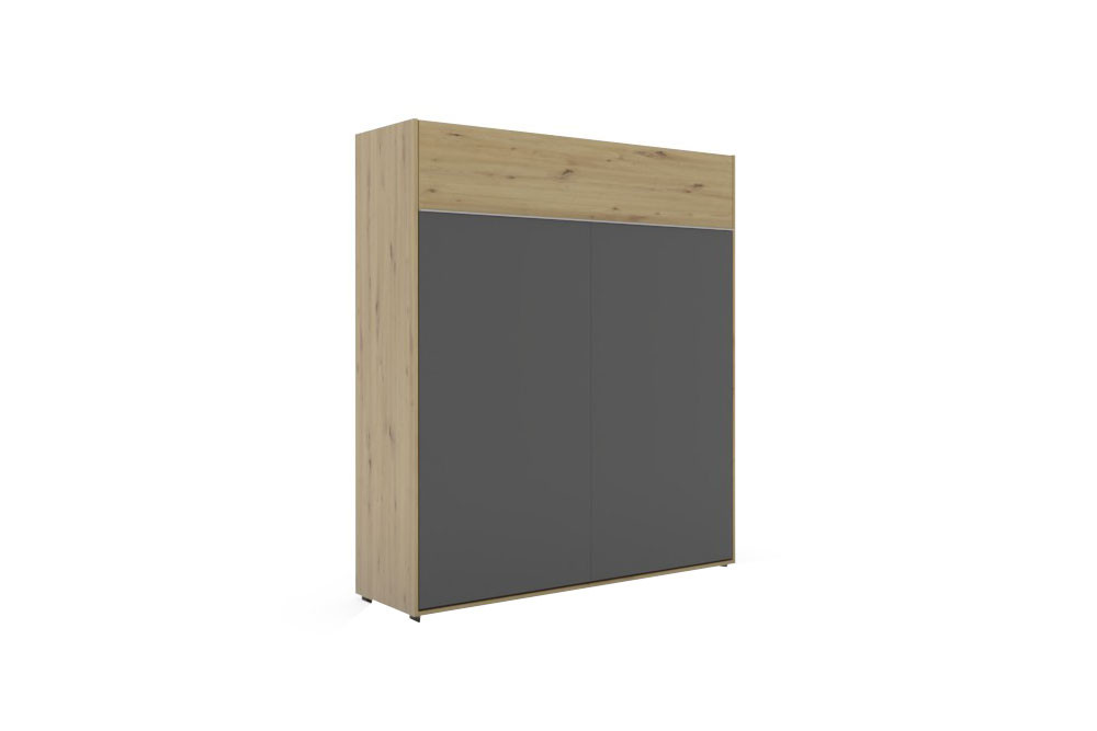 Das etwa 224 cm hohe Schrankklappbett aus dem umfangreichen Einrichtungsprogramm loop des namhaften Möbelherstellers Rudolf verbindet qualitativ hochwertige Verarbeitung, schickes Design und ein hohes Maß an Funktionalität zu einem gemütlichen Wohnbild. Dieses loop Schrankbett wurde als vertikales Raumsparbett entwickelt und fügt sich im geschlossenen Zustand zurückhaltend in den Raum ein. Das Bett wirkt auf den ersten Blick wie ein großer Kleiderschrank - jedoch verwandelt sich dieser bei Bedarf im Handumdrehen in einen komfortablen Schlafbereich. Dem Korpus und der oberen Streifen-Absetzung in natürlich wirkender Artisan-Eiche hat das Möbelstück seine warme Ausstrahlung zu verdanken, während die Front in dunklem Schiefergrau einen modernen und edlen Kontrast zur Holznachbildung bildet. So entsteht durch die verschiedenen Oberflächen ein zeitloses Design, das sowohl in urbane als auch in klassische Einrichtungskonzepte passt. Das Schrankbett loop überzeugt mit weiteren durchdachten Details, die ebenfalls erst beim Öffnen zum Vorschein kommen: In die Rückwand wurden ein geräumiger Bettkasten, der praktischen Stauraum beispielsweise für Decken und Kissen bietet, sowie eine Ablage, die zusätzlichen Platz für persönliche Gegenstände schafft, integriert. Das komfortabel bedienbare Bett ist vertikal aufklappbar und benötigt dann etwa eine Stellfläche von ungefähr 194 x 241 cm. Für optimalen Schlafkomfort sorgt der hochwertige Lattenrost, der aus einem anthrazitfarbenen, pulverbeschichteten Metallrahmen und insgesamt 24 eingelassenen Schichtholz-Federholzleisten besteht. Das Schrankklappbett loop von Rudolf verspricht Ihnen erstklassige Qualität, durchdachte Technik und stilvolles Wohnen mit maximaler Raumeffizienz.