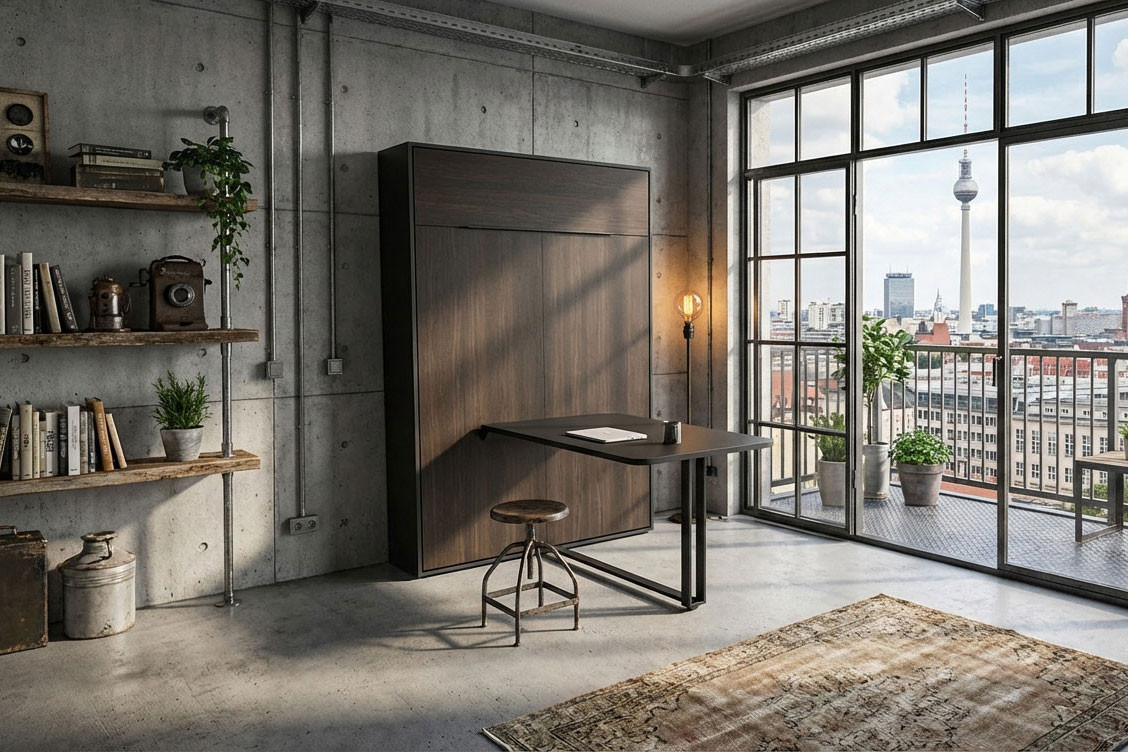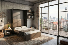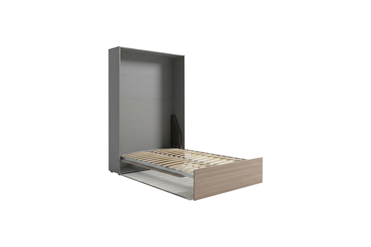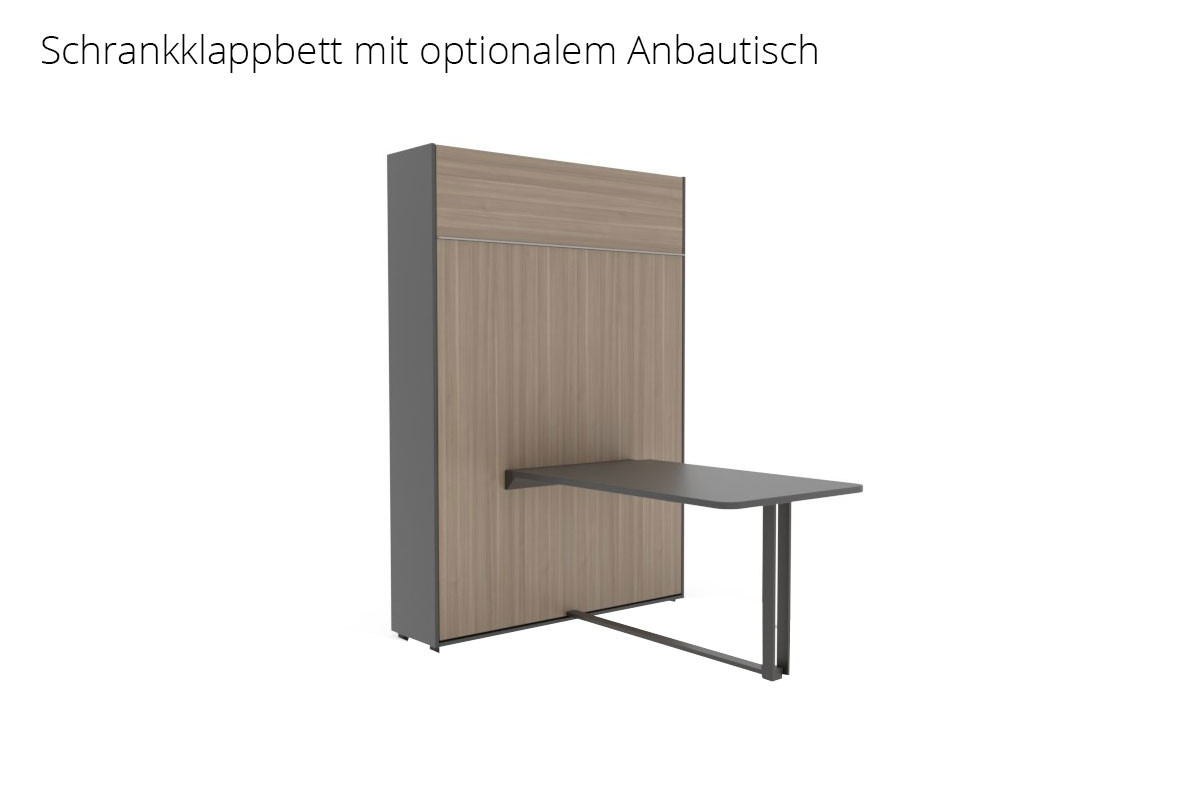 Wenn man in einer 1-Raum-Wohnung Zuhause ist, das Jugend- oder Gästezimmer wohnlich einrichten möchte oder einfach die optimale Nutzung des vorhandenen Wohnraums anstrebt - dann, genau dann ist das loop Schrankbett von Rudolf eine großartige Anschaffung, die mit Qualität, Komfort und einem ansprechenden Design überzeugt. In unserem Angebot schmückt sich das vertikal zu öffnende Schrankklappbett im Hochformat mit einem dunklen Korpus in Vulkangrau und einer dekorativen Front mit einer Nussbaum natur Nachbildung. So sieht das bequeme Raumsparbett, das eine Liegeflächengröße von 140 x 200 cm hat, auf den ersten Blick aus, wie ein schicker Kleiderschrank. Das gemütliche Bett kommt zum Vorschein, wenn Sie die Schrankfront nach unten klappen - das Hoch- und Herunterklappen der Schlaffläche ist mühelos möglich. Dieses Klappbett enthält bereits einen Metallrahmen mit integrierten Federholzleisten, deshalb benötigen Sie nur noch eine Matratze, um dieses Schrankbett in vollen Zügen genießen zu können. Falls Sie praktische Details, wie beispielsweise ein lauschiges Rückenpolster zum Anlehnen und/ oder eine dezente Ambiente-Innenbeleuchtung, zum Angebot hinzufügen möchten, können Sie diese Zubuchungen über unsere Zusatzoptionen vornehmen. Auch der Anbautisch mit dem anthrazit-farbenen Gestell und einer etwa 135 x 84 cm goßen Arbeitsplatte kann über diese Auswahlmöglichkeiten in der gewünschten Ausführung zum Angebot hinzugefügt werden. Wenn sich dieses loop Smartbett von Rudolf mit all seinen unverkennbaren Vorteilen in Ihr Herz geschlichen hat, zögern Sie nicht und gönnen Sie sich diesen gediegenen Luxus.